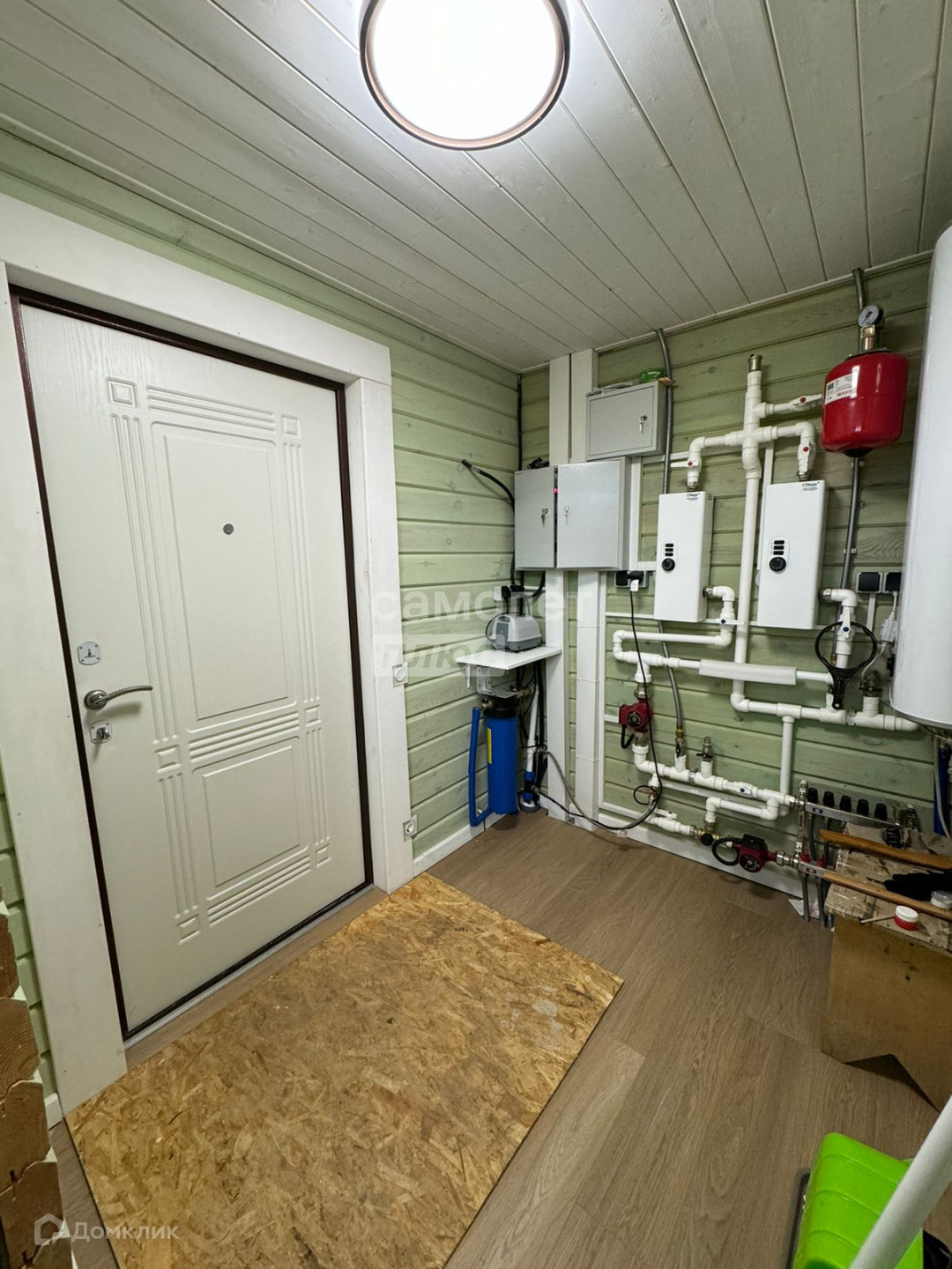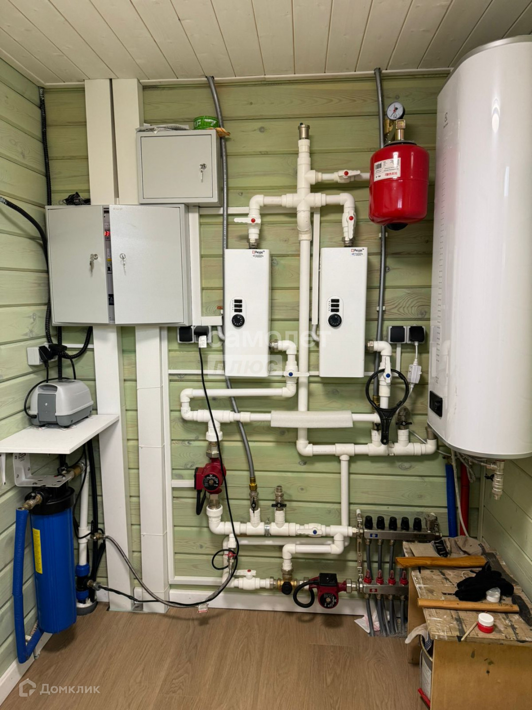 - Водопровод: скважина 57 м, забор воды с 37 м., насос Беламос. 0.85, смонтирован кессон глубина 2,2 метра, установлено необходимо оборудование водоподготовки, заведена в дом, в бойлерной установлен один фильтр грубой очистки, имеется возможность организовать очистную станцию, смонтирован подогрев вводной трубы.
