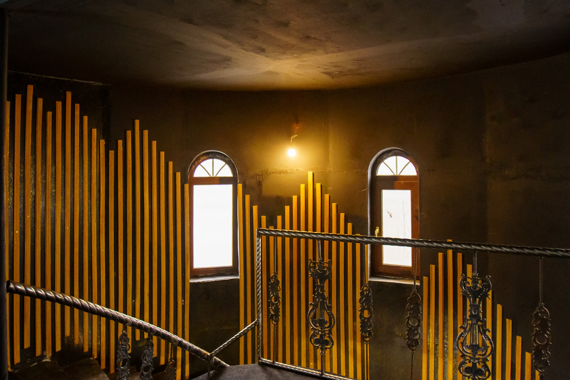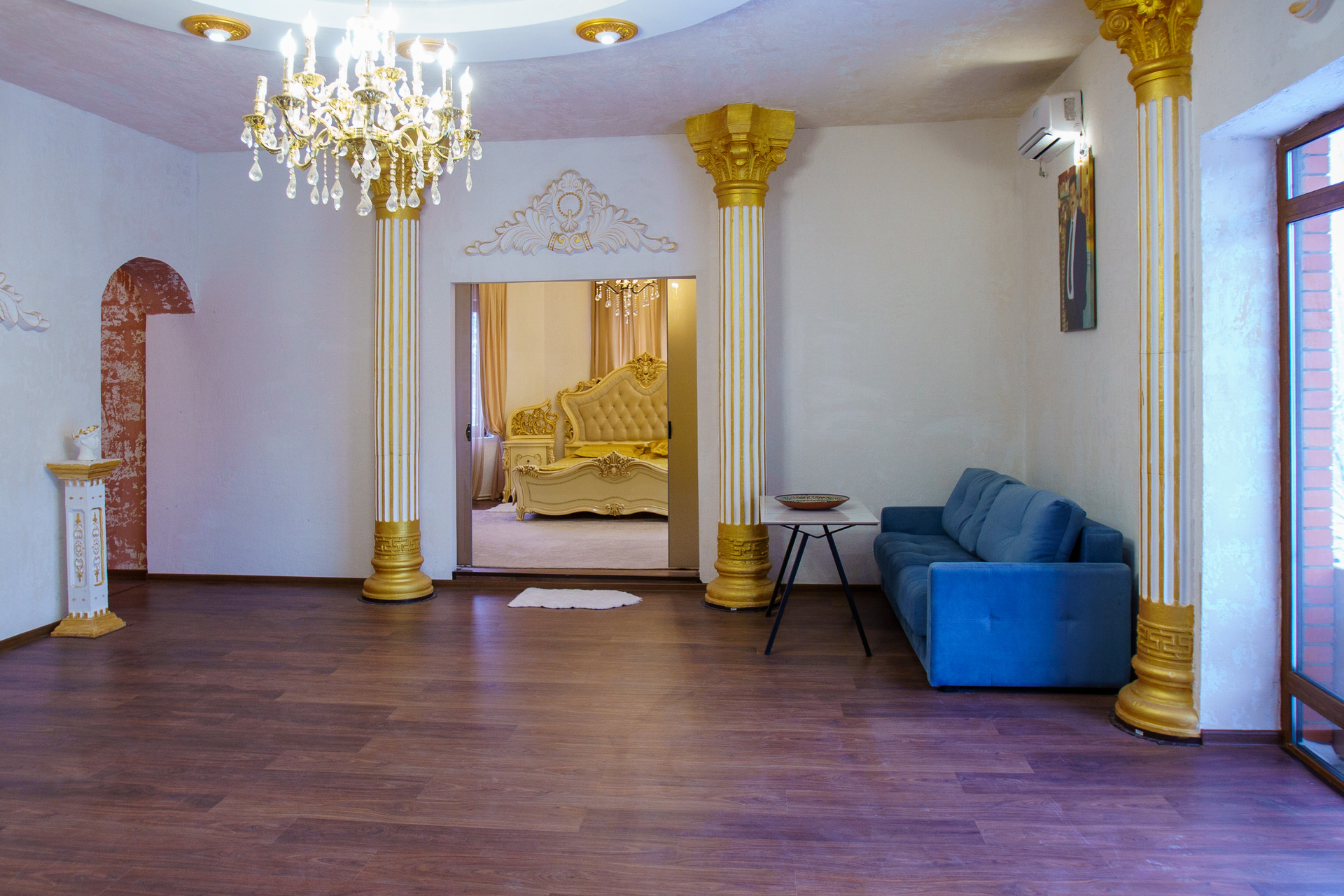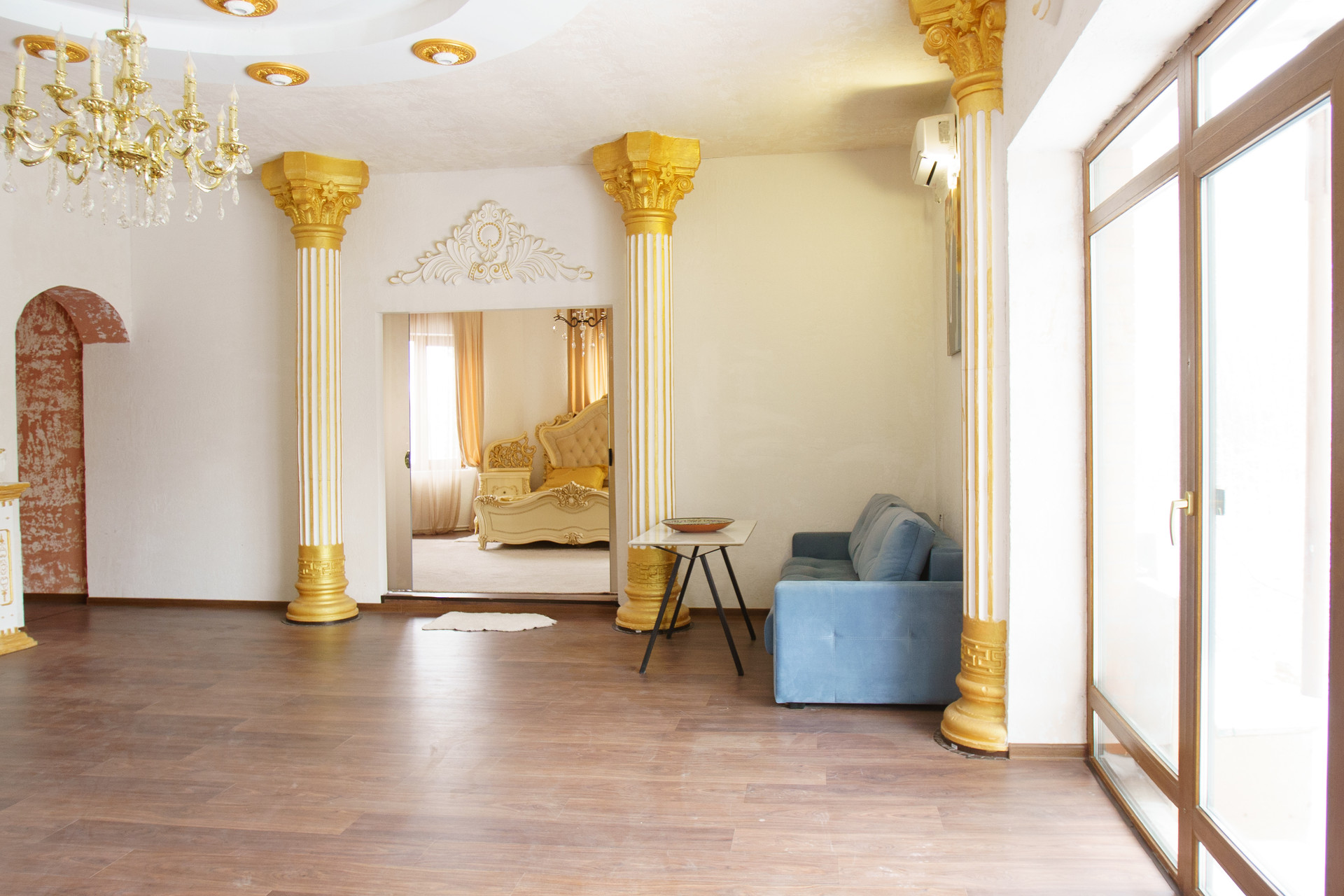 Дом состоит из шести спален,кухни, трёх санузлов и котельной, просторной гостинной: колоны вылиты бетонной смесью с использованием арматуры ,  внешний дизайн колонн -ручная работа ,лепнина на стенах, так же рамки .