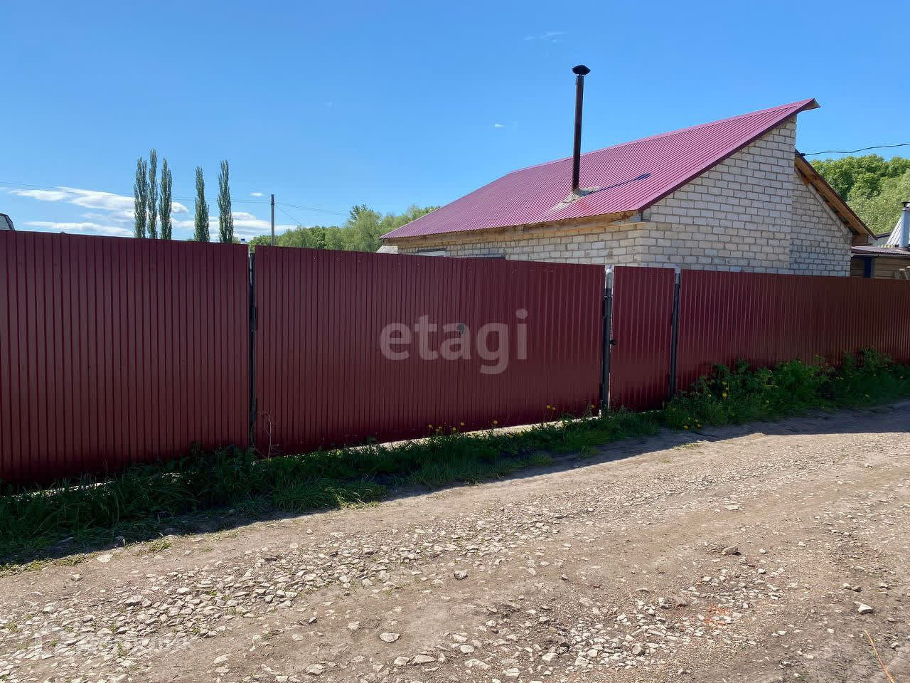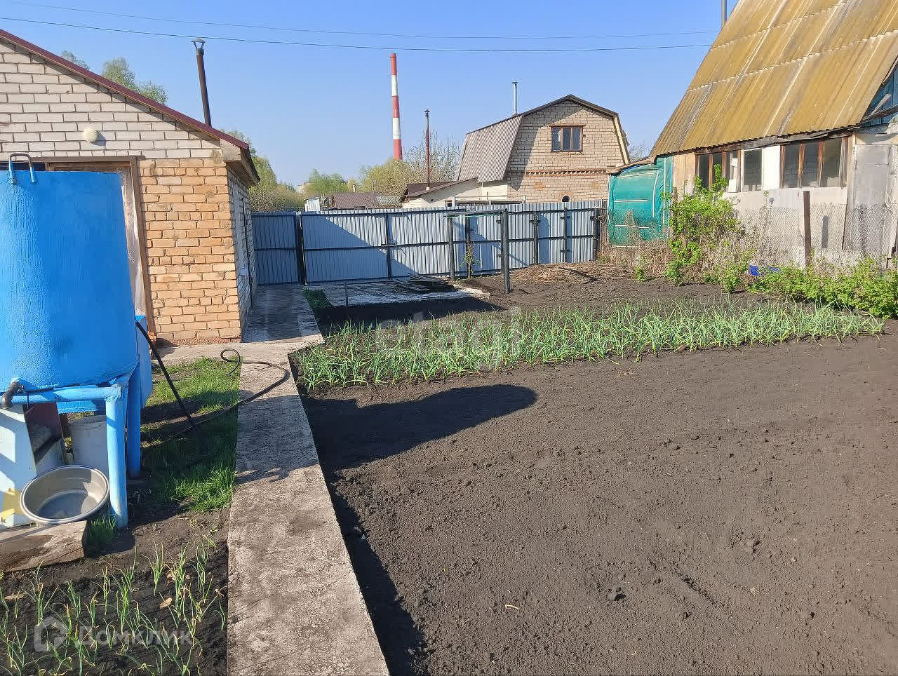 Передняя часть ограждена забором из профнастила, есть калитка для входа и отдельно ворота для въезда автомобиля.