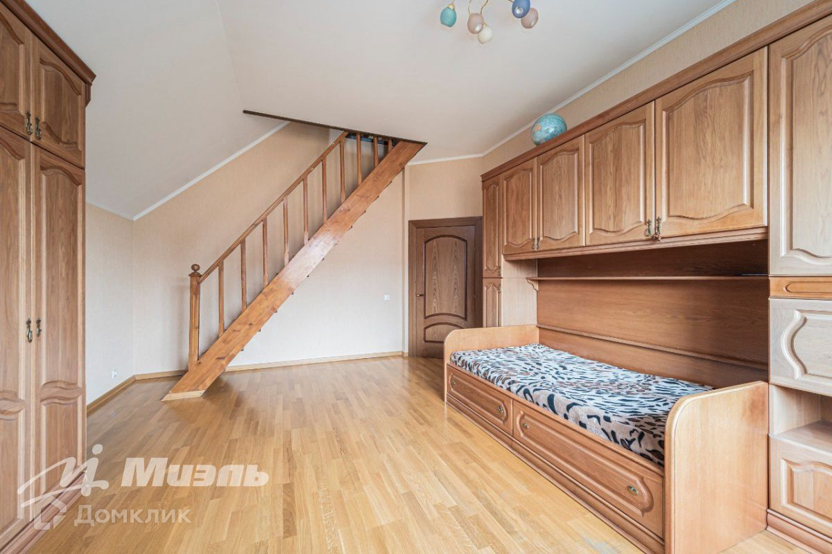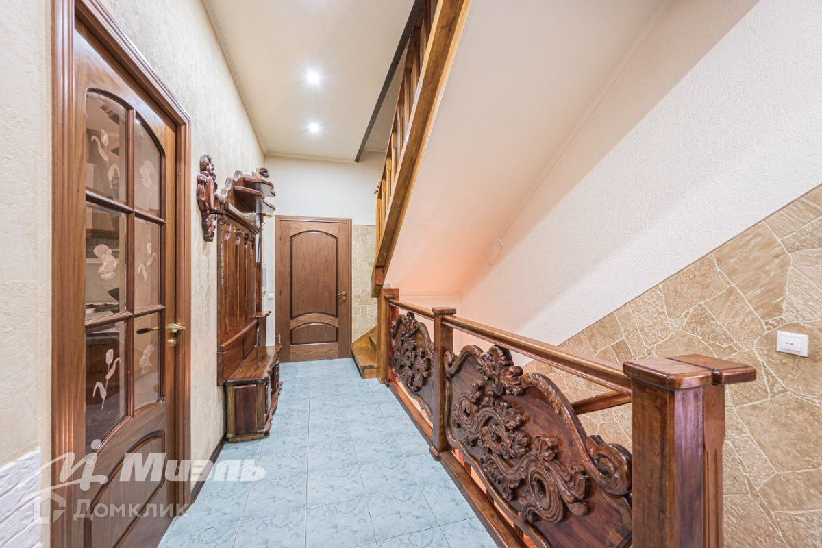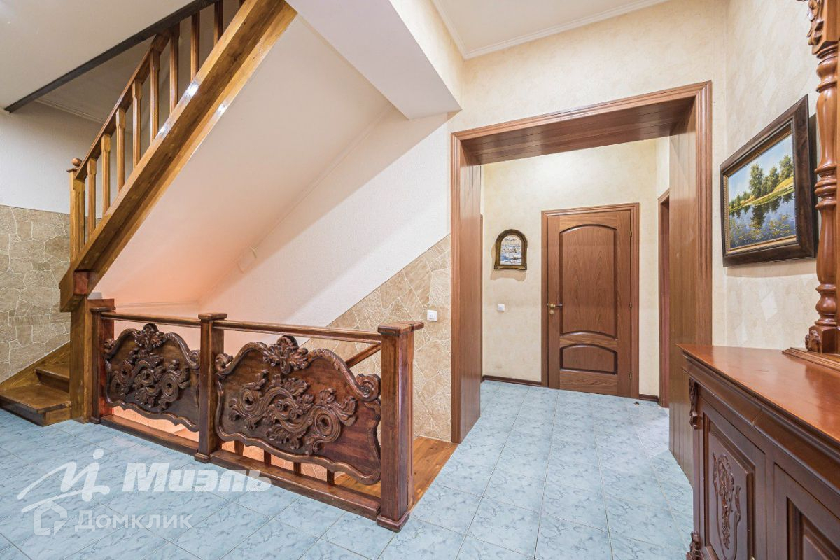 Большое количество дерева в отделке и обстановке. Лестница из массива дерева, напольное покрытие - паркетная доска.