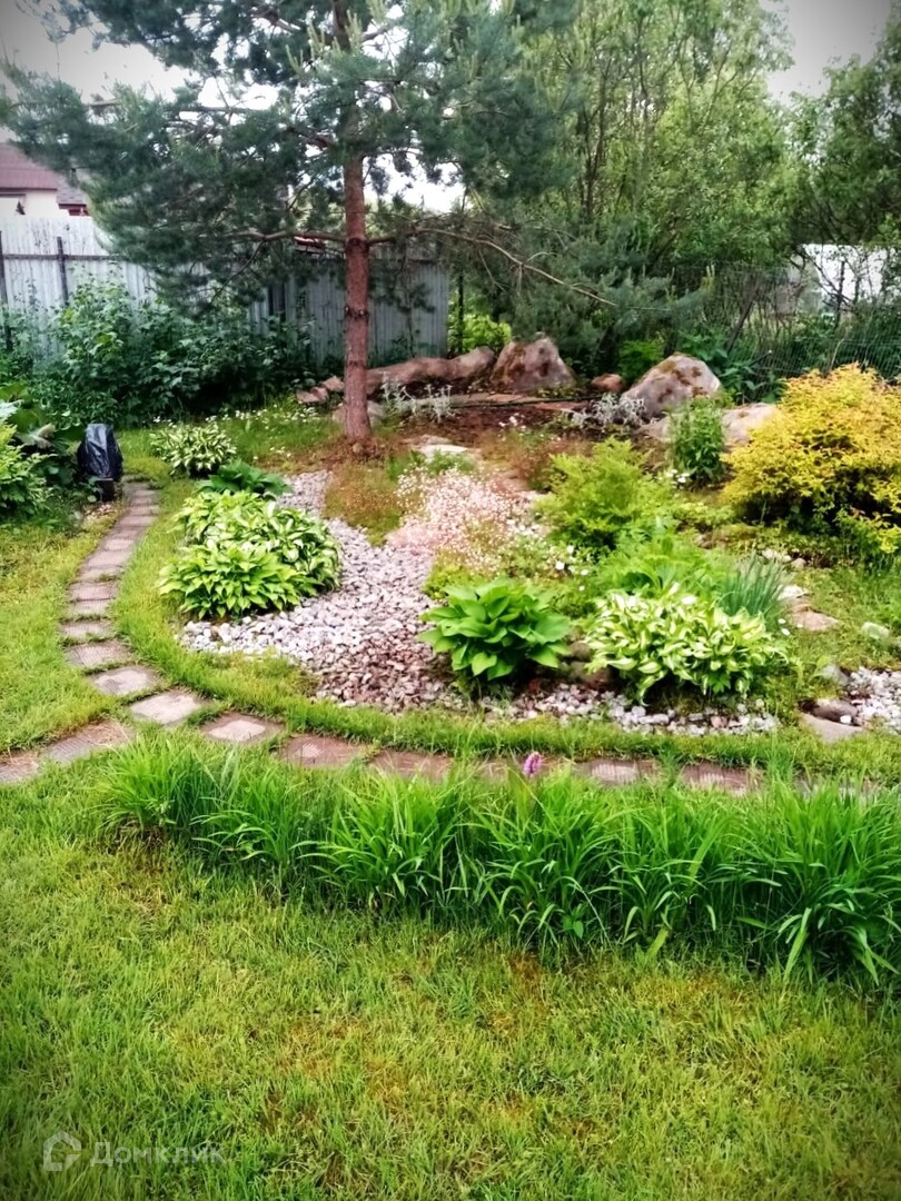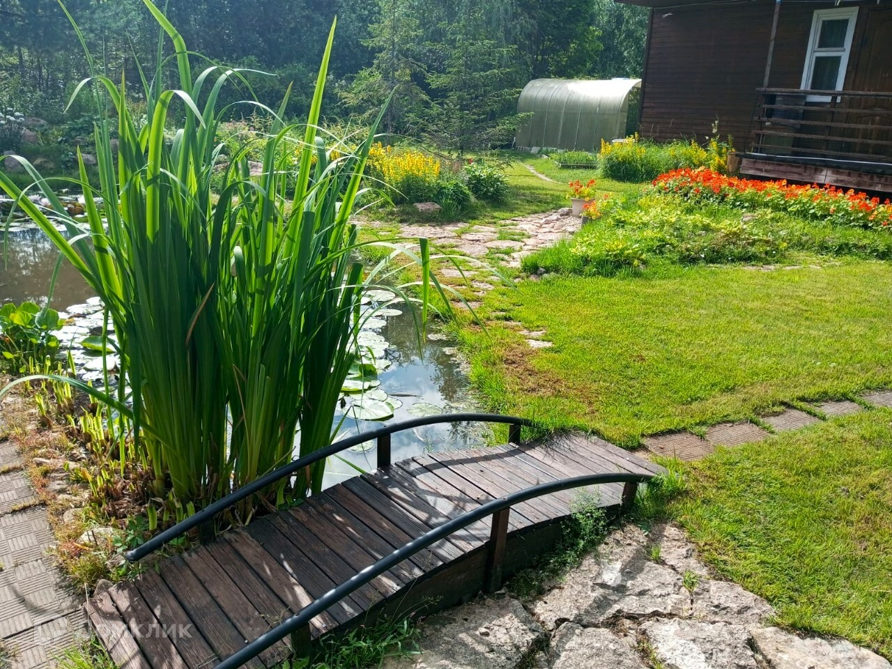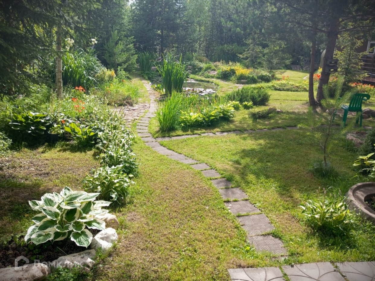 На участке выполнен живописный ландшафтный дизайн, пруд с лилиями и карасями, все в цветах, несколько альпинариев, розарий, посажен фруктовый сад, ягодные кустарники и декоративные деревья, есть небольшая теплица. Перед домом два открытых парковочных места для авто, выложенные плиткой.