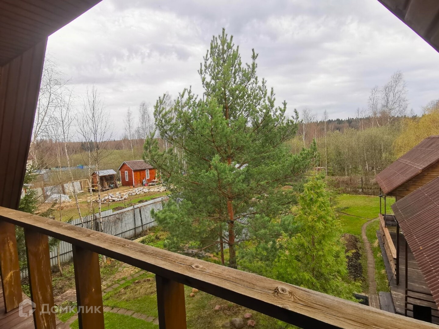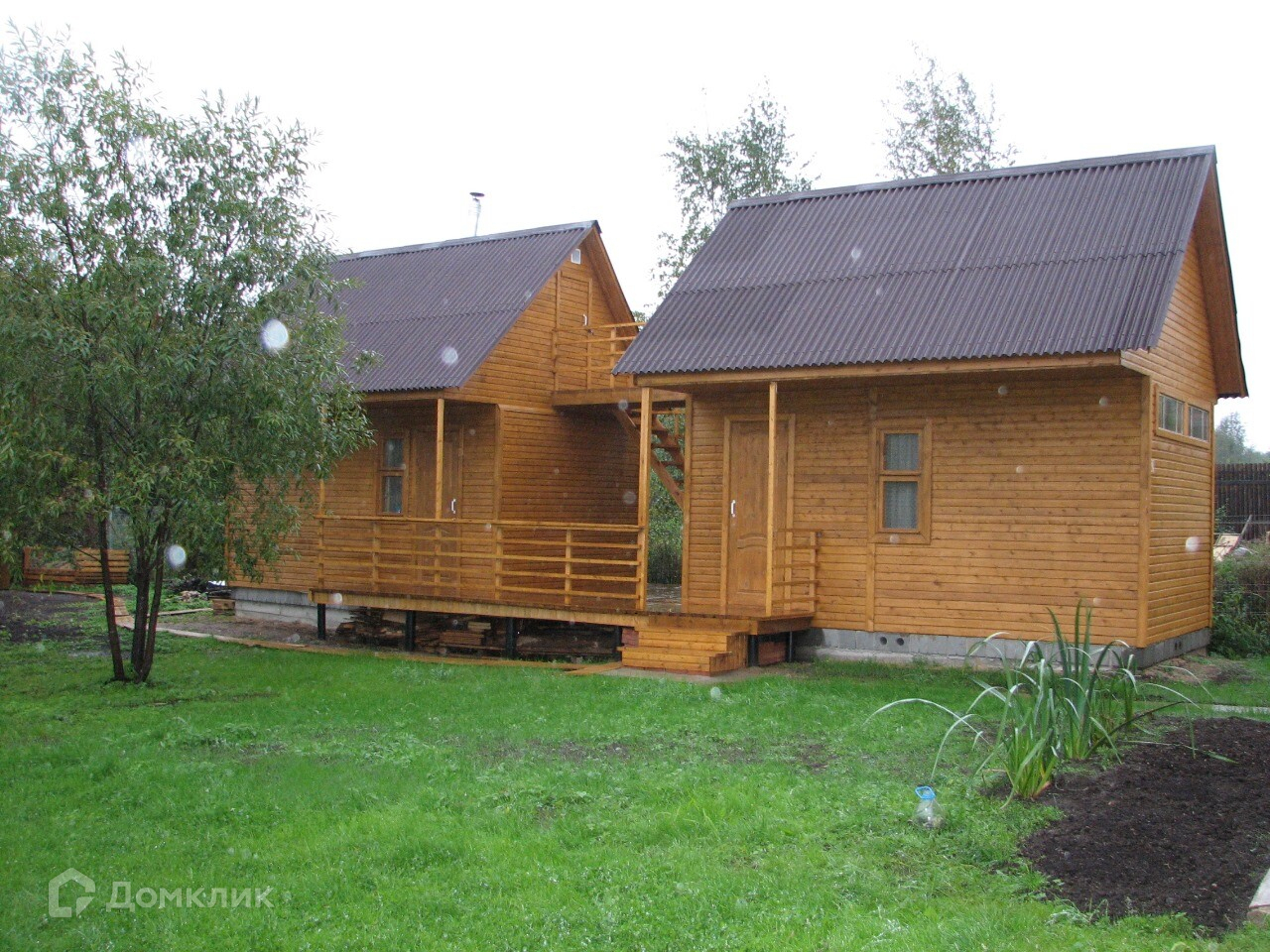 На участке есть баня и хоз. блок, симметрично построенные в одном стиле и объединенные общей палубой, с лестницей на чердаки обоих помещений. Деревянная баня площадью 13.5 кв.м с печкой-каменкой и хозблок 13.5 кв.м.