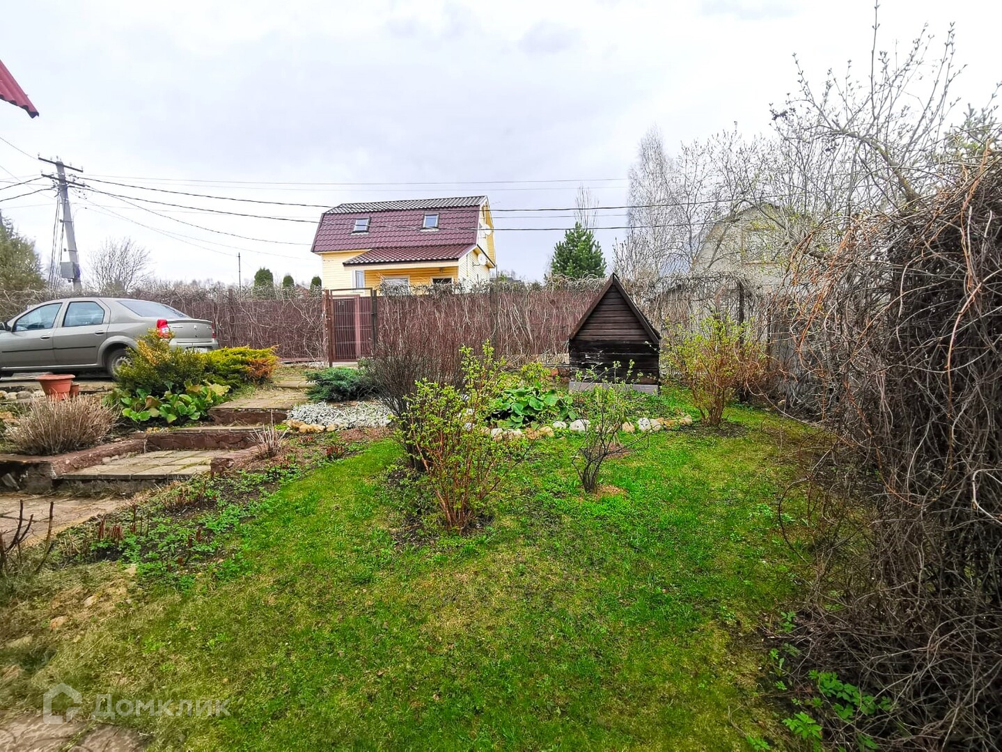 Периметр огорожен сеткой-рабицей, увитой девичьим виноградом.