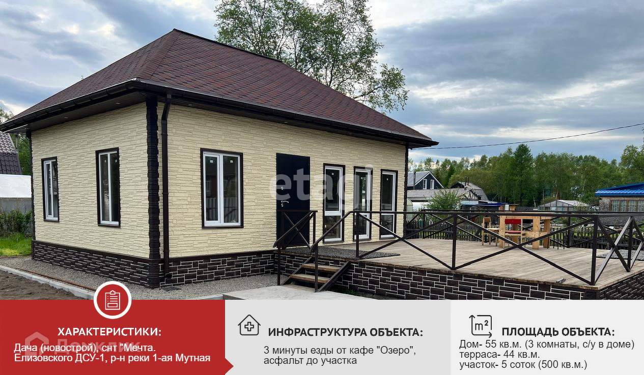 Предлагается к продаже дача в СНТ с романтичным названием «Мечта», район 5 стройки, в трех минутах езды от ресторана «Озеро», на земельном участке 5 соток, с новым домом площадью 55 кв.м. и прилегающей к нему открытой террасой площадью 44 кв.м. Деревянный дом построен из лиственницы по технологии каркасного строительства, утеплен минерал-ватным утеплителем, снаружи отделан качественными атмосферостойкими кровельными и фасадными материалами. Планировка дома состоит из трех комнат и совмещенного санузла с душевой кабиной, оборудованный водонагревателем. Участок с лицевой стороны отгорожен новым забором на ленточном фундаменте из евроштакетника, с калиткой и откатными воротами.