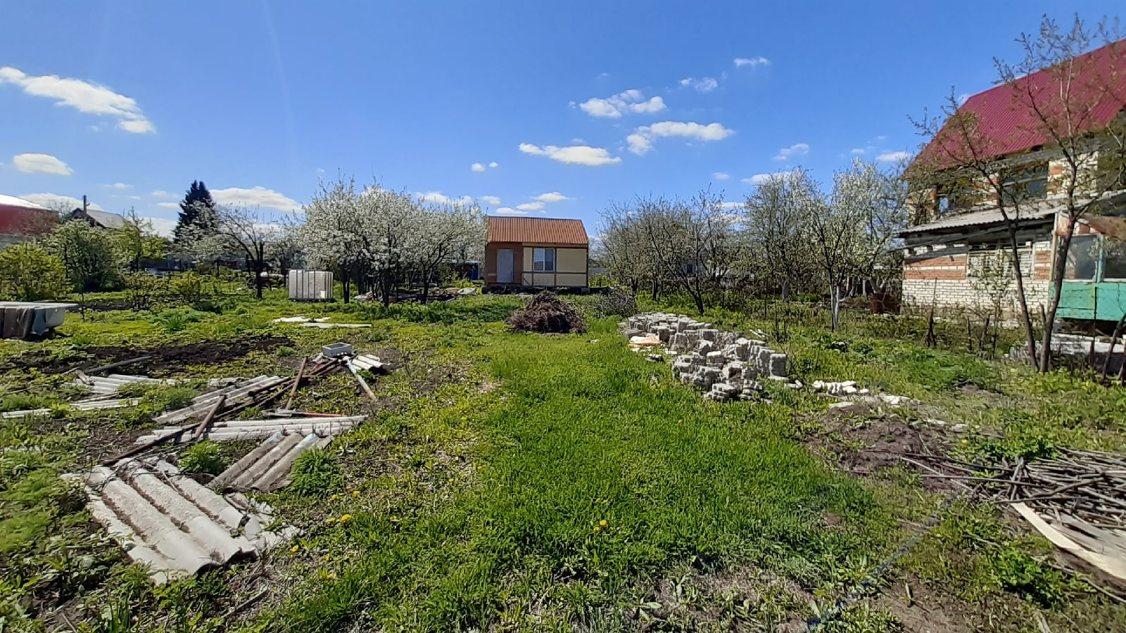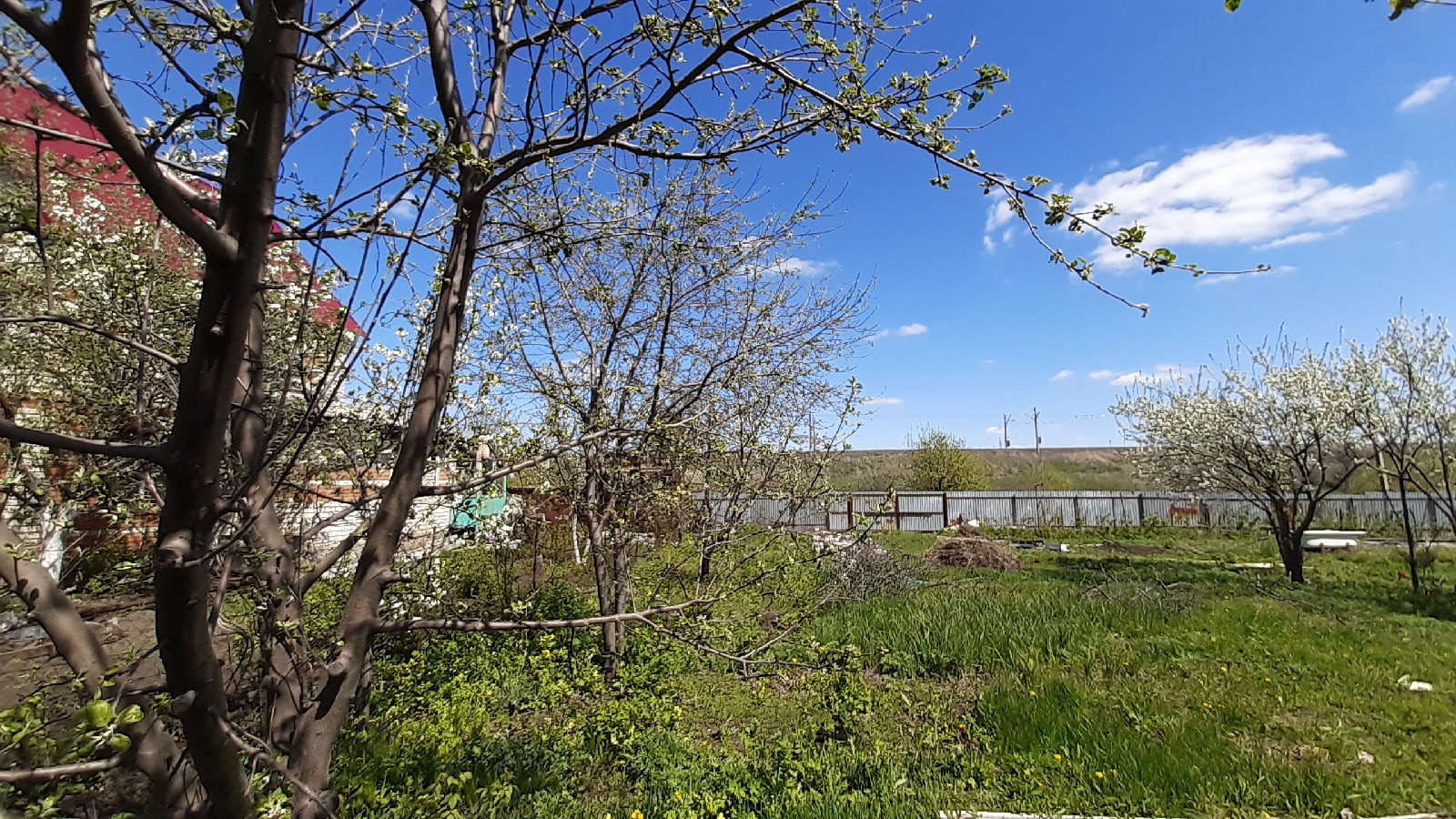 Забор от дороги- металлопрофильный, от соседей-сетка рабица. Есть возможность самозахвата земли рядом, около 10 соток с яблонями, грушей и вишней.