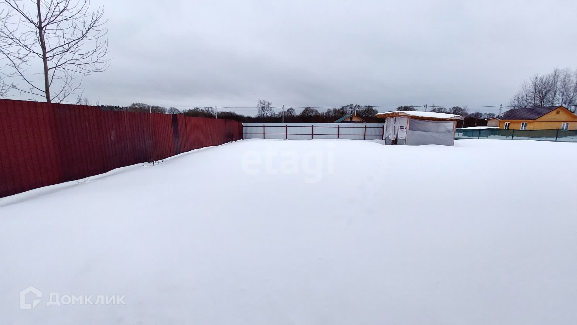 Участок обработан, посеян газон. Перед домом оборудована бетонная автомобильная площадка. Участок огорожен забором из профлиста.