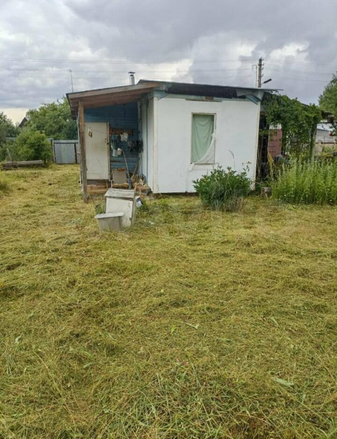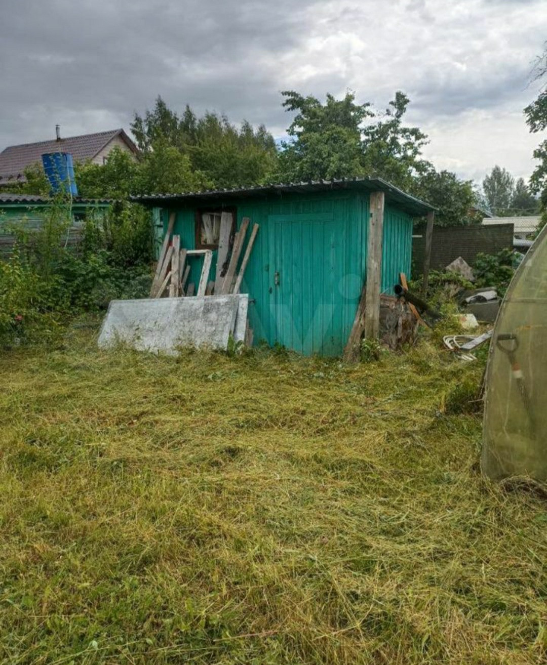 На участке есть домик из бытовки с верандой, два сарая, теплица, много плодовых деревьев и кустов. Один собственник, быстрый выход на сделку.