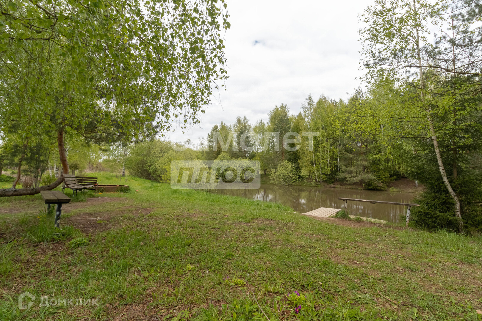 в 100 метрах от участка место для отдыха у воды со скамейками и детской площадкой.