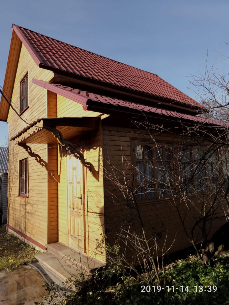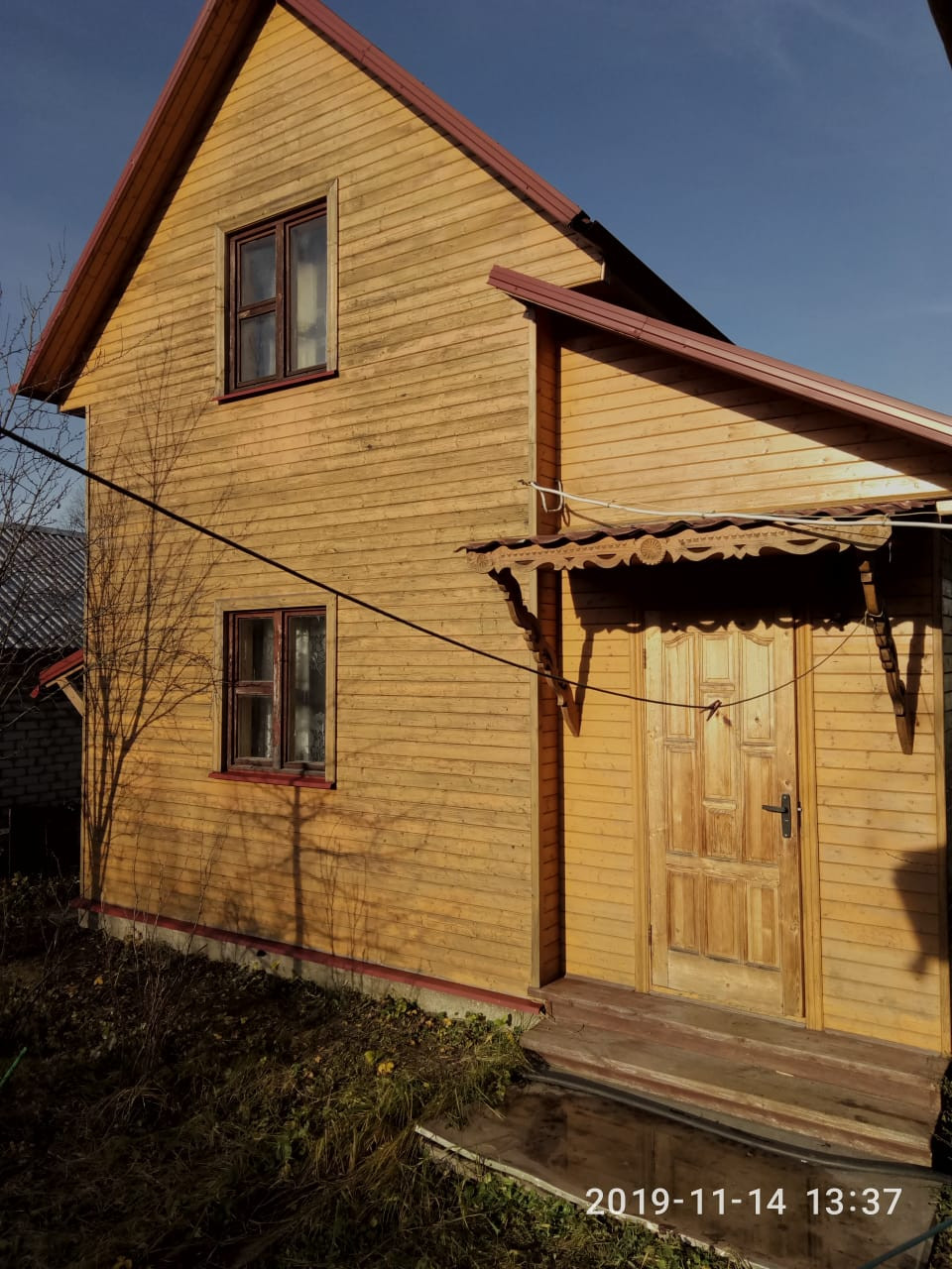 +и Дом из дерева, с сауной, 2 этажа, брус, утепление с двух сторон: утеплителем + вагонка, можно жить круглый год или использовать как гостевой домик,58 кв м с летней кухней-верандой. Дровник. Отопление печь +электроконвекторы.