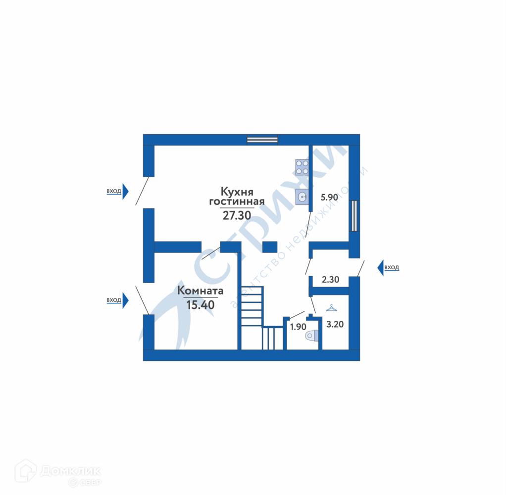 1 этаж: кухня-гостиная 27,3 кв.м., комната 15 кв.м., гардеробная 3,2 кв.м., сан.узел 1,9 кв.м., котельная.