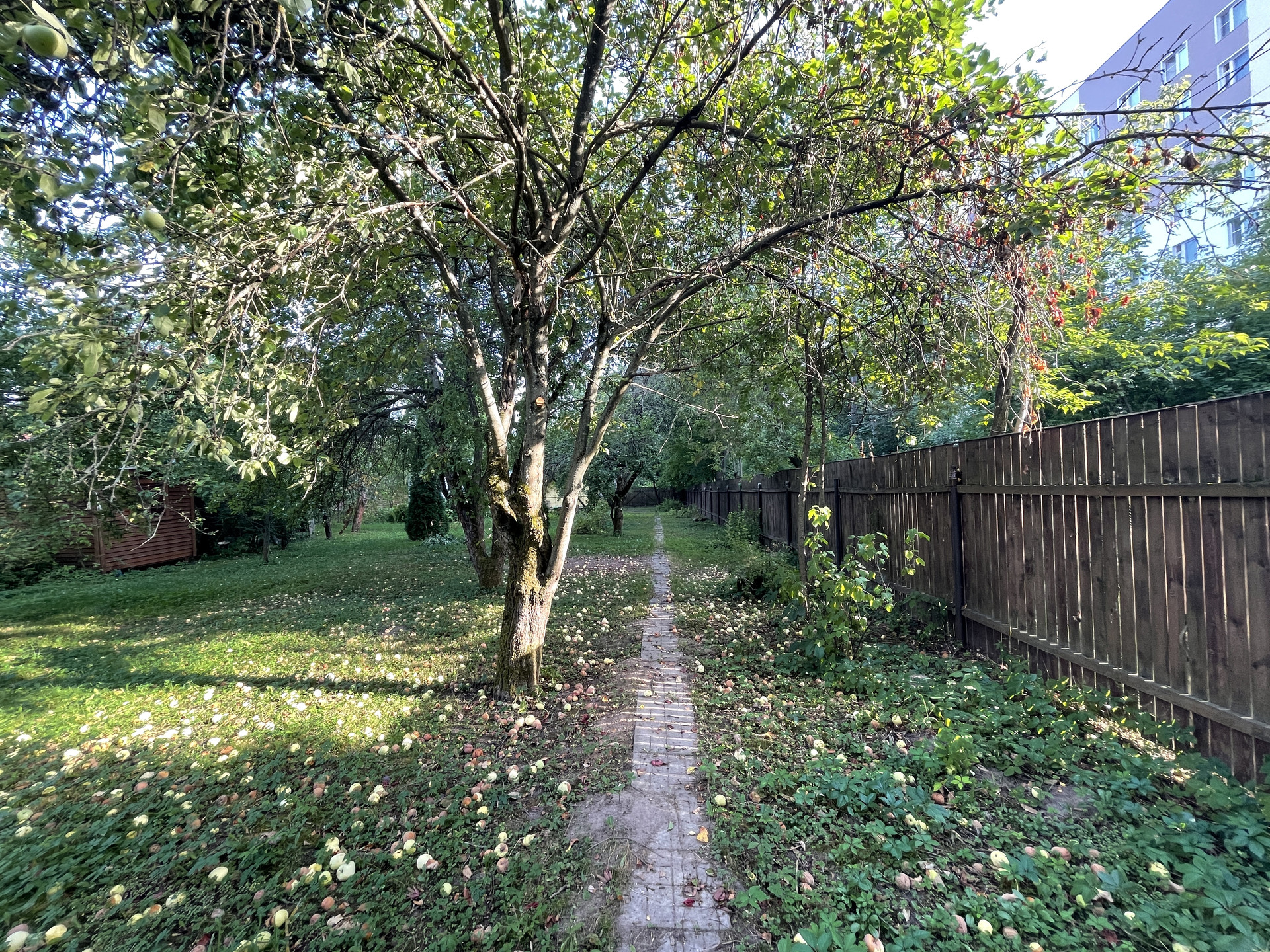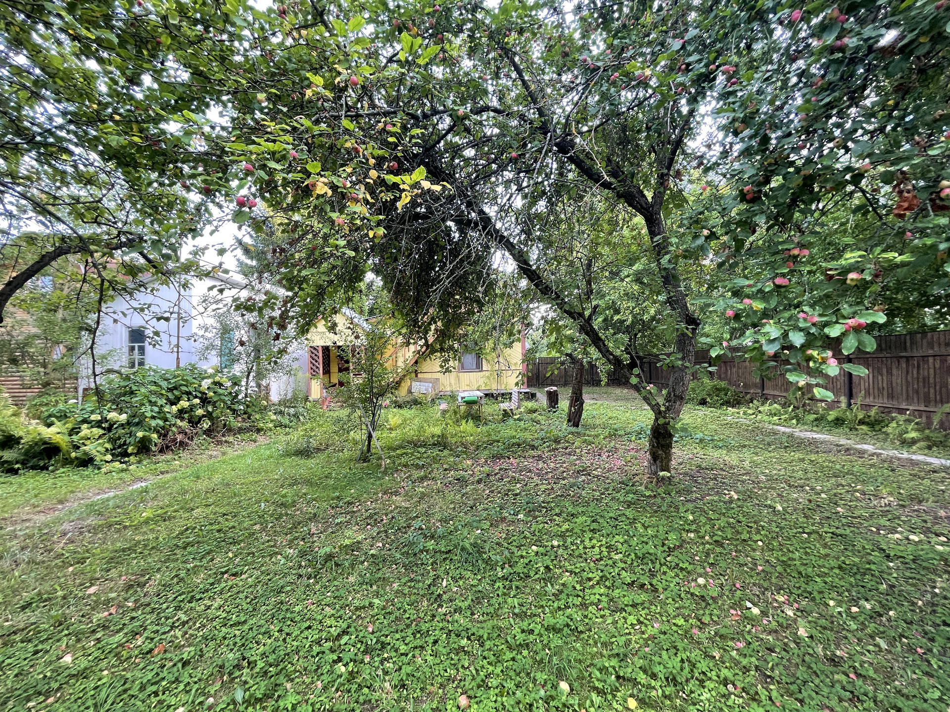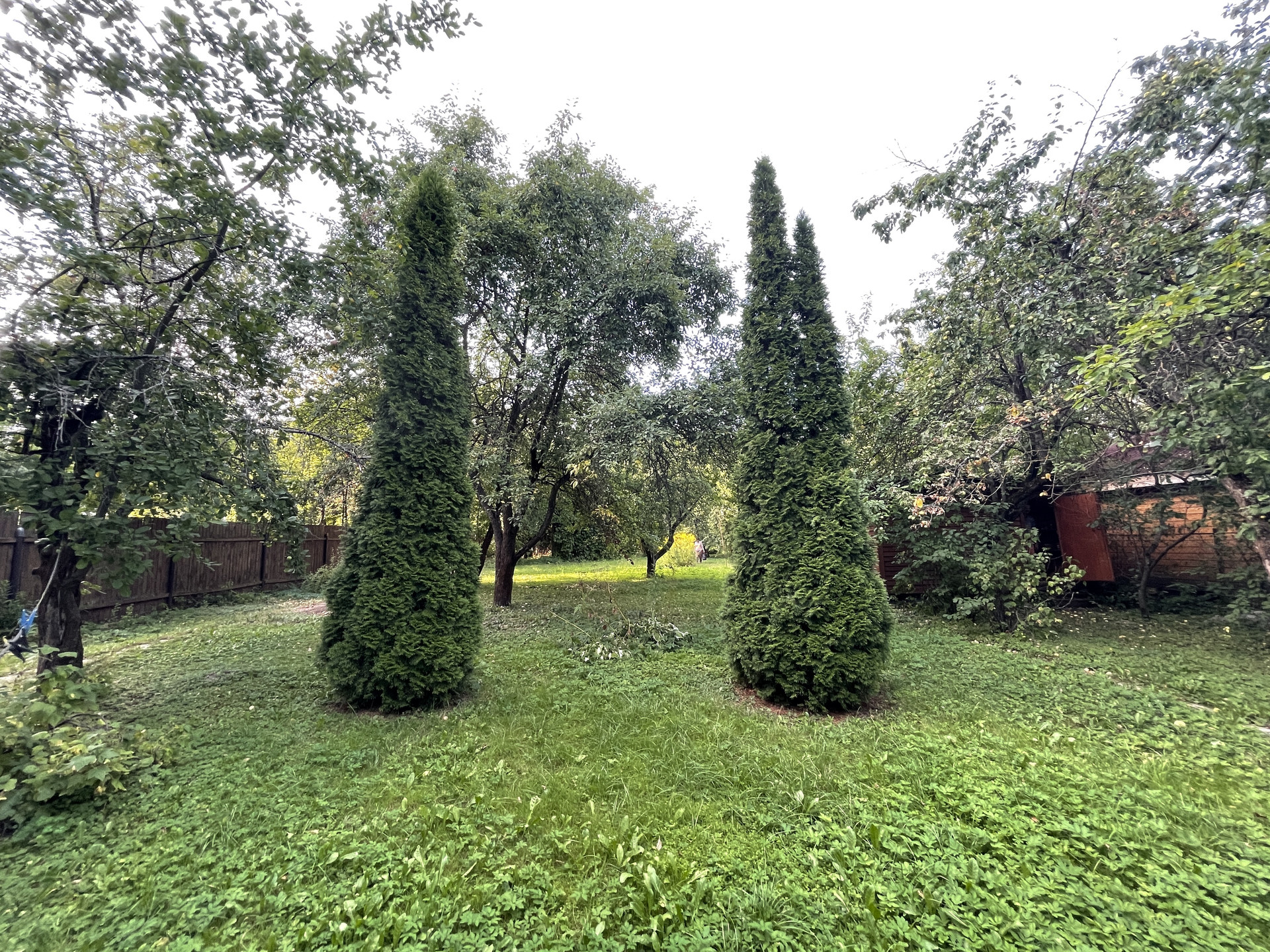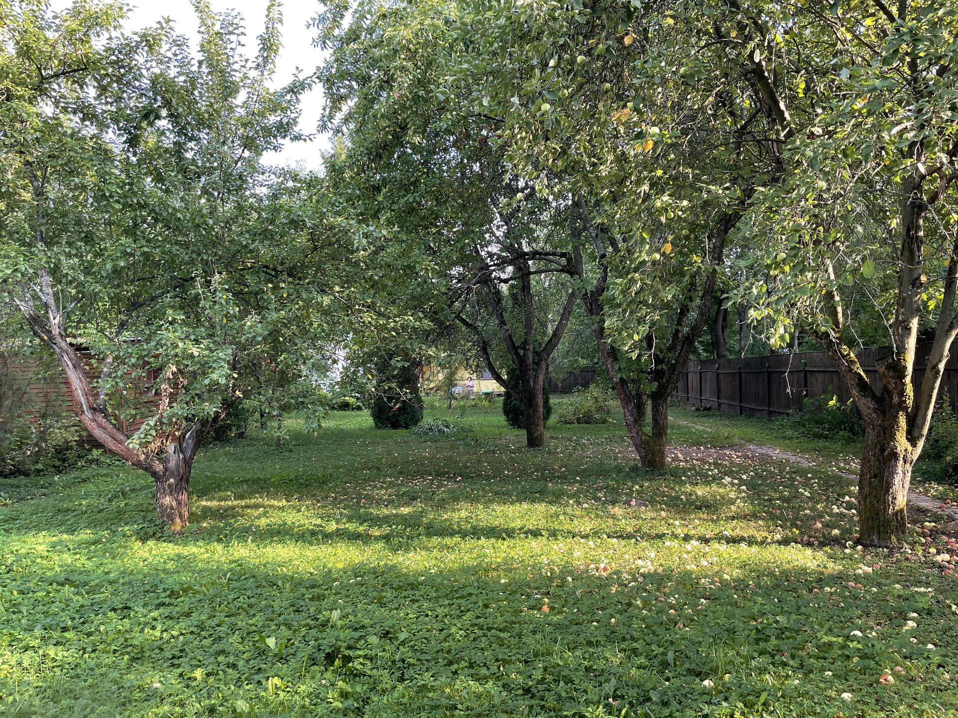 На участке растут яблони, липы, туи, кустарники.