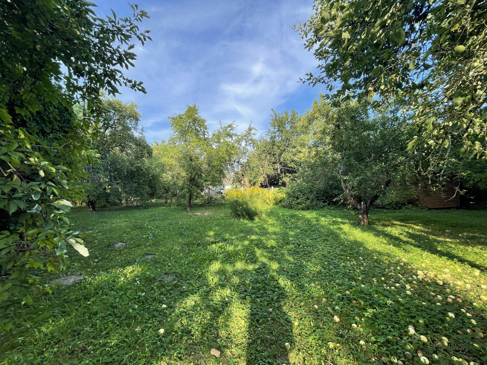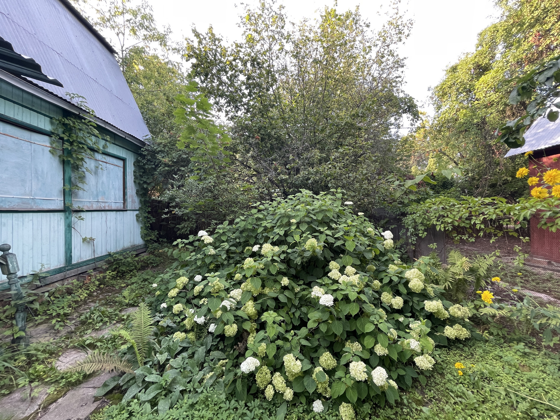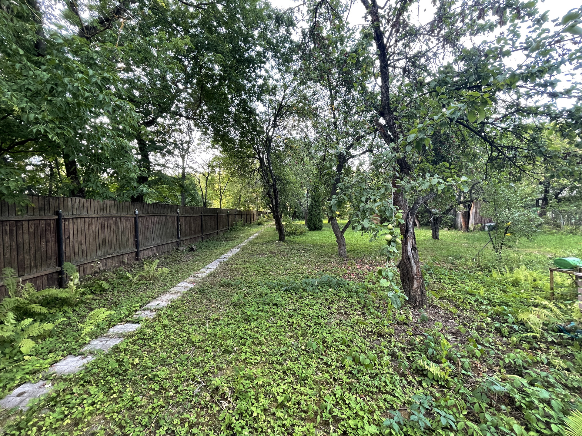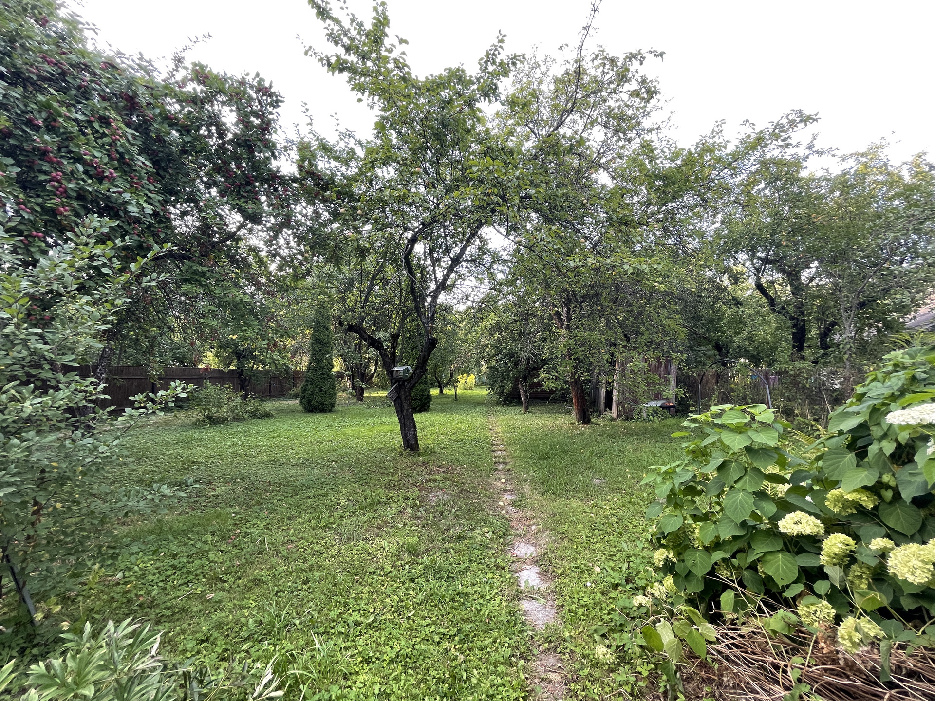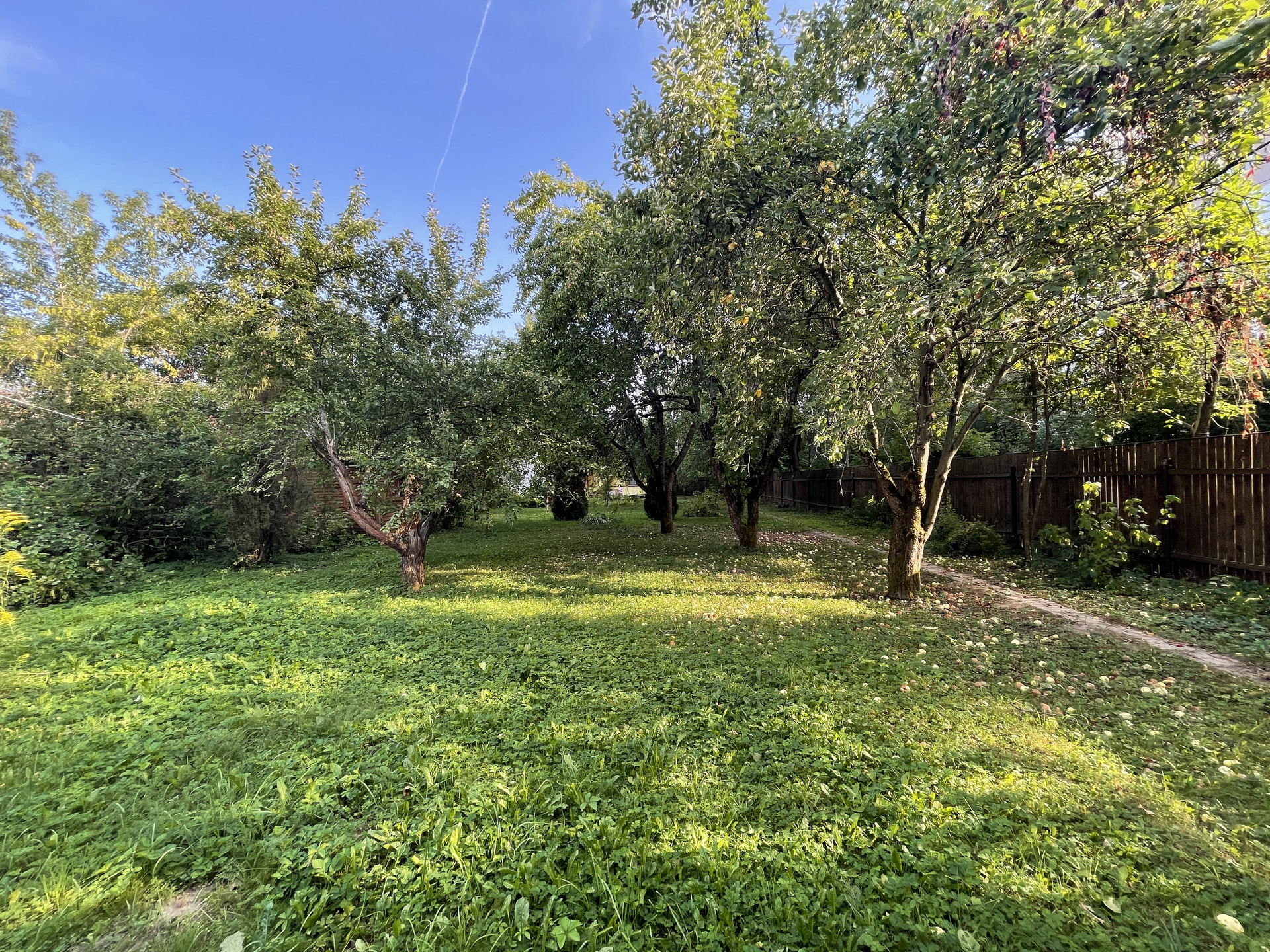 На участке растут яблони, липы, туи, кустарники.