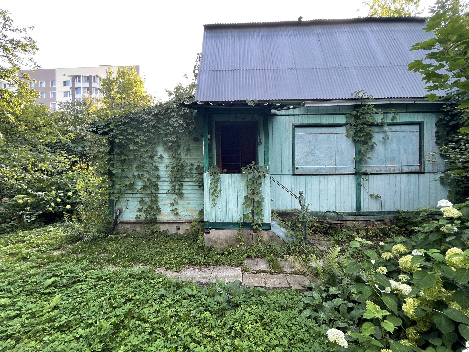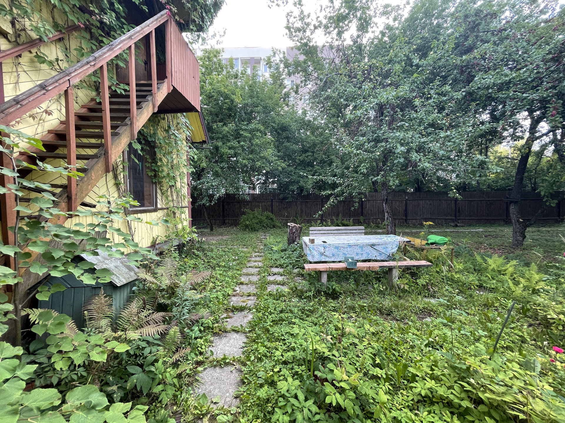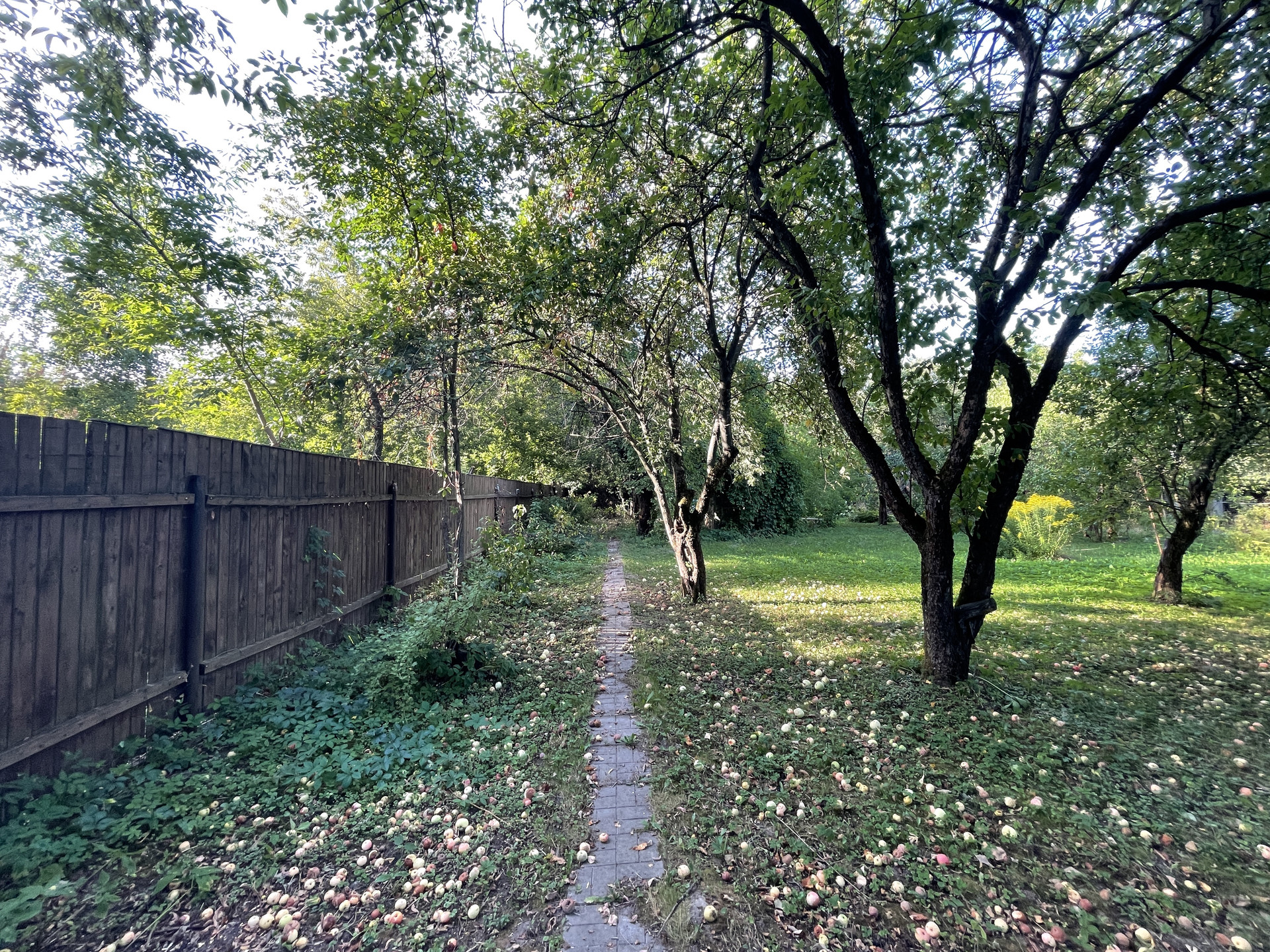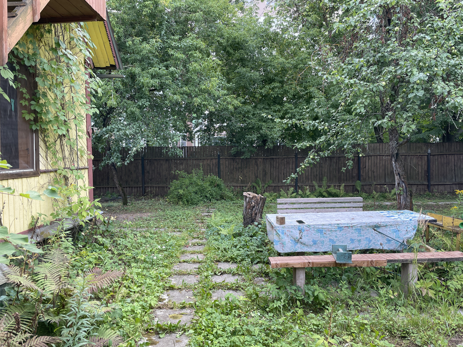 На участке растут яблони, липы, туи, кустарники.