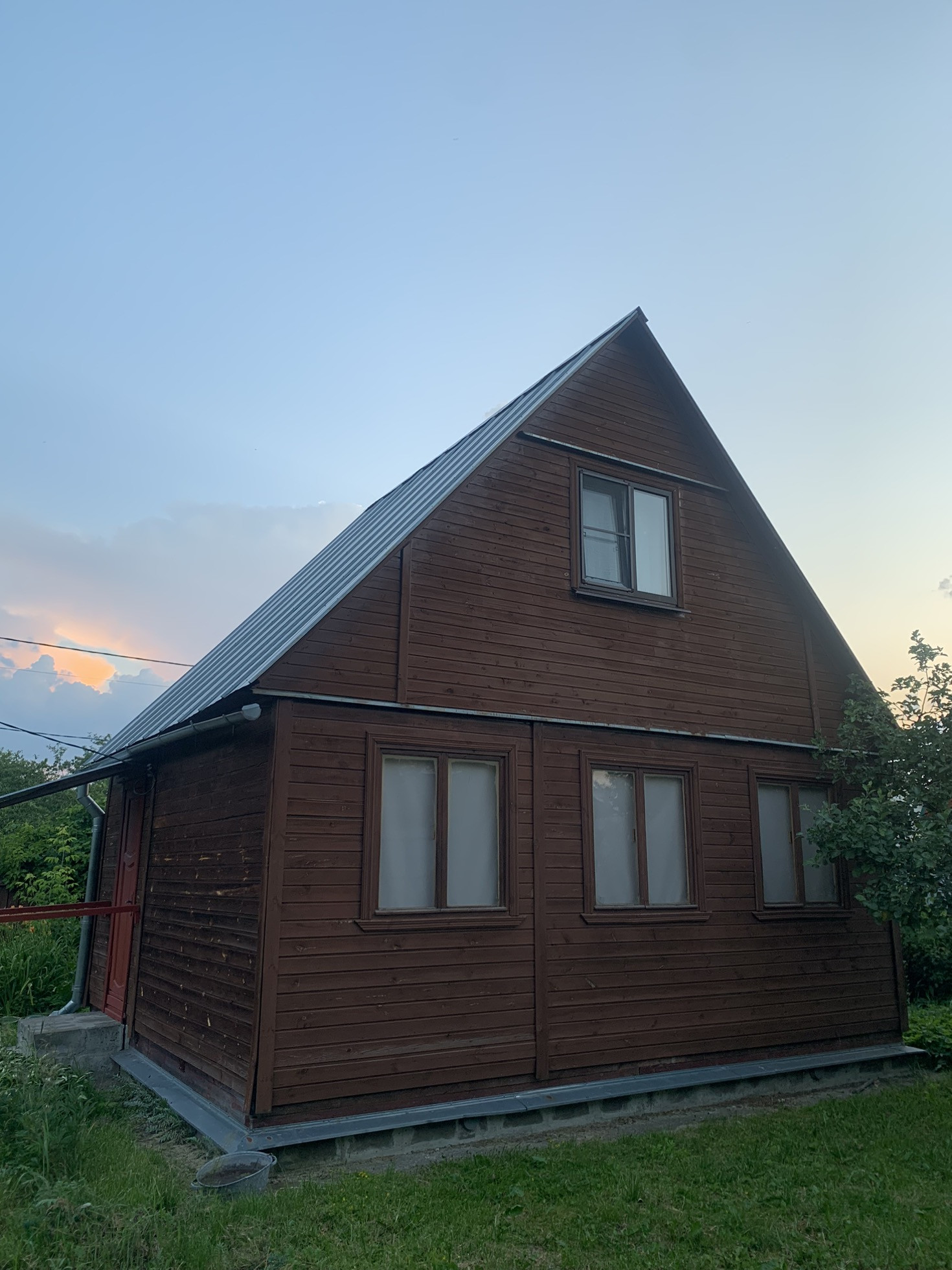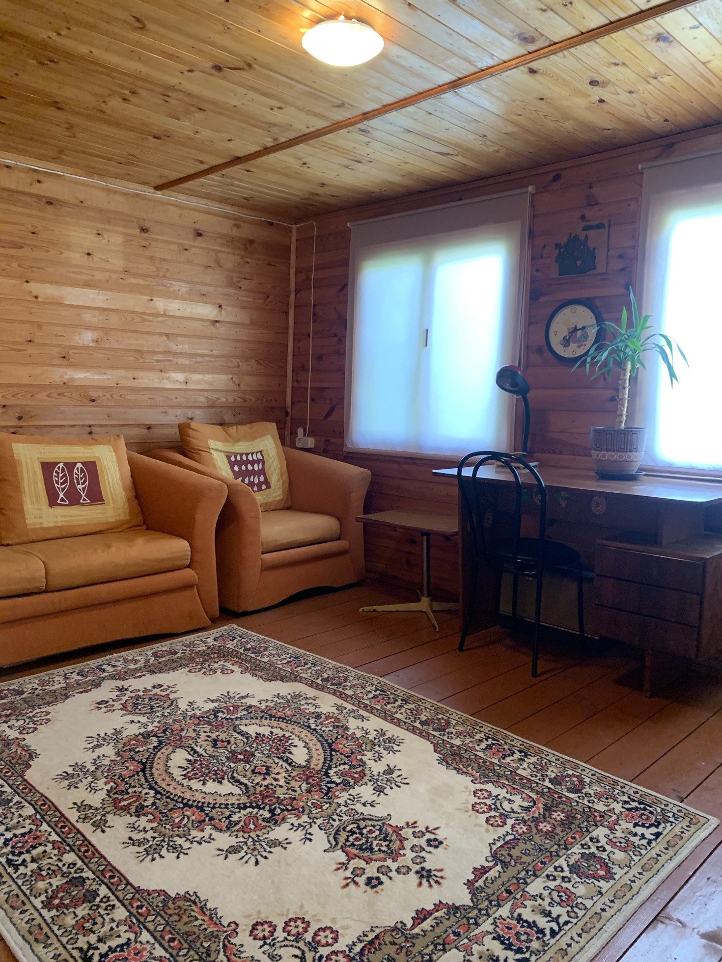 Первый -дом 45 м2  -2 х этажный с лестницей на первом этаже кладовая, спальня с кроватью, гостиная с диваном и креслом, комод, стол, стулья, на втором этаже большая спальня с 2мя кроватями тут установлены 2 пластиковых окна. Остальные везде деревянные. Дом изнутри отделан деревом в отличном состоянии.