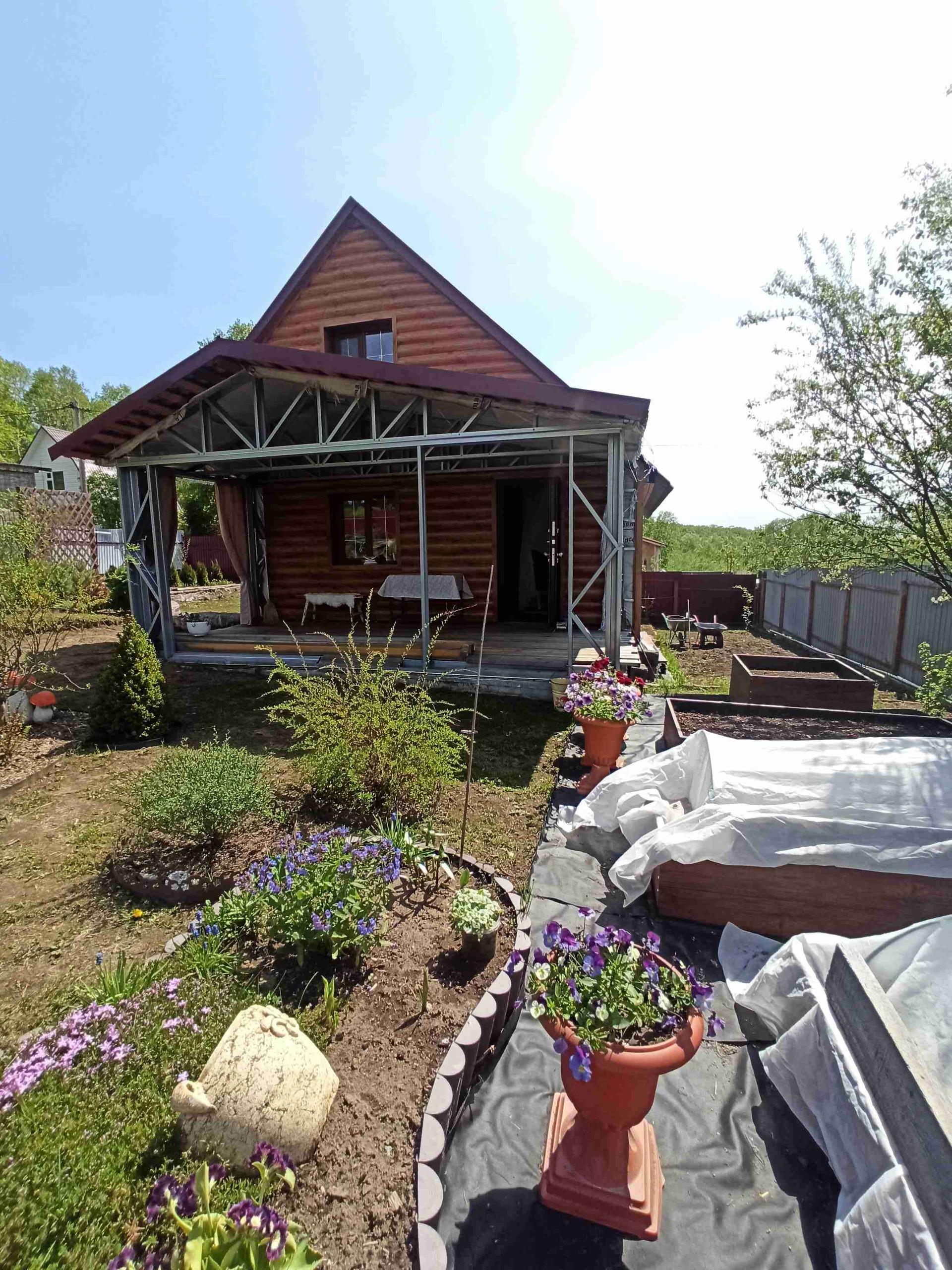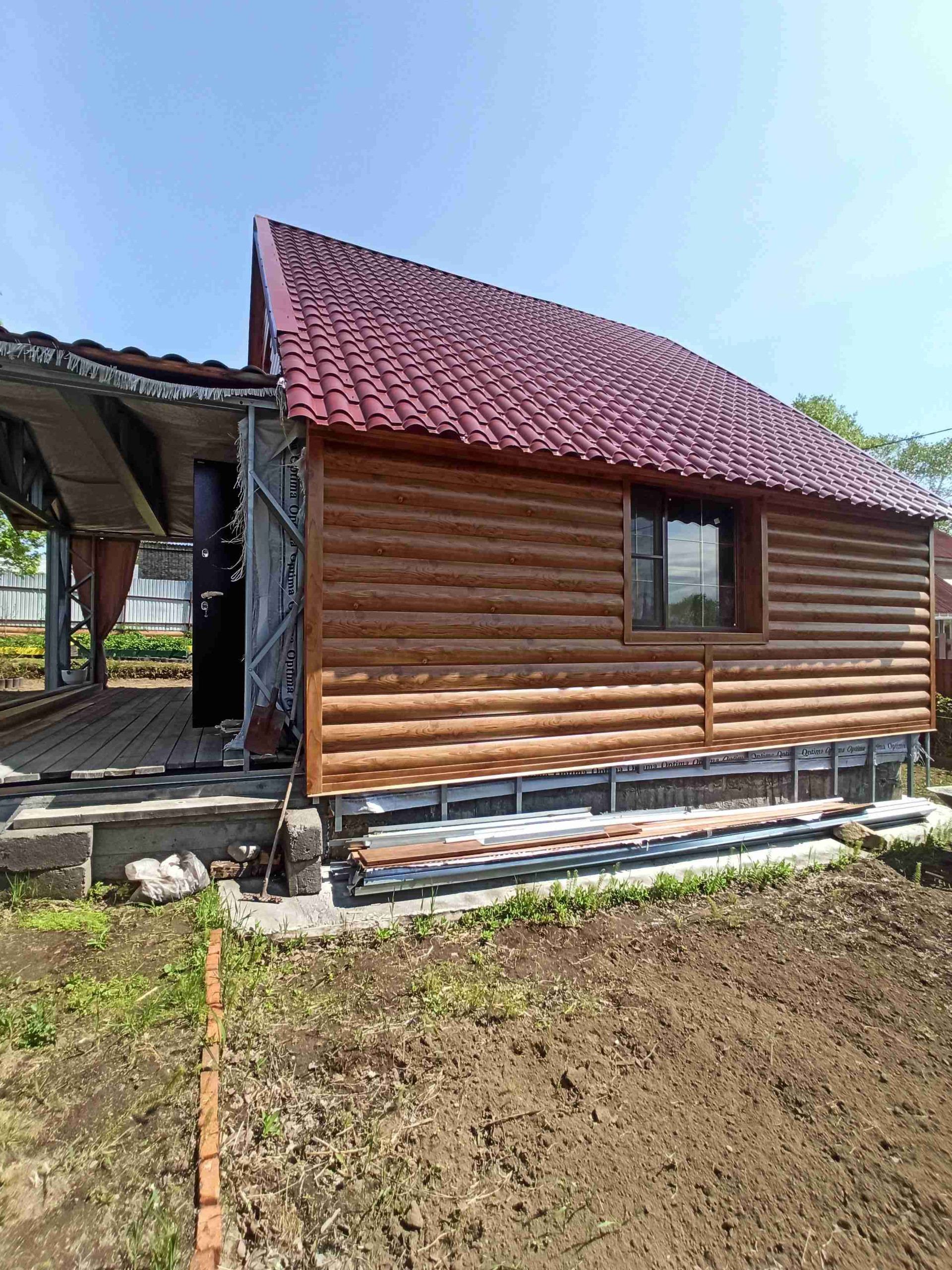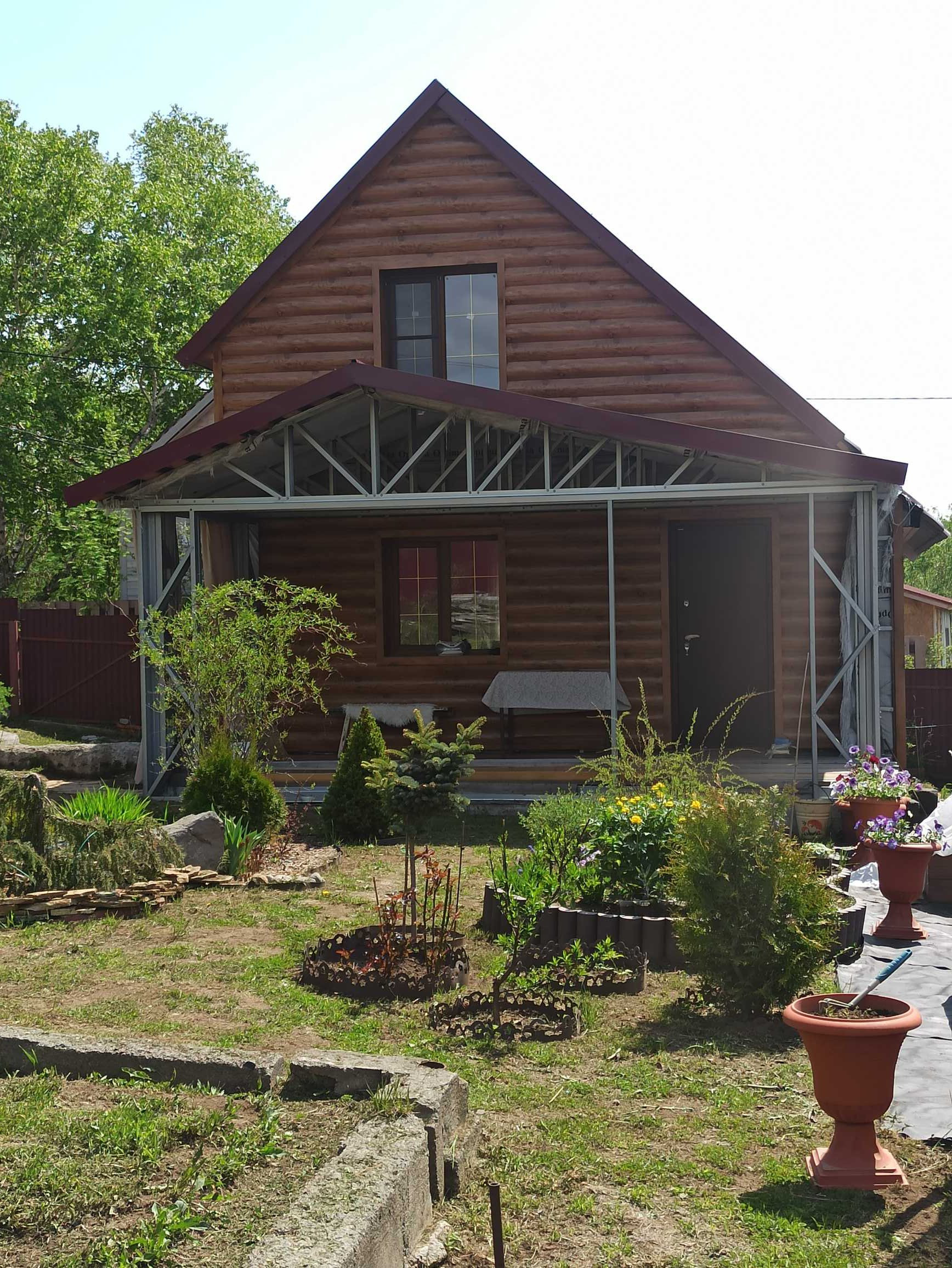 Крыша-металлочерепица. Терраса также на ленточном фундаменте, выполнена из надёжных материалов.