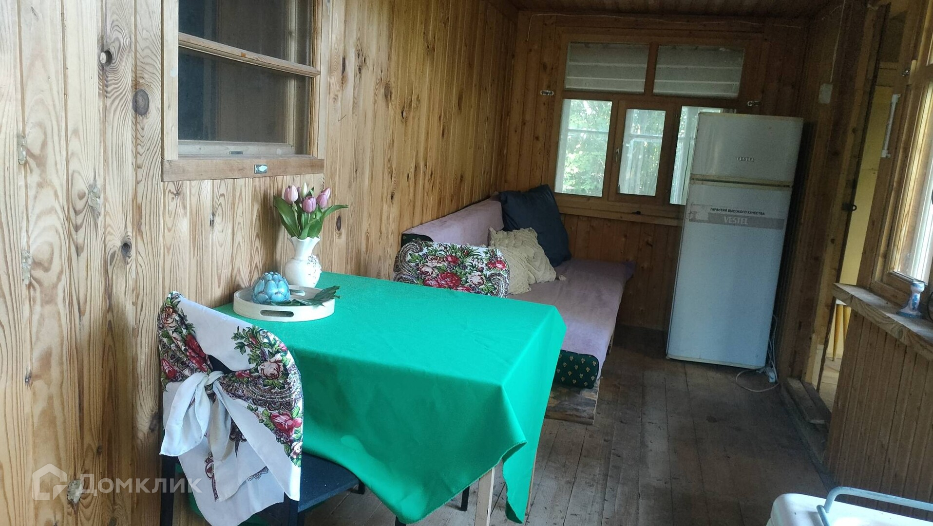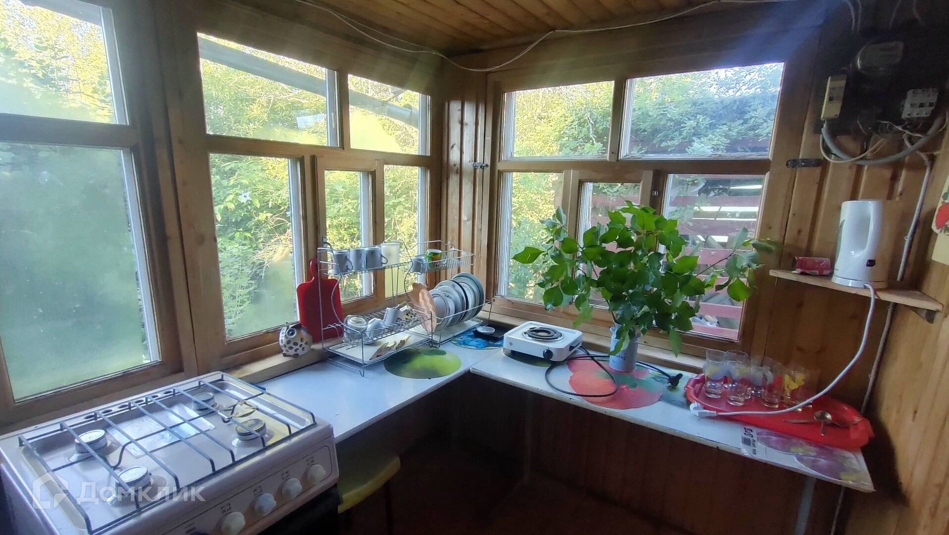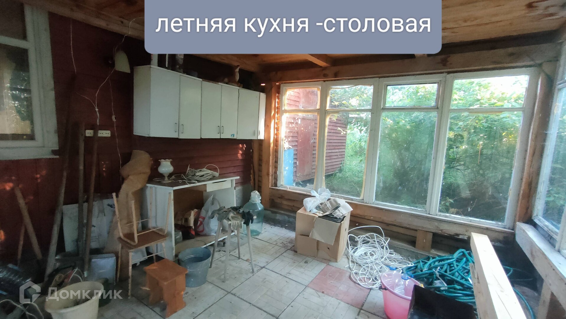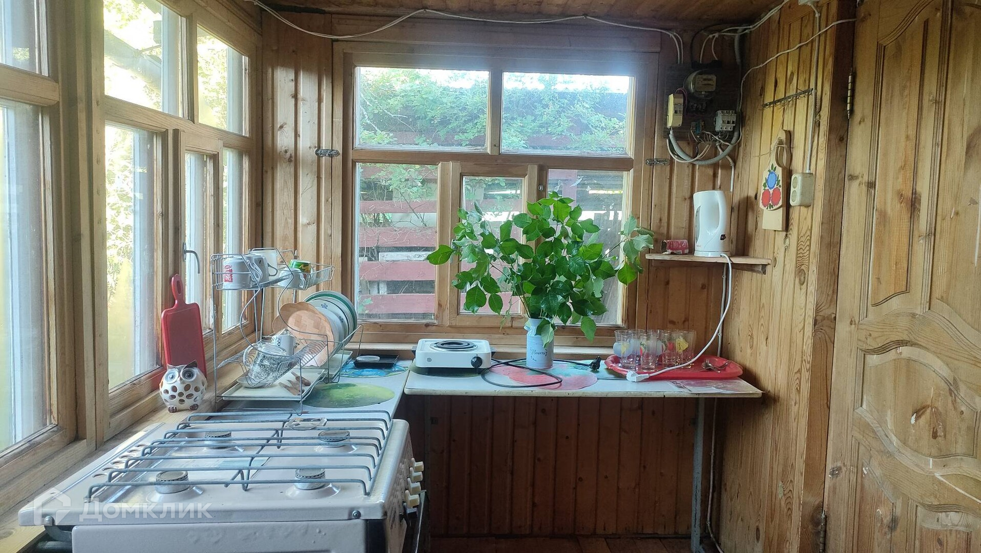 На участке расположен теплый каркасный дом с печью, баня, дровник, теплица. К дому пристроена летняя кухня, а над ней стеклянная пристройка, типа зимнего сада.