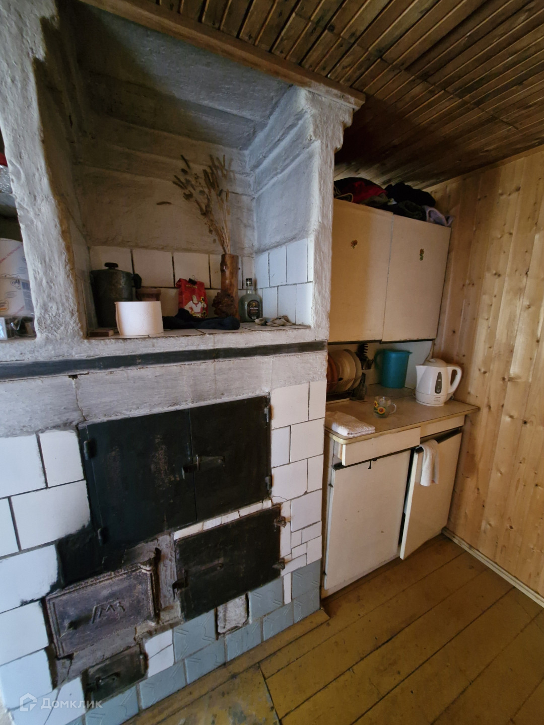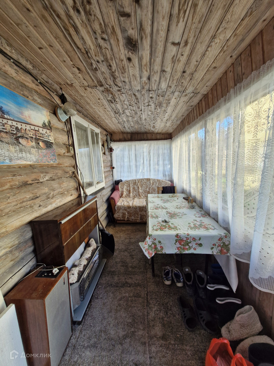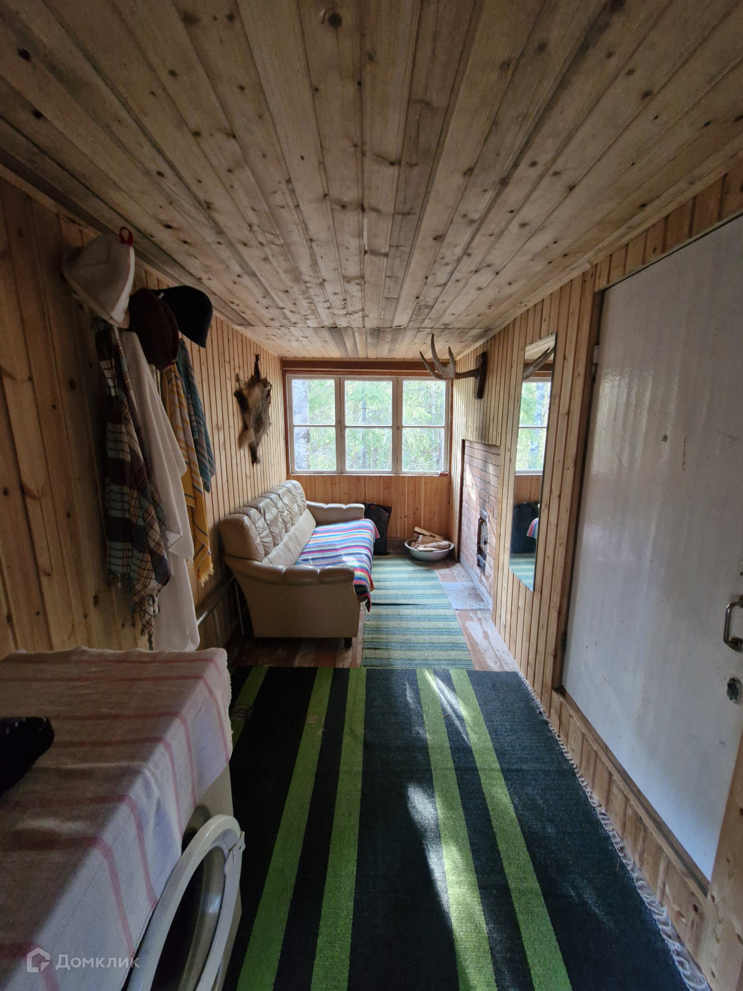 Двухэтажный дом из бревна, обшит изнутри вагонкой.