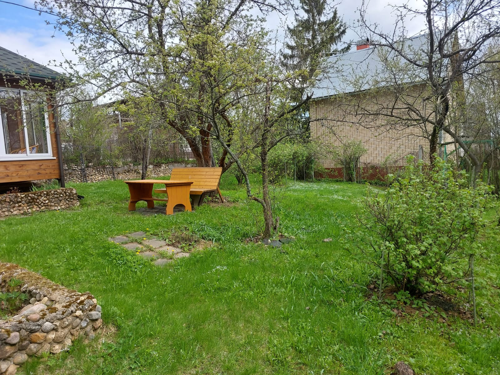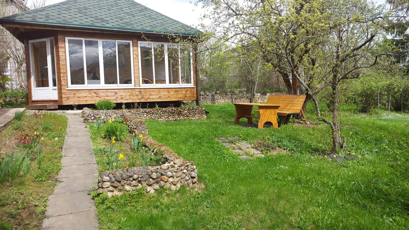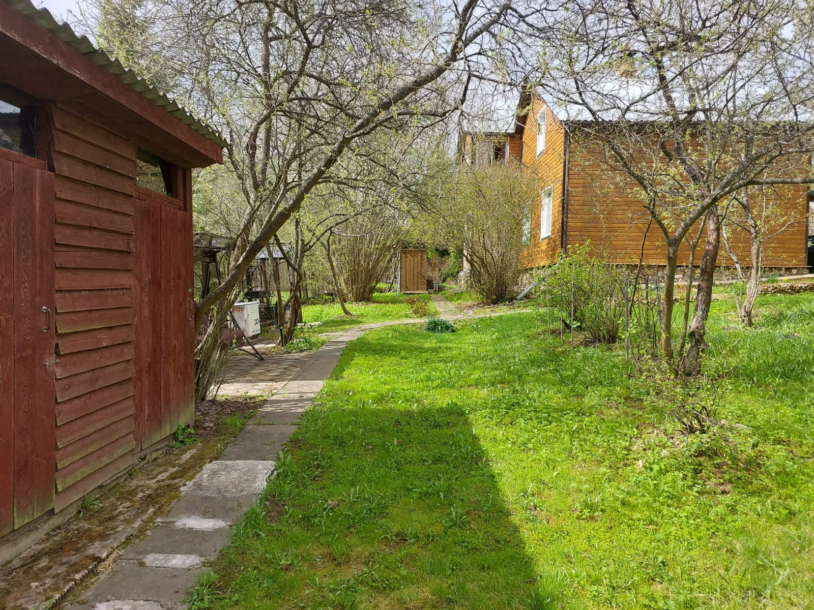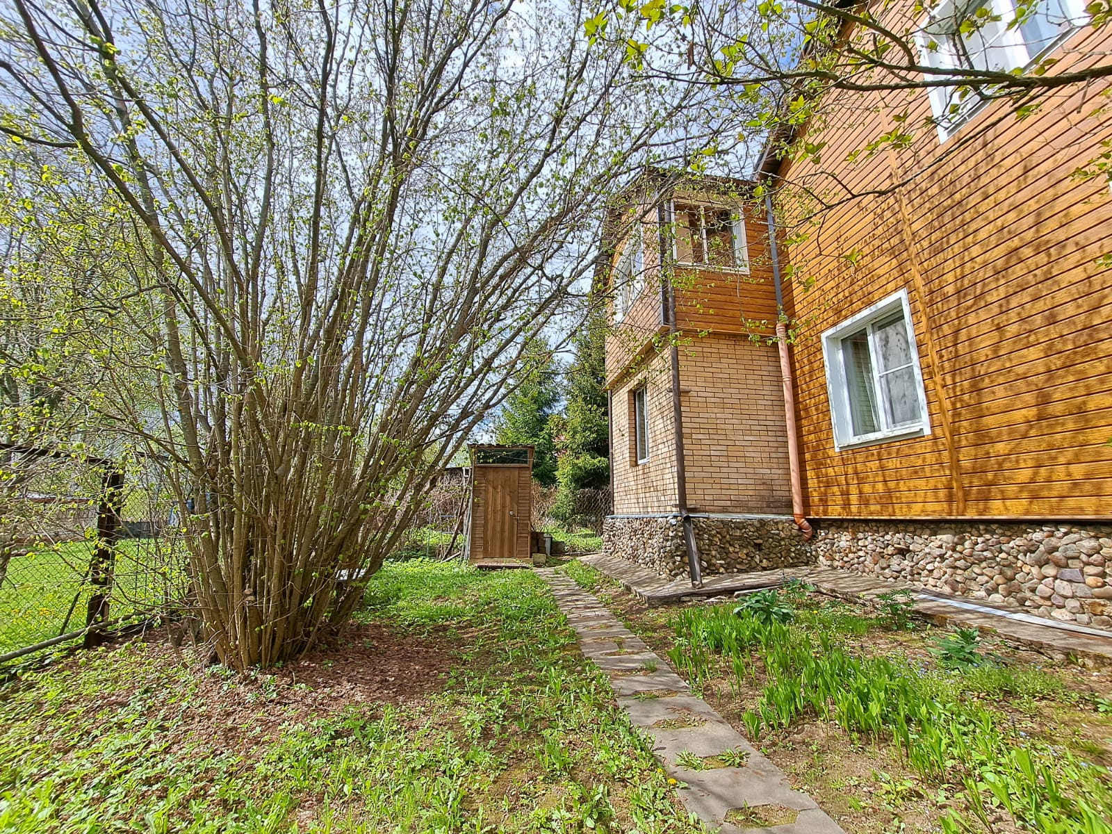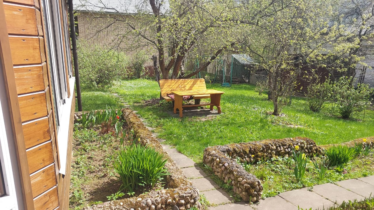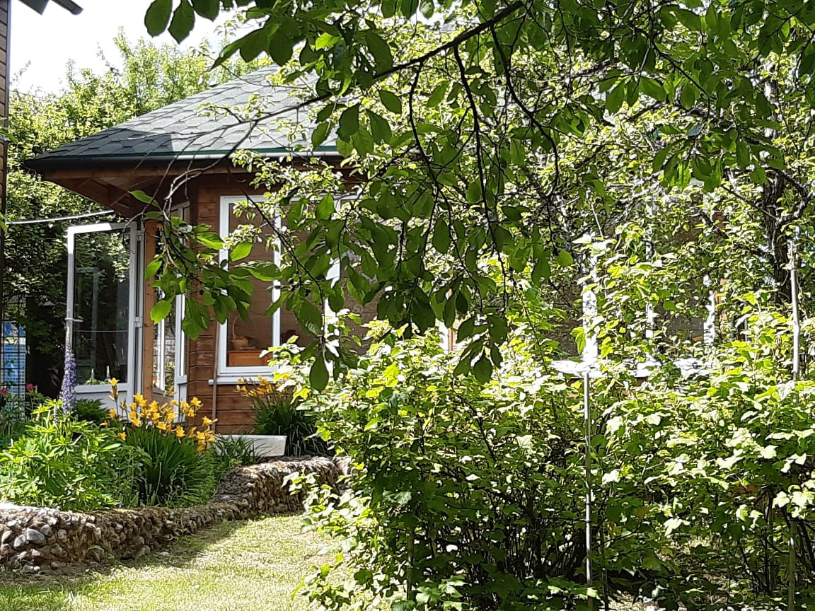 На участке с ландшафтным дизайном декоративные и плодовые деревья и кусты, цветочные клумбы, беседка деревянная размером 4 на 6 с панорамными окнами, хоз.постройки, уличный туалет, парковочная площадка на 2 машиноместа.