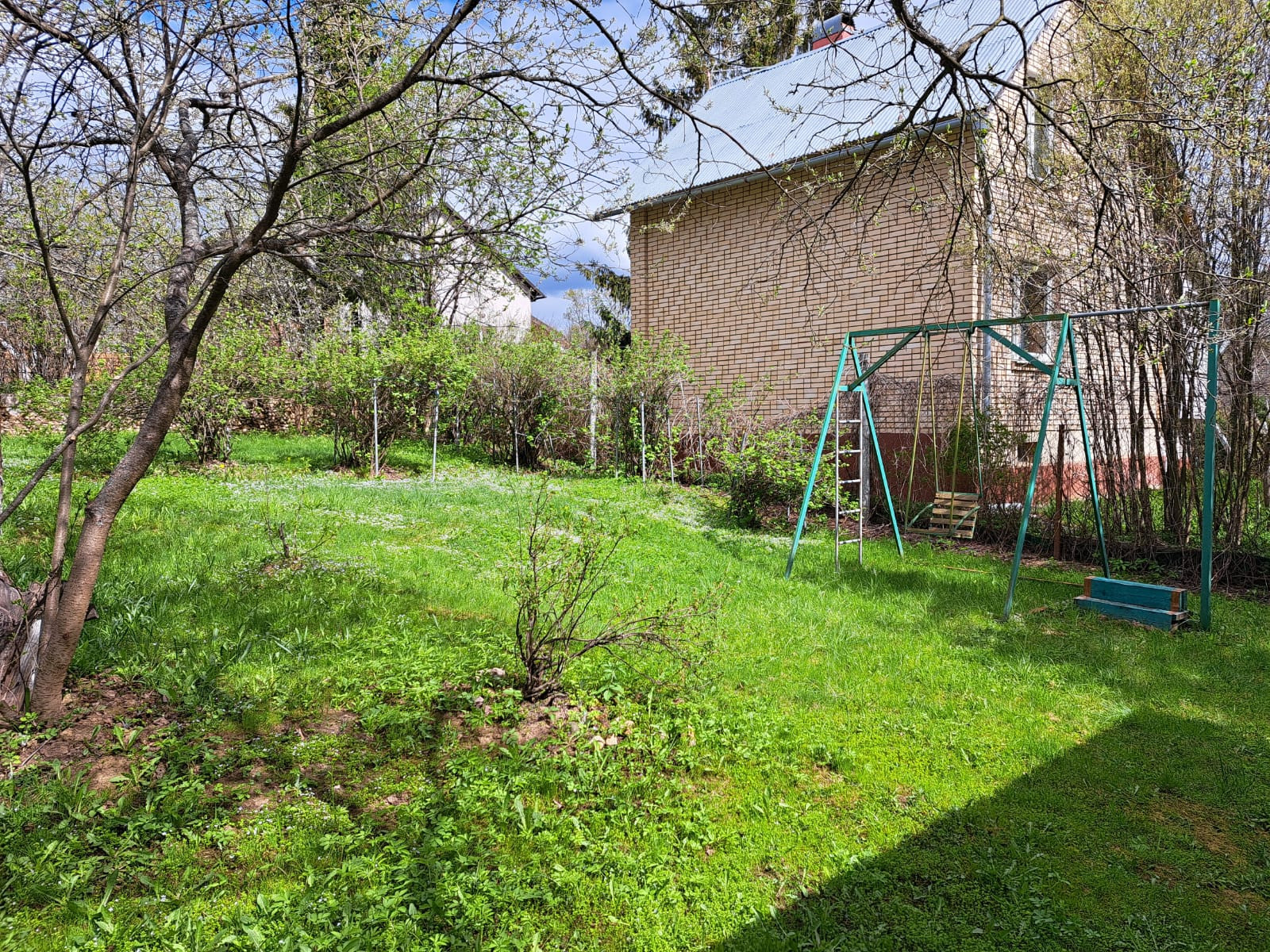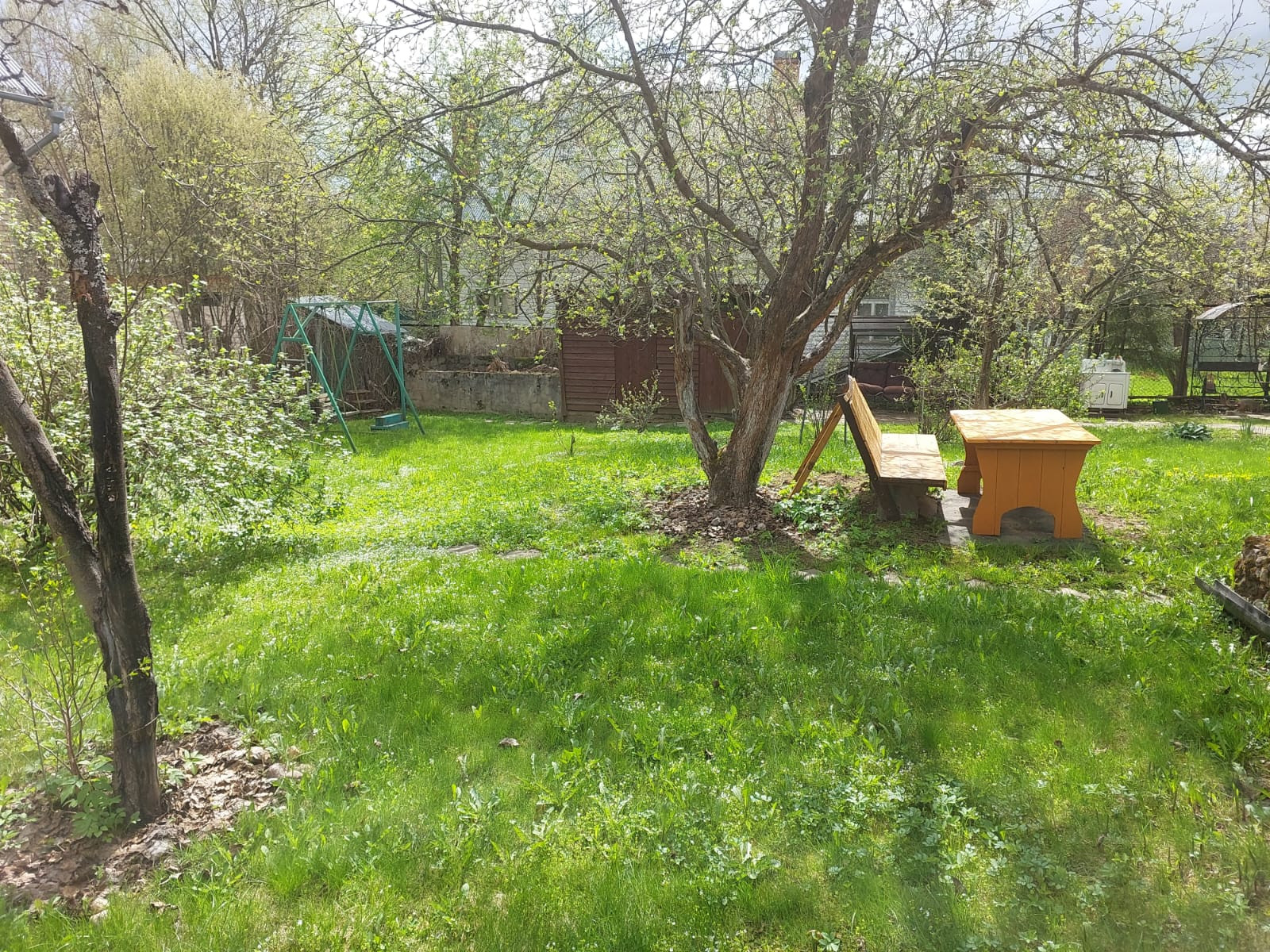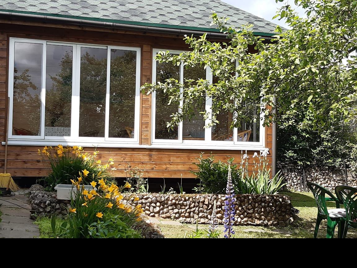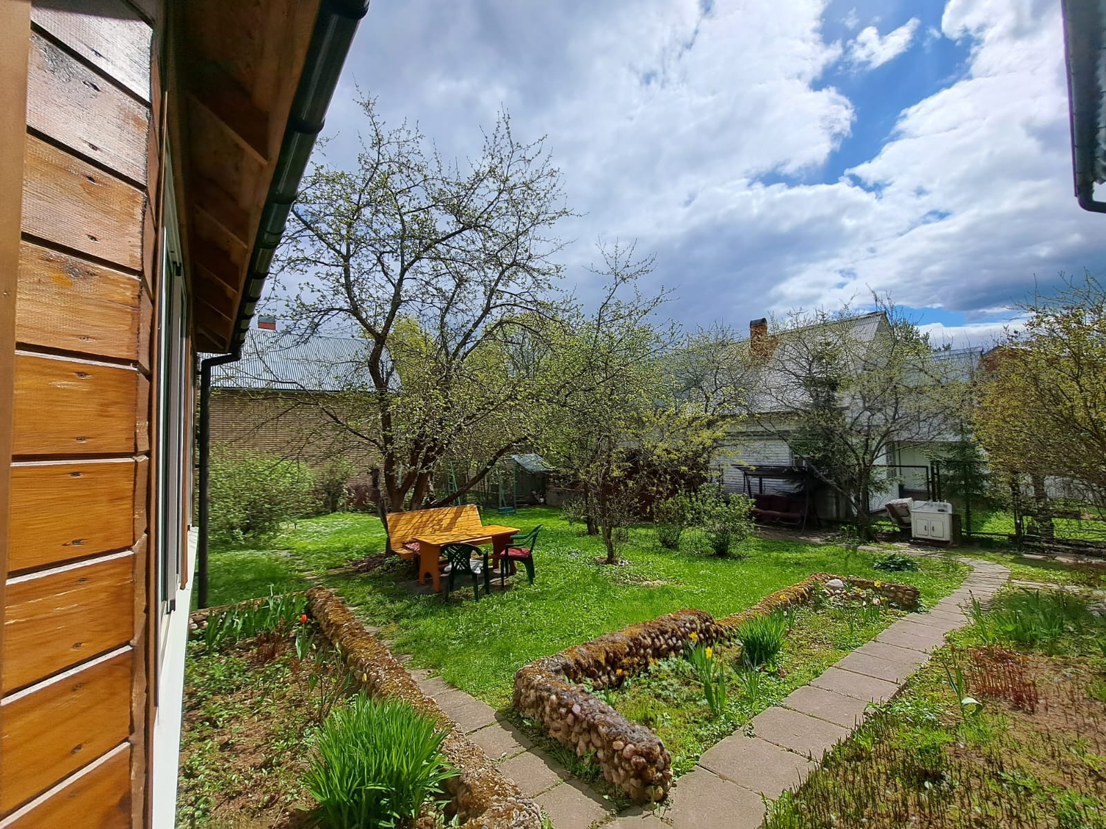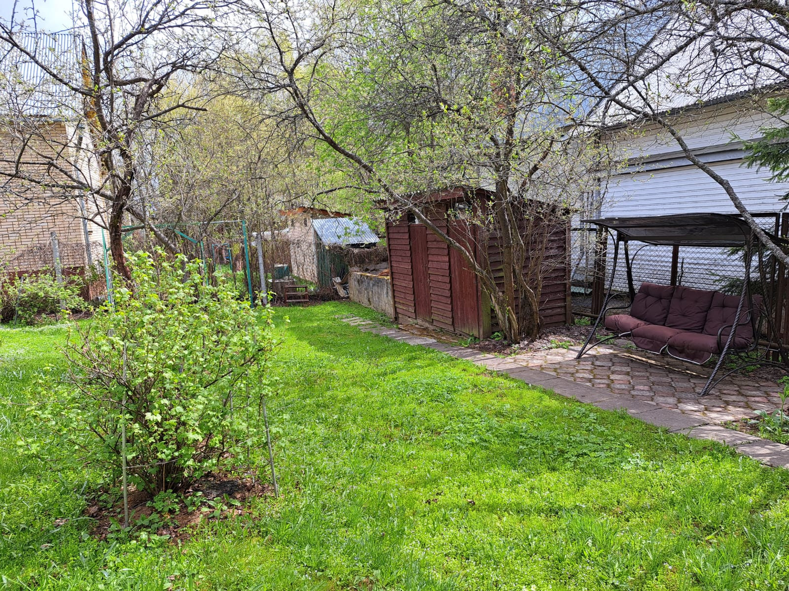 На участке с ландшафтным дизайном декоративные и плодовые деревья и кусты, цветочные клумбы, беседка деревянная размером 4 на 6 с панорамными окнами, хоз.постройки, уличный туалет, парковочная площадка на 2 машиноместа.
