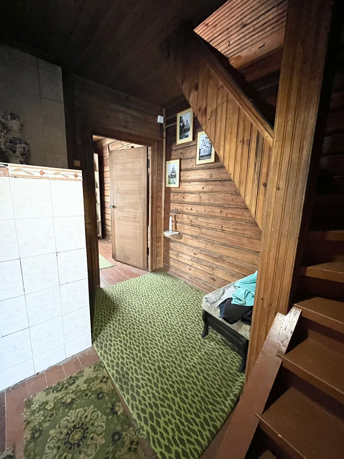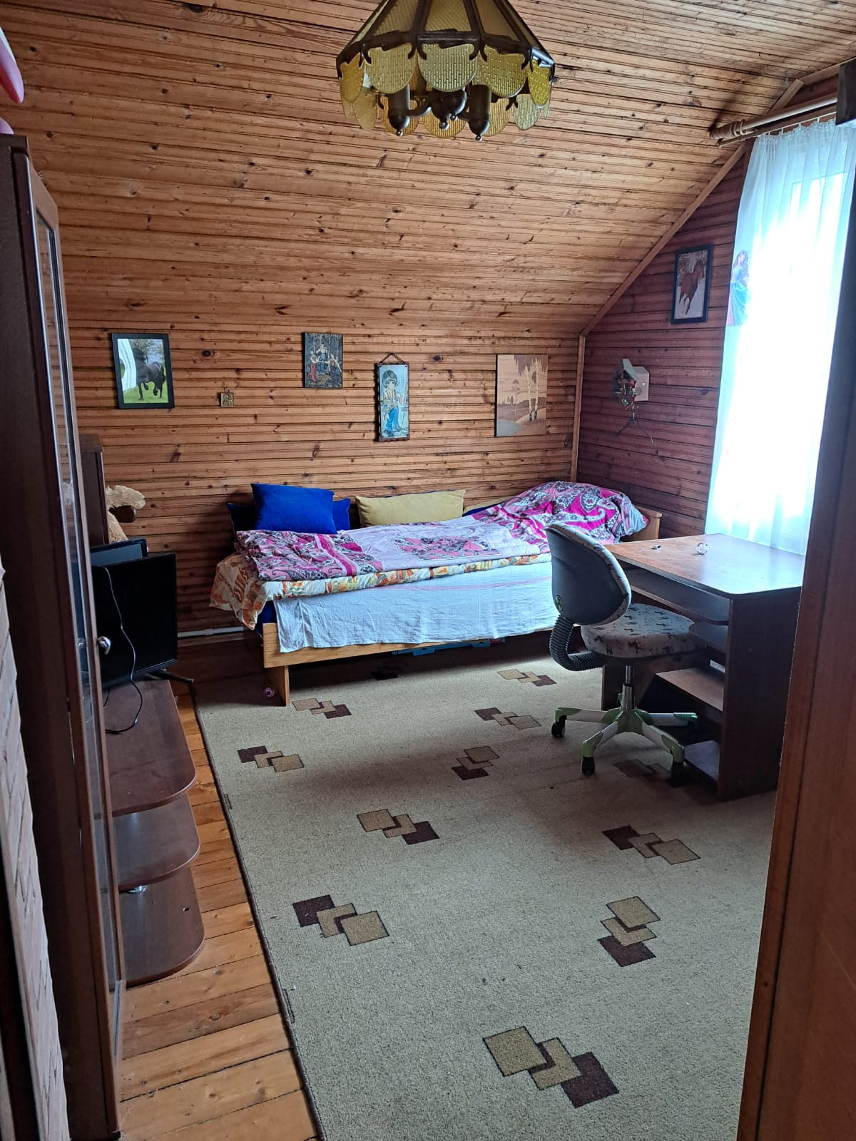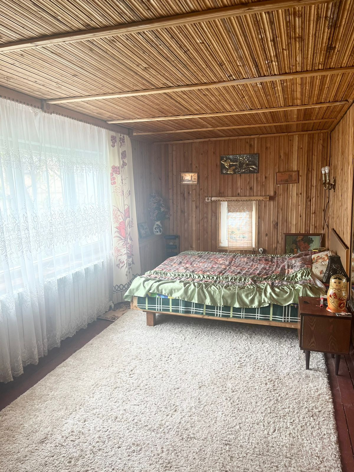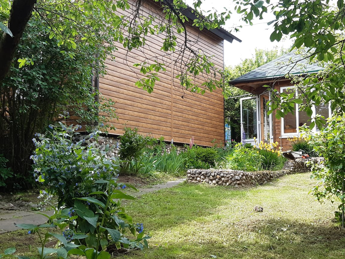 В доме на 1-ом этаже гостиная с дровяным камином, кухня с эл. плитой и водонагревателем , туалет, душевая с эл. водонагревателем, гардеробная. На 2-ом этаже три спальни, туалет, балкон. Под домом подвал высотой 2 м.
