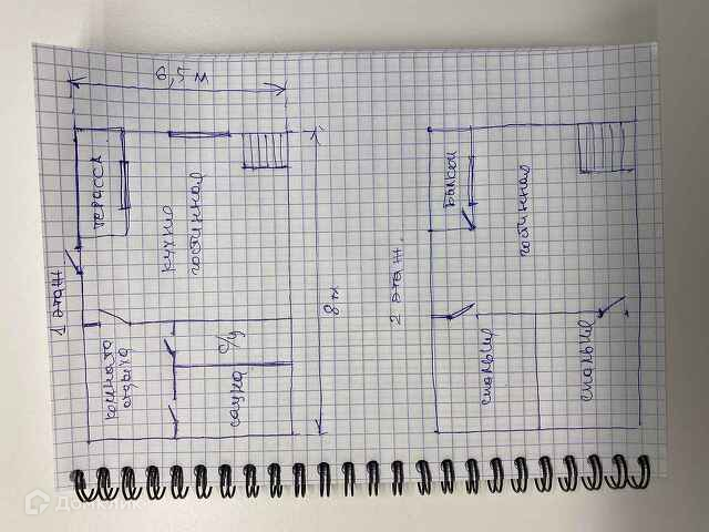 Первый - кухня-гостиная, комната для гостей,ванная комната, баня.Второй этаж- две спальни,гостиная,балкон.