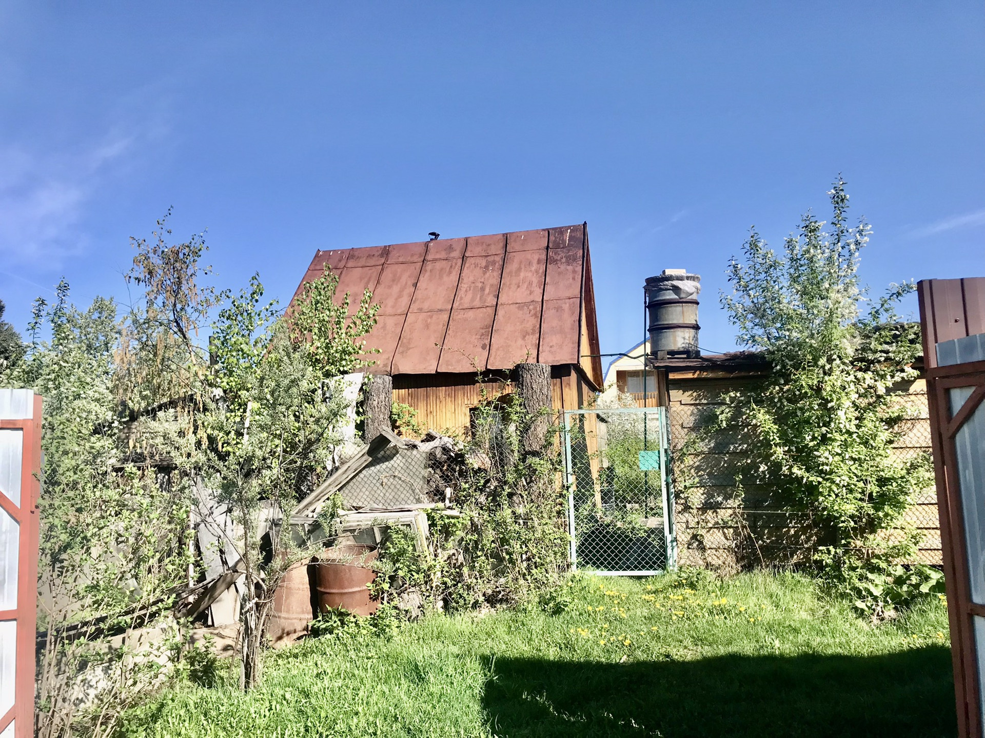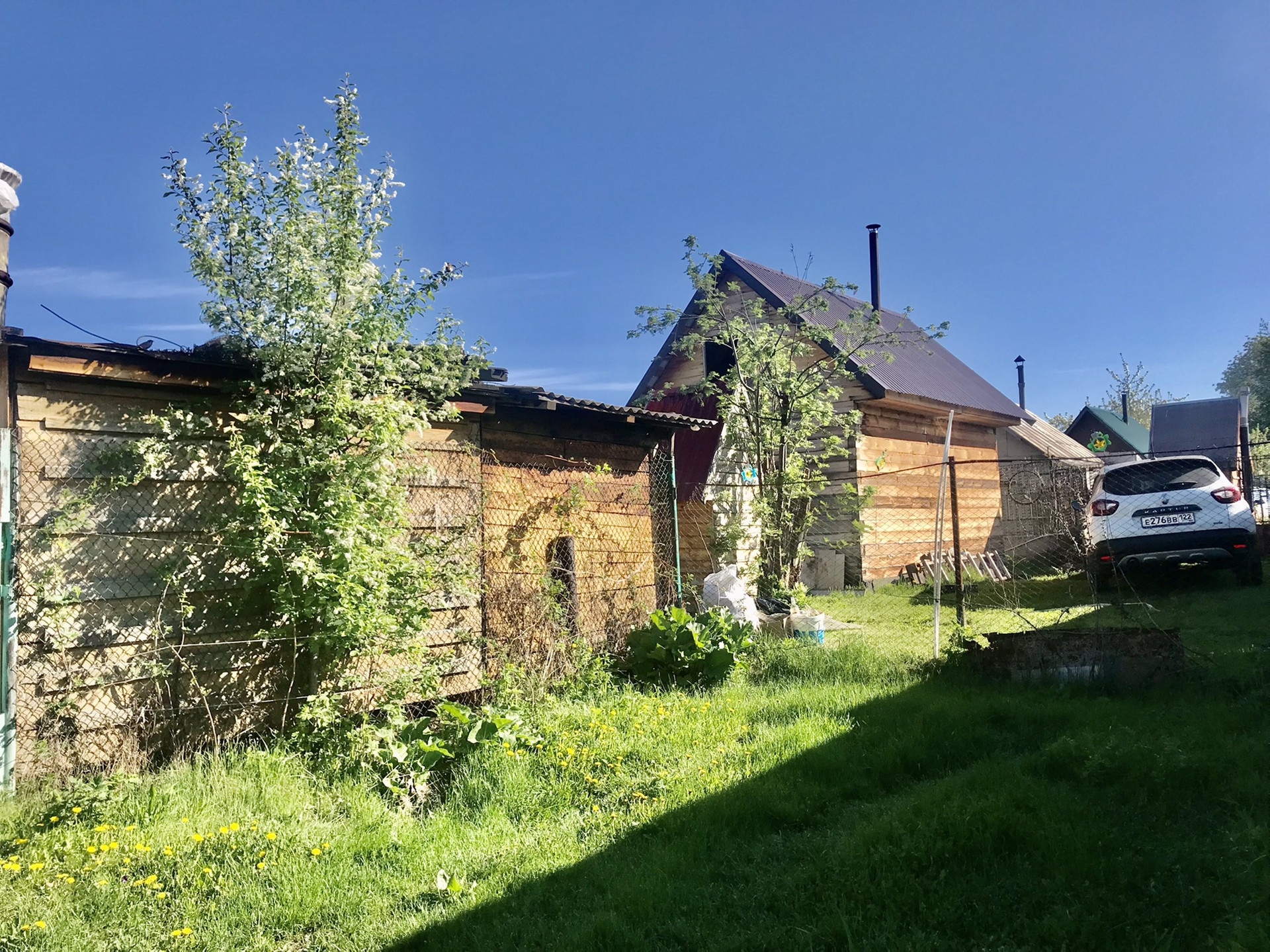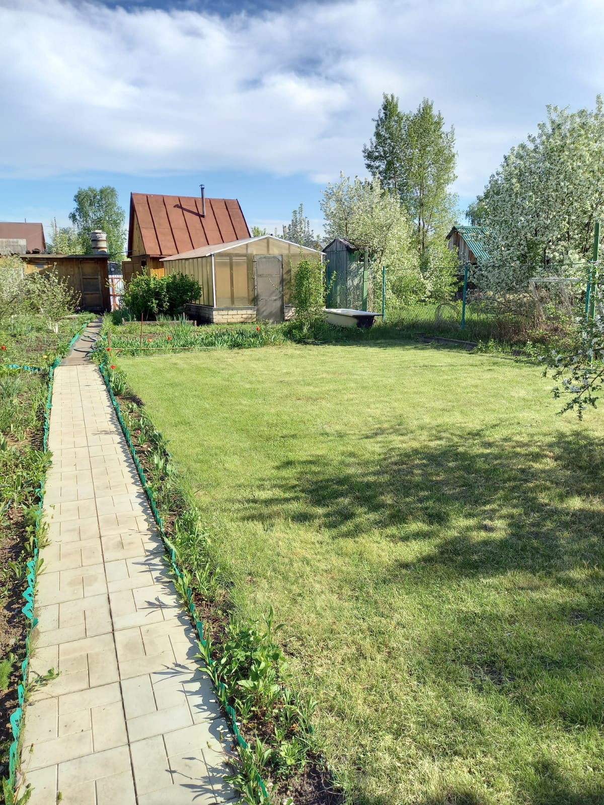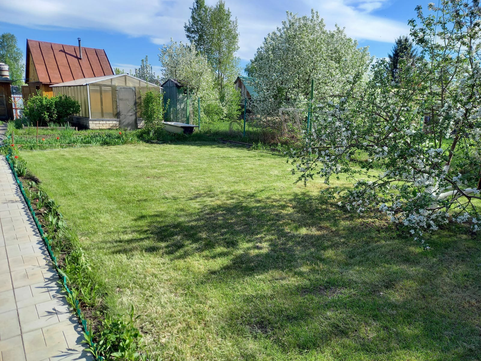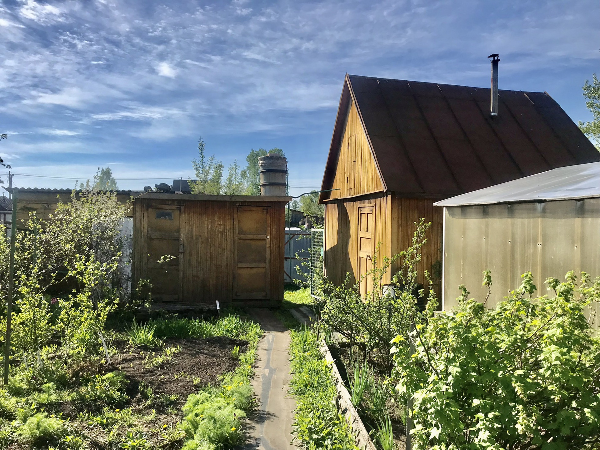 Основательная большая теплица - под огород, новая банька, сарайка, дровник и туалет - все постройки на земельном участке хорошо продуманы и функциональны. Уютная зона барбекю с лужайкой для бассейна и качелей.