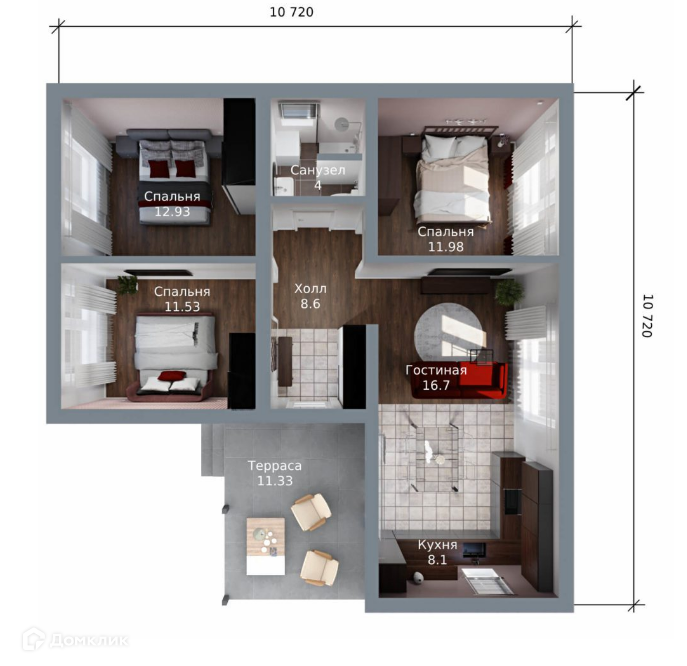 В доме три уютные спальни, где каждый член семьи может наслаждаться личным пространством. Пространство ванной комнаты достаточно просторное, поэтому на свое усмотрение можете разместить там как душевую кабину, так и ванную.