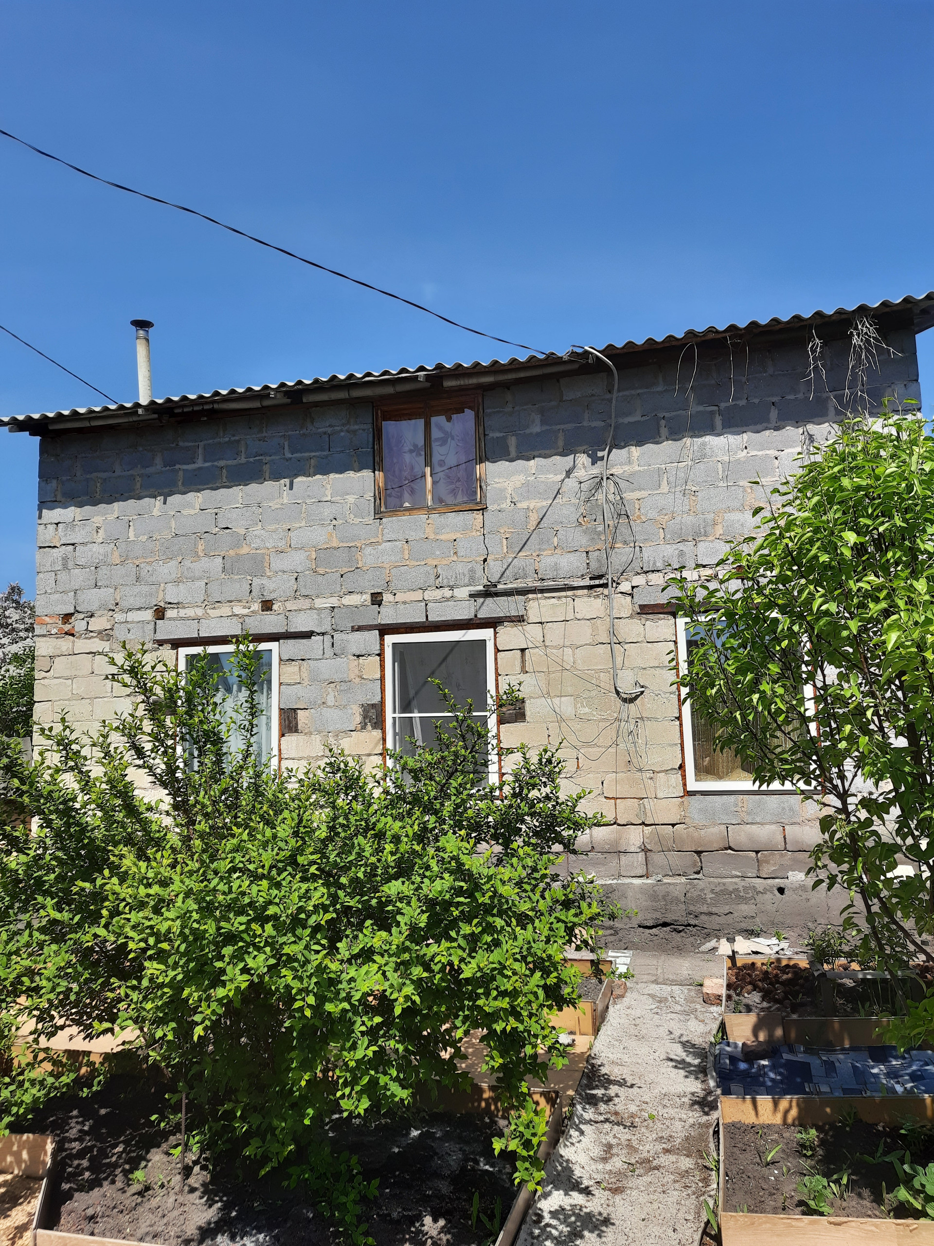 Дом двухэтажный из шлакоблока, есть печь для обогрева помещения, также на первом этаже есть гараж и баня с отдельными входами, мастерская-кладовая, одна жилая комната расположена на первом этаже и две на втором, при желании можно весь первый этаж задействовать под жилое помещение. Также есть открытая терраса с навесом при выходе из дома, где удобно проводить время за чашкой чая.