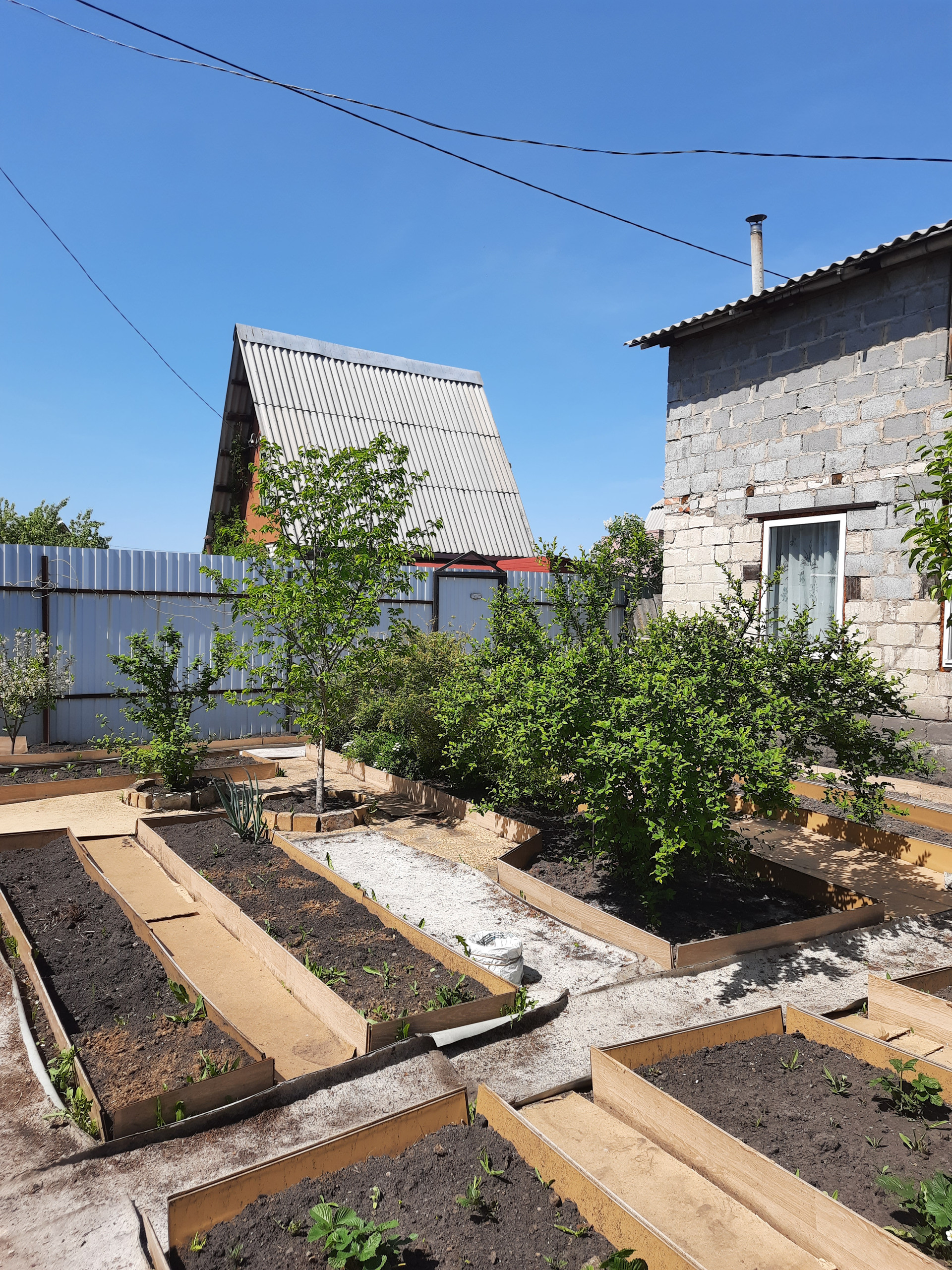 Забор с лицевой части - профнастил, окрашенный, другие стороны-сетка-рабица. Есть въезд с противоположной стороны участка, сформированы места для парковки.