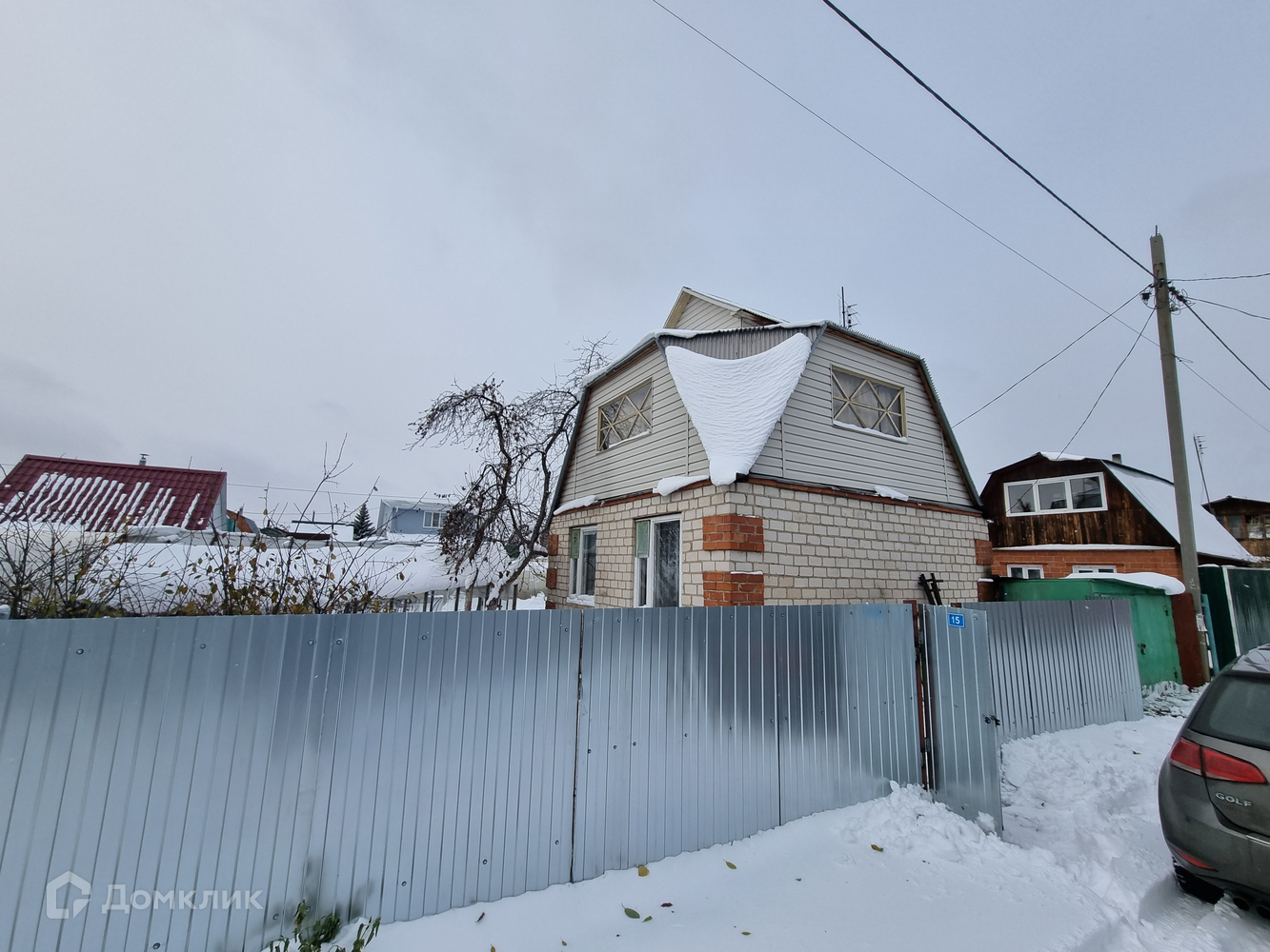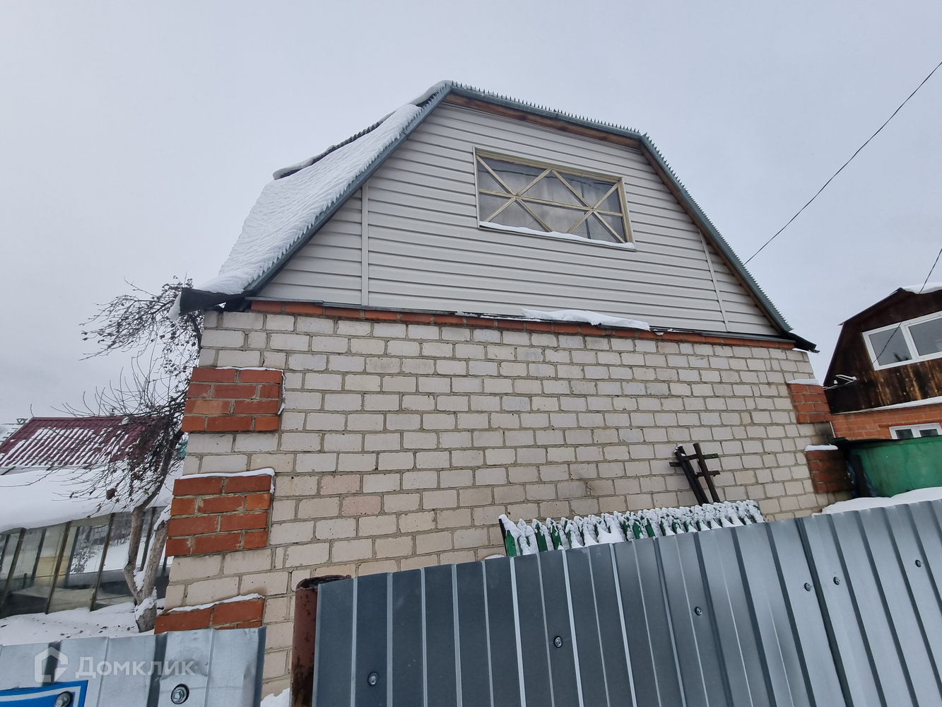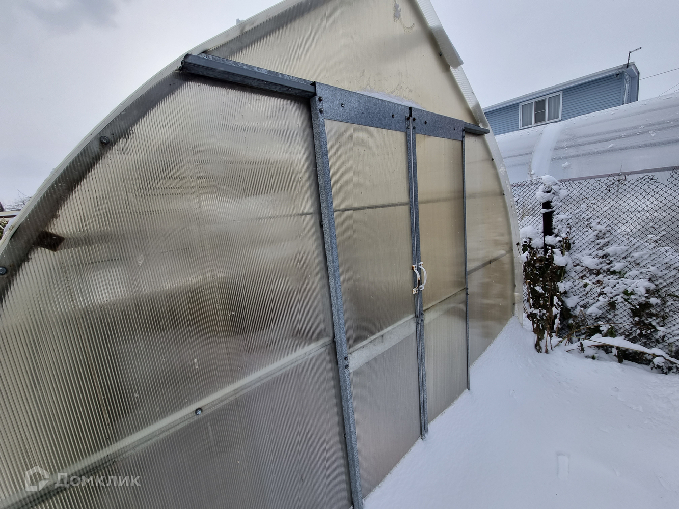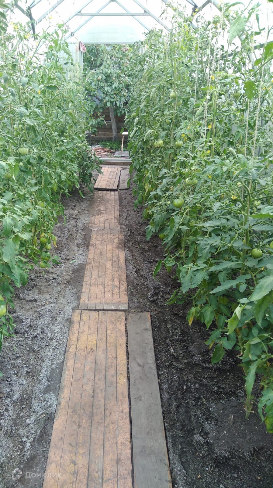 На участке имеется небольшая баня, металлический гараж (плюс есть 1 парковочное место для автомобиля возле дома), две теплицы, скважина 12 метров.