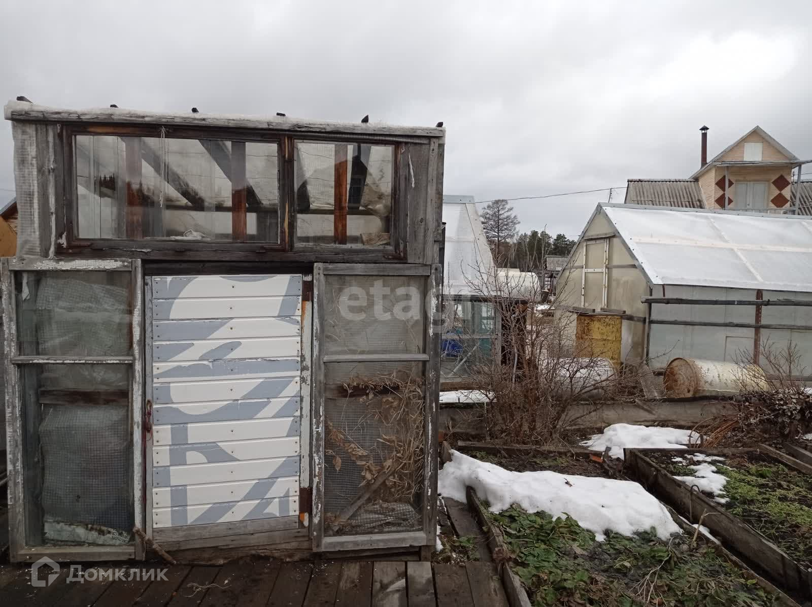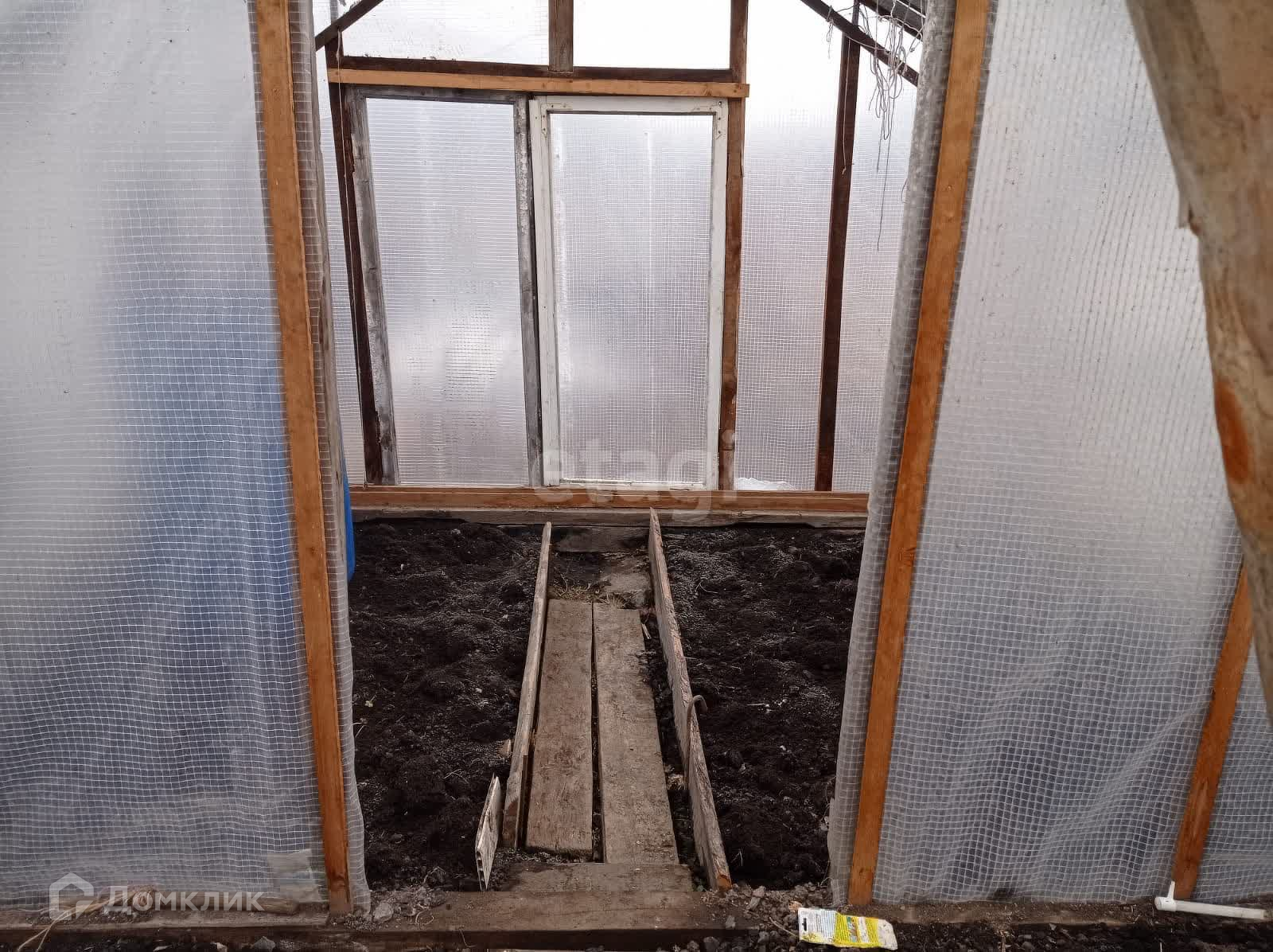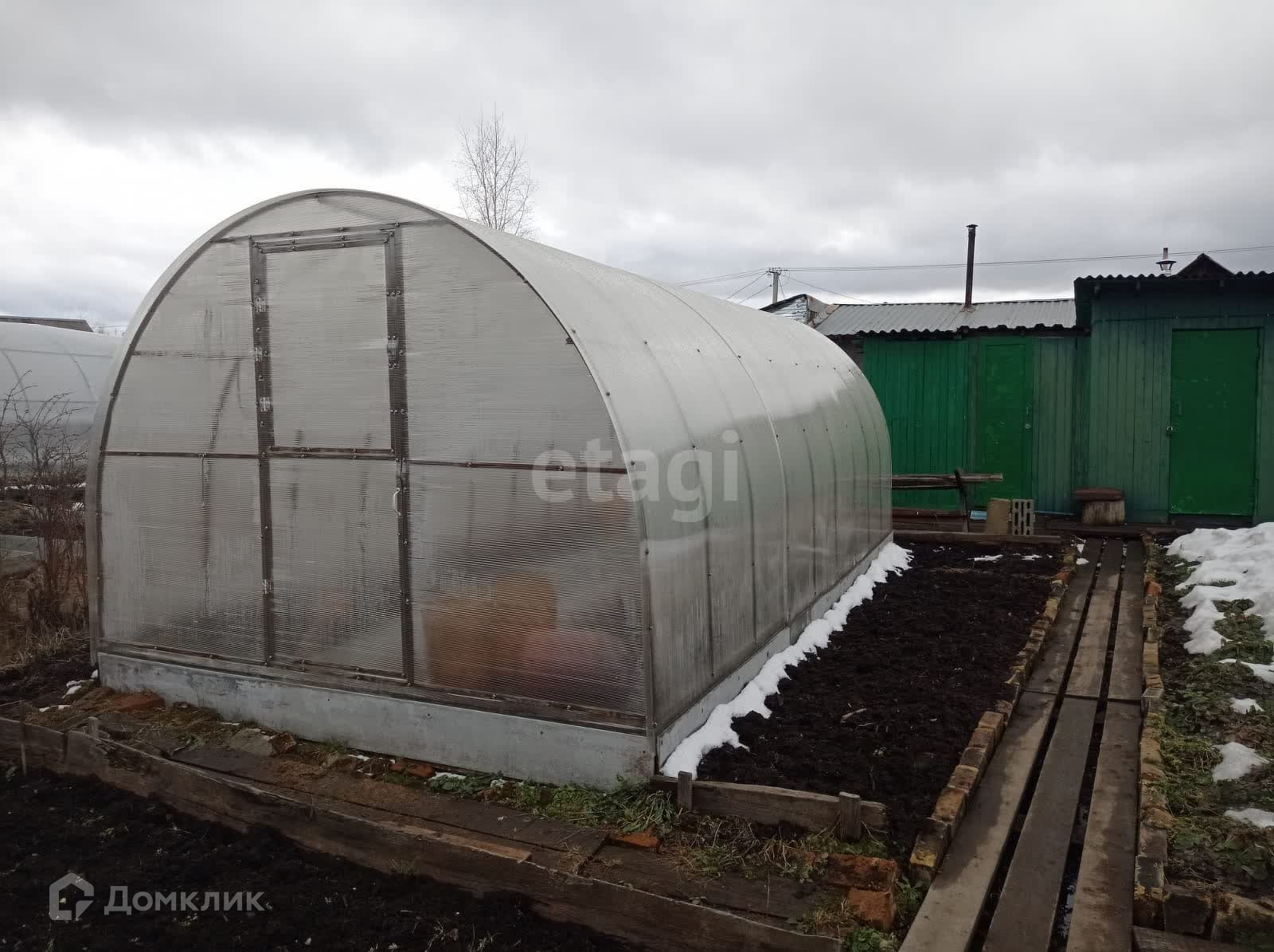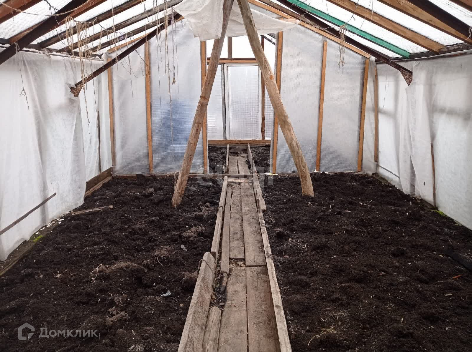 Имеются 2 теплицы 3 на 6 метров, 1-новая из поликарбоната и 2-я из стекла и пленки, 1 парник. Есть сарай под инструмент, отдельное помещение с металлической печкой.