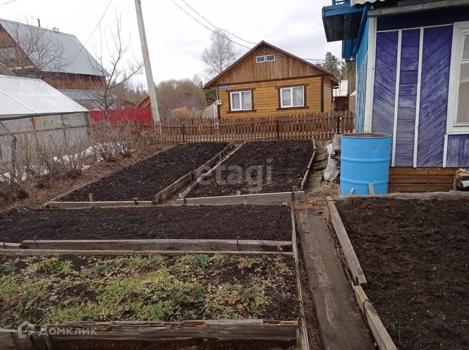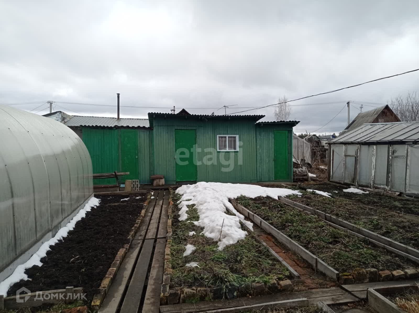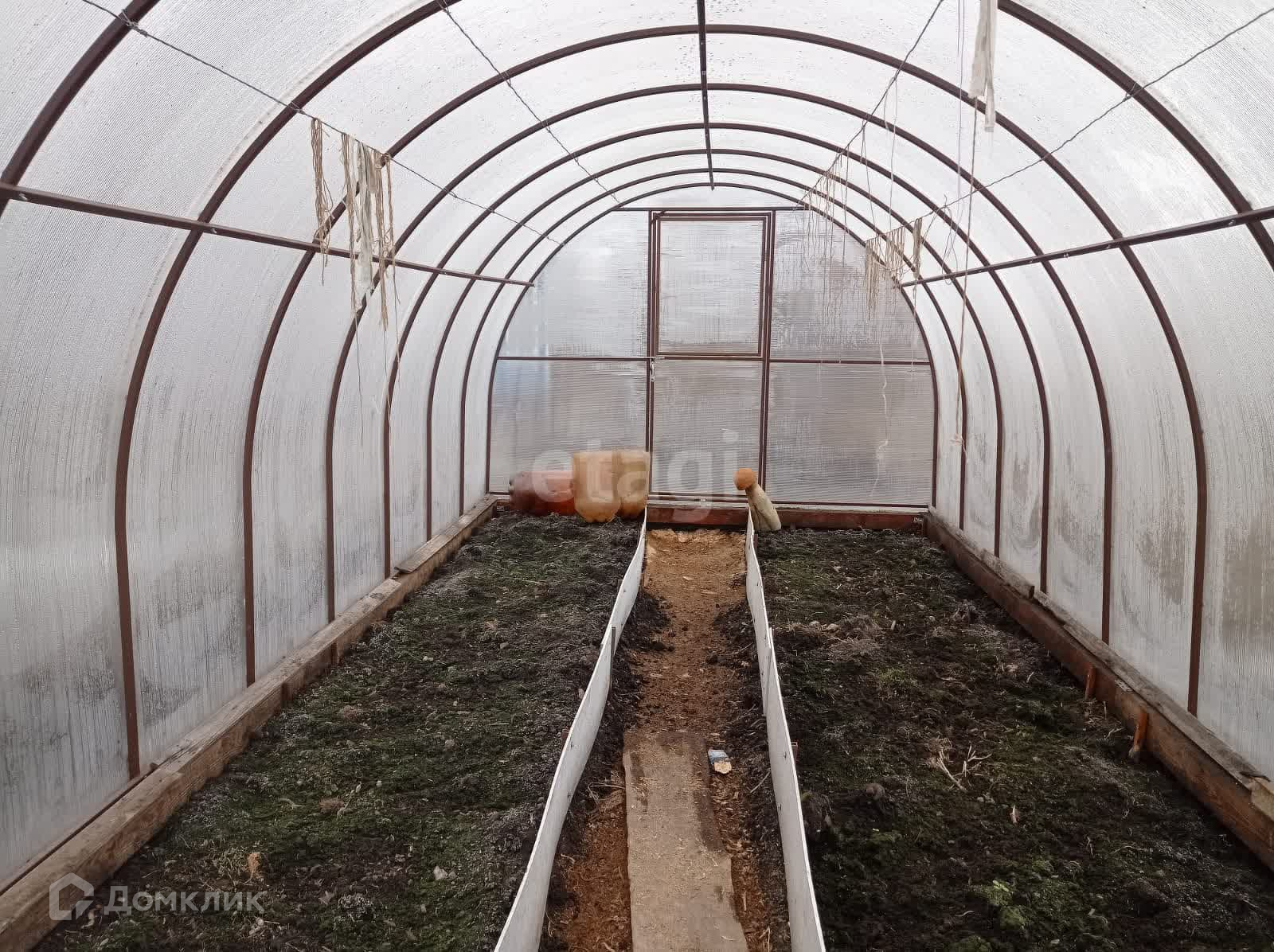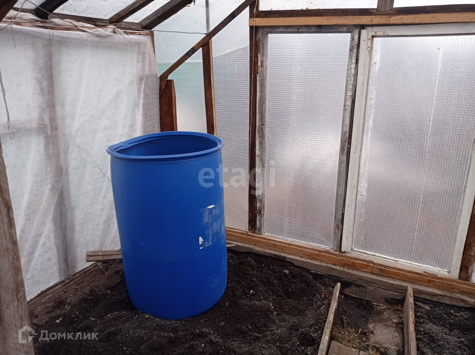 Имеются 2 теплицы 3 на 6 метров, 1-новая из поликарбоната и 2-я из стекла и пленки, 1 парник. Есть сарай под инструмент, отдельное помещение с металлической печкой.