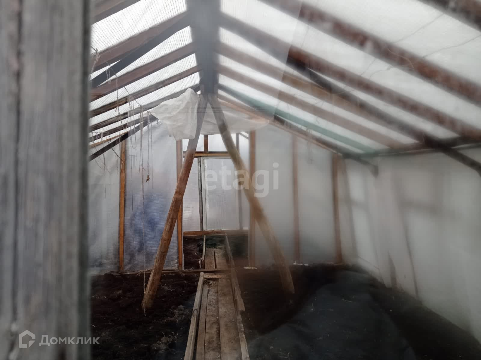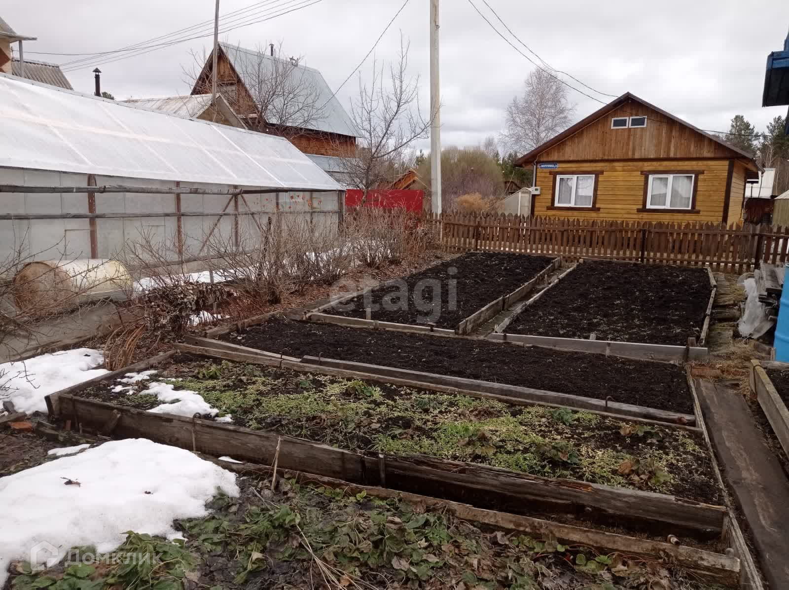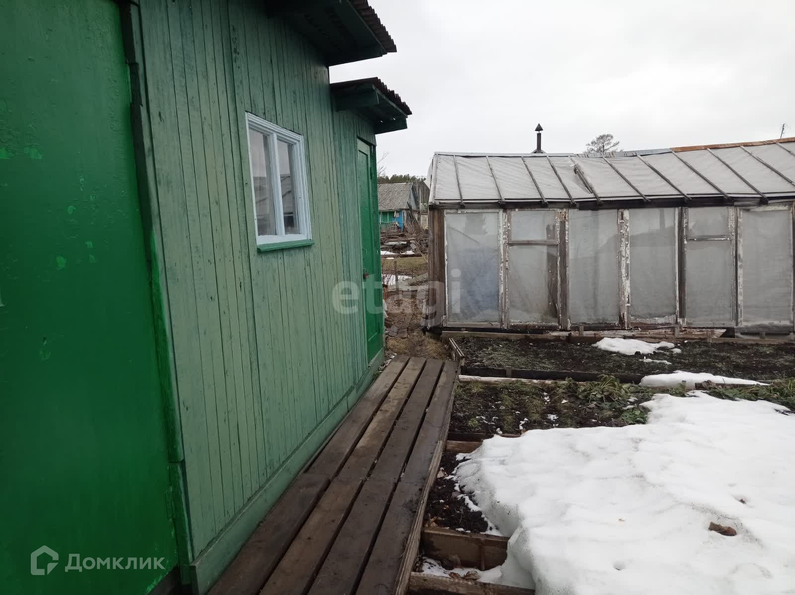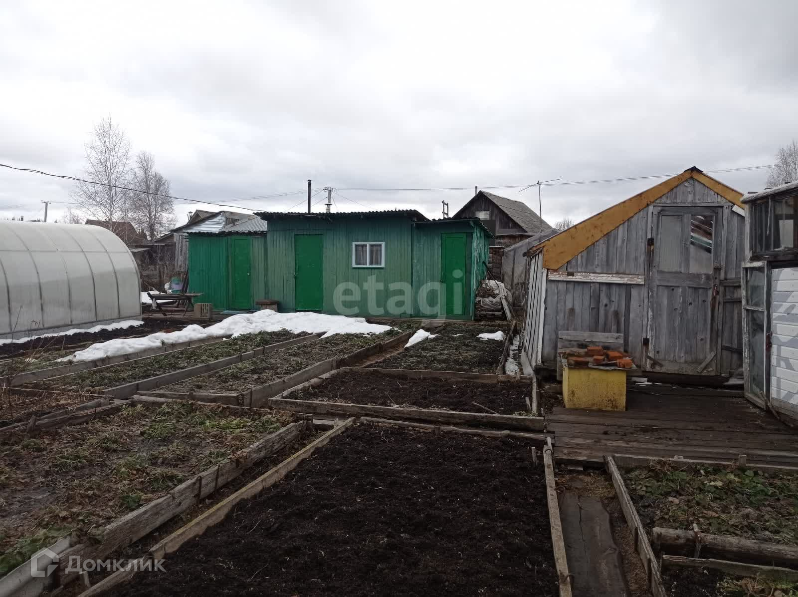 Имеются 2 теплицы 3 на 6 метров, 1-новая из поликарбоната и 2-я из стекла и пленки, 1 парник. Есть сарай под инструмент, отдельное помещение с металлической печкой.