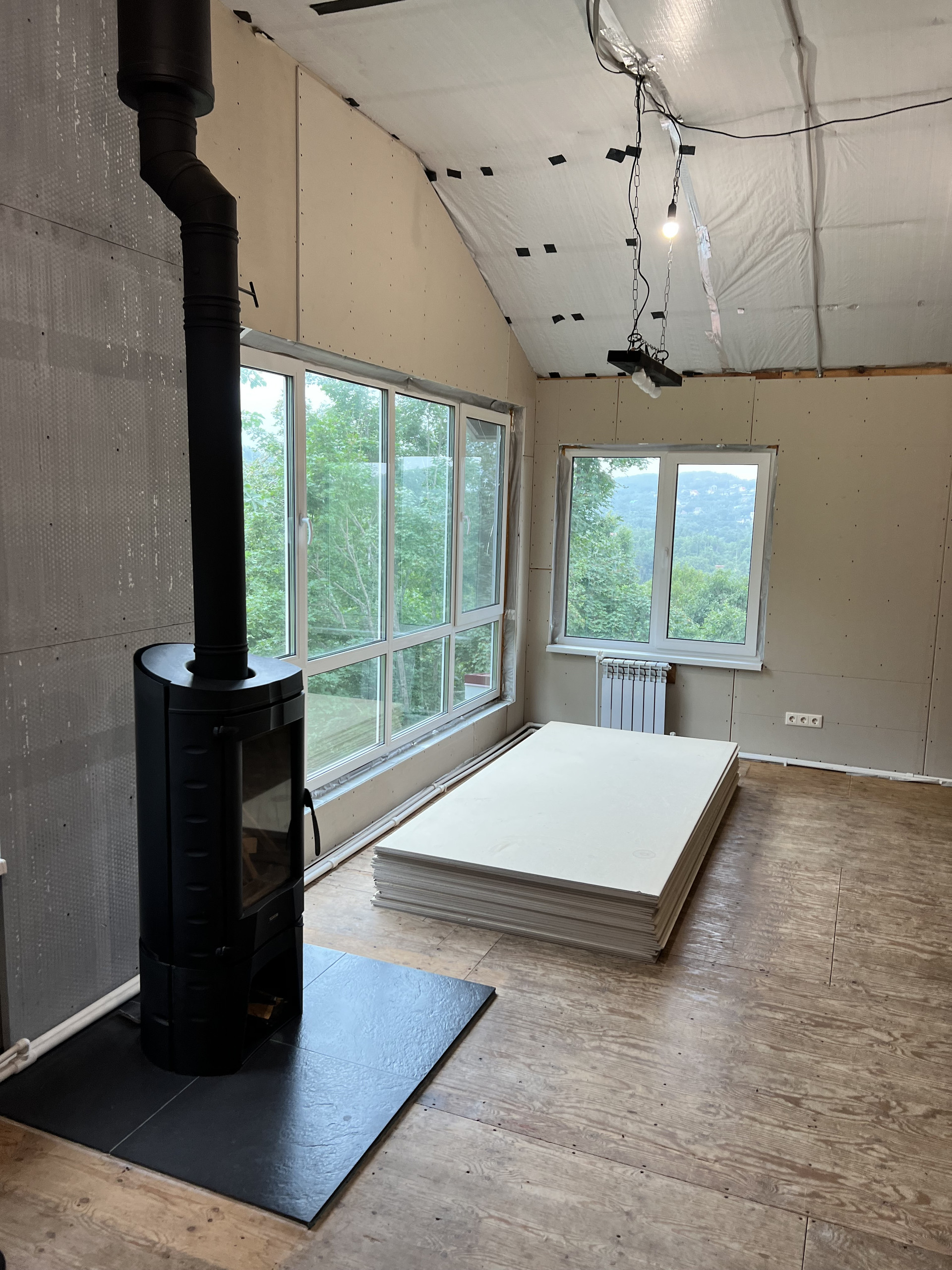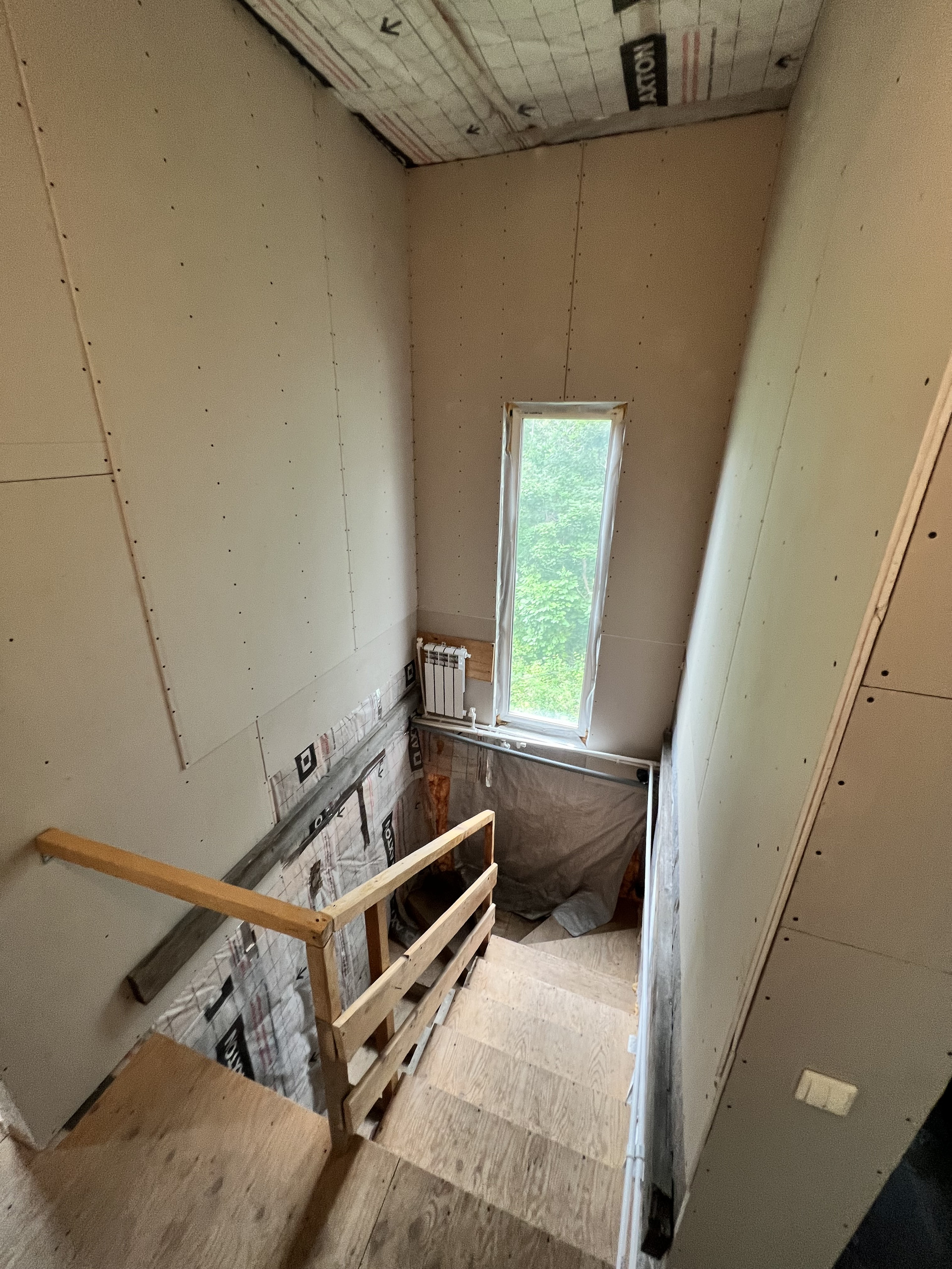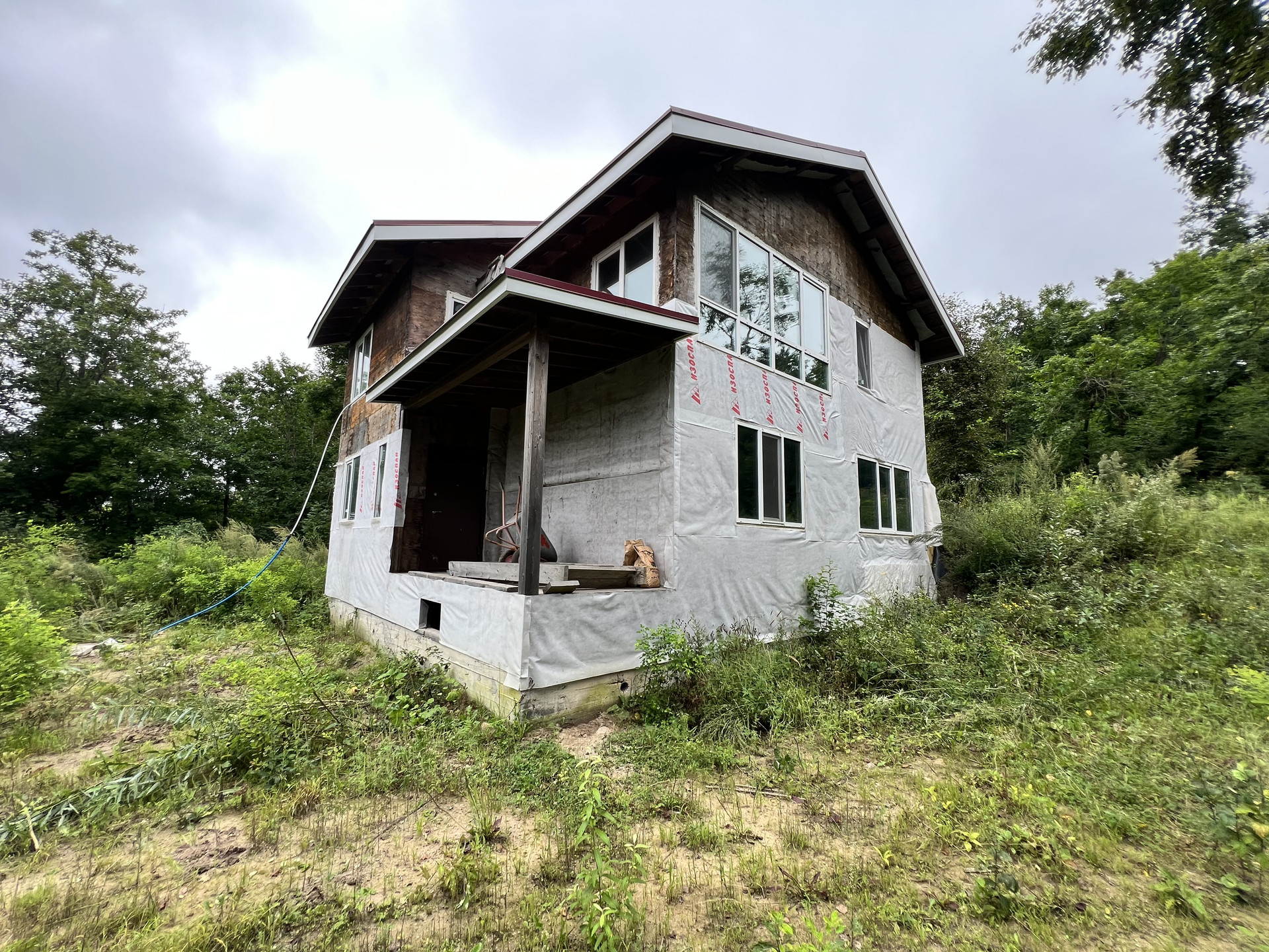 Из вложений - фасад (предварительную смету от финестры прикладываю) и отделка дома внутри. Второй этаж обшит гипсокартоном в два слоя, первый этаж просто утеплен минватой. Сделана электрика и временное отопление от дизельного котла, далее предполагалось, что он будет работать, как резервный котел, есть резервное питание от солнечных батарей.