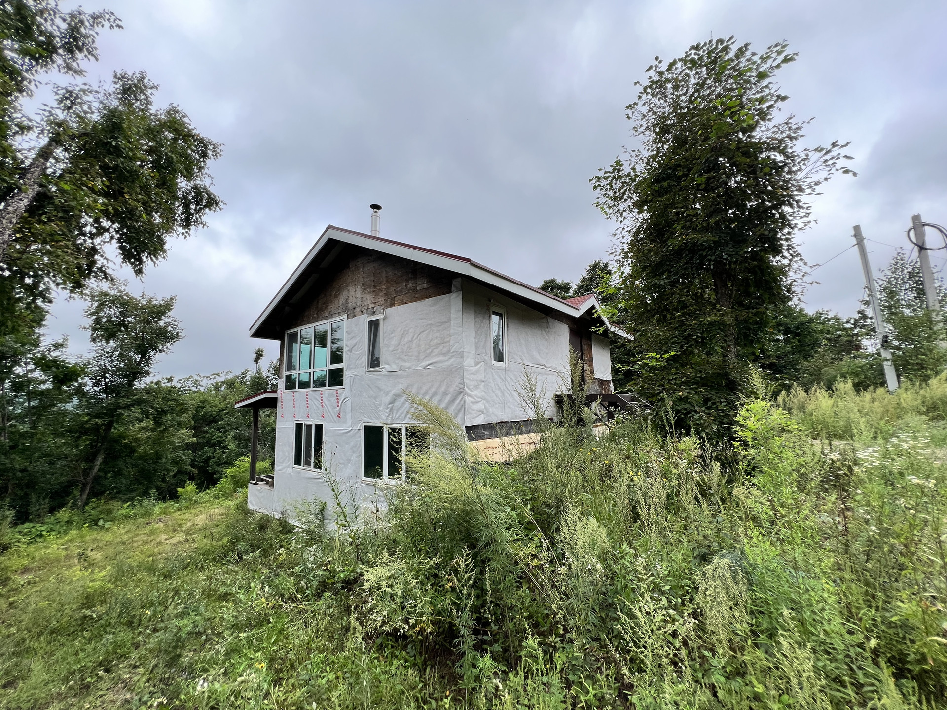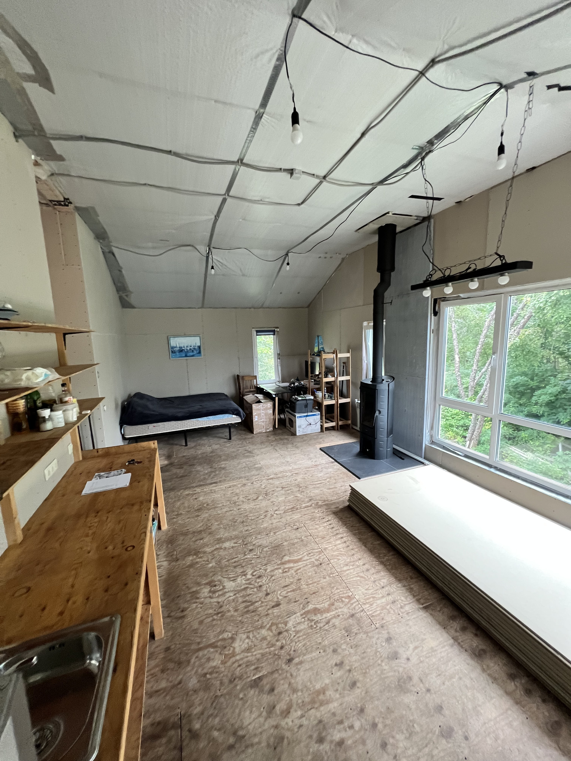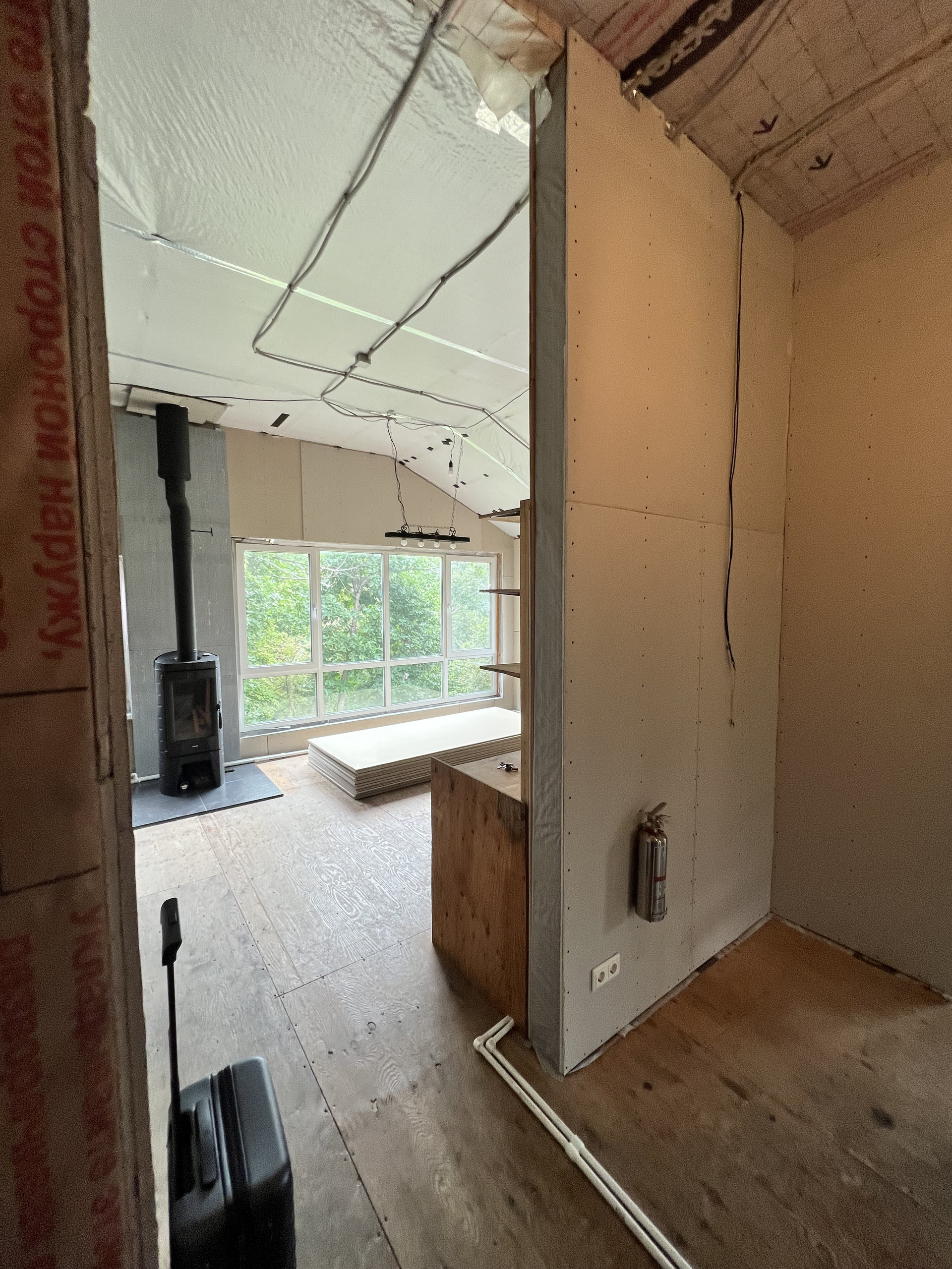 Из вложений - фасад (предварительную смету от финестры прикладываю) и отделка дома внутри. Второй этаж обшит гипсокартоном в два слоя, первый этаж просто утеплен минватой. Сделана электрика и временное отопление от дизельного котла, далее предполагалось, что он будет работать, как резервный котел, есть резервное питание от солнечных батарей.