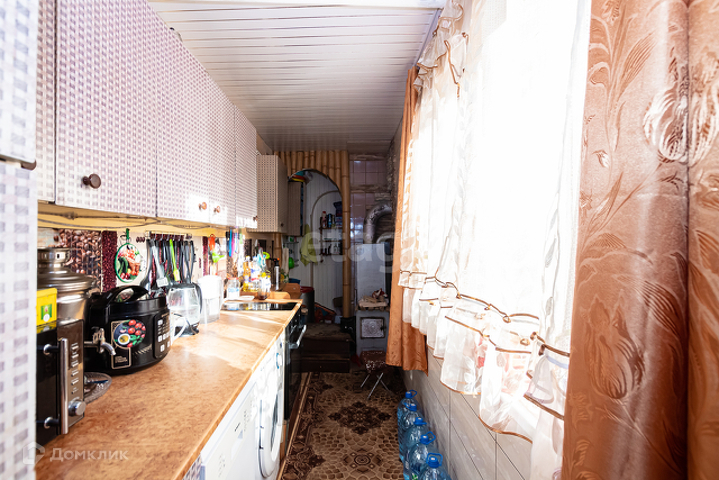 При входе в дом мы попадаем в небольшой коридор, который плавно переходит в кухонную зону с гарнитуром и необходимой техникой для приготовления пищи, здесь же располагается печь которая отапливает весь дом.