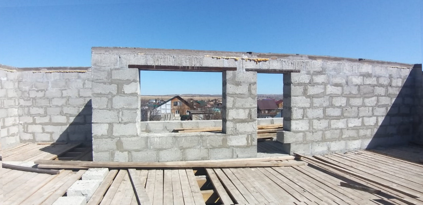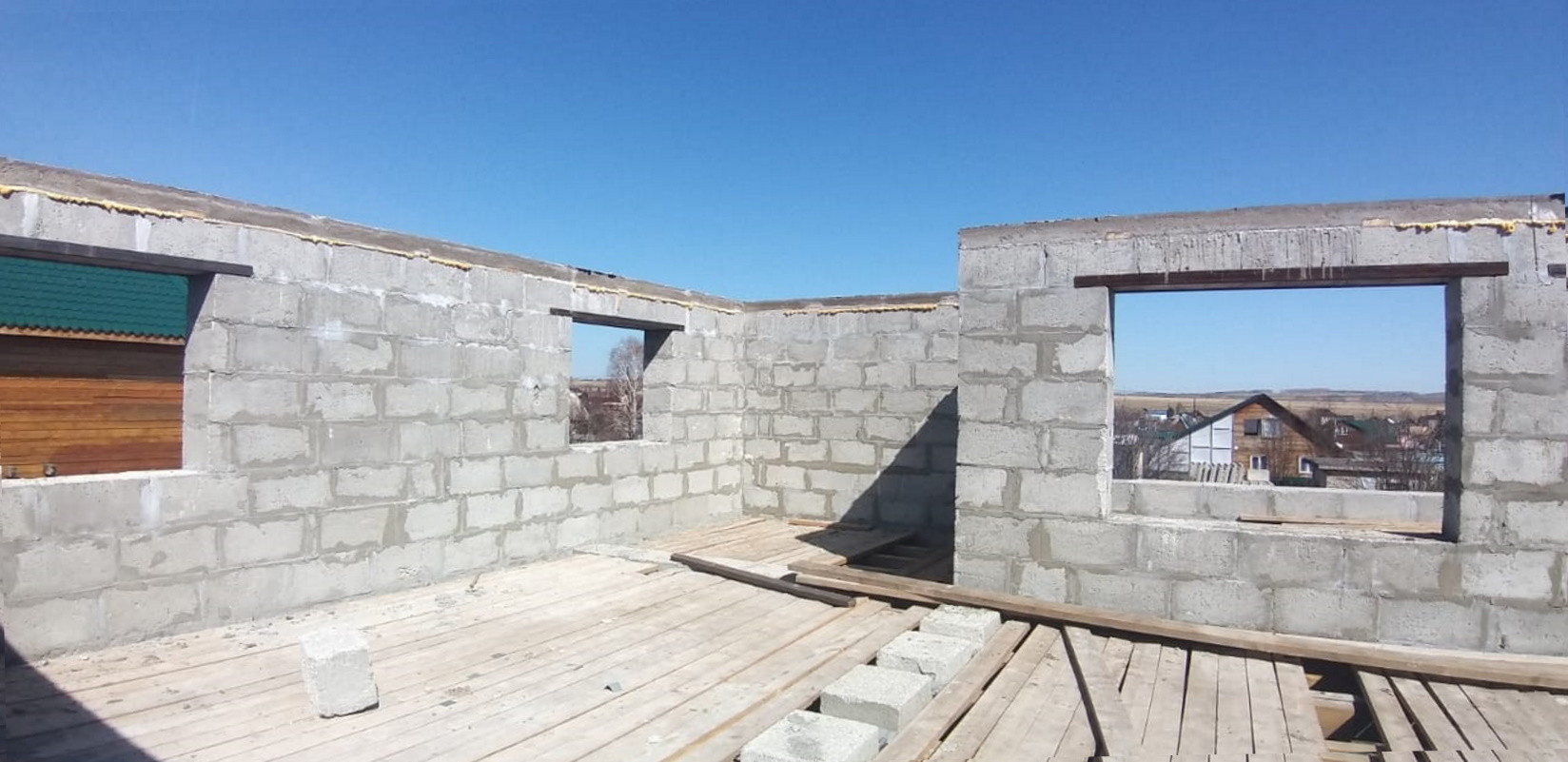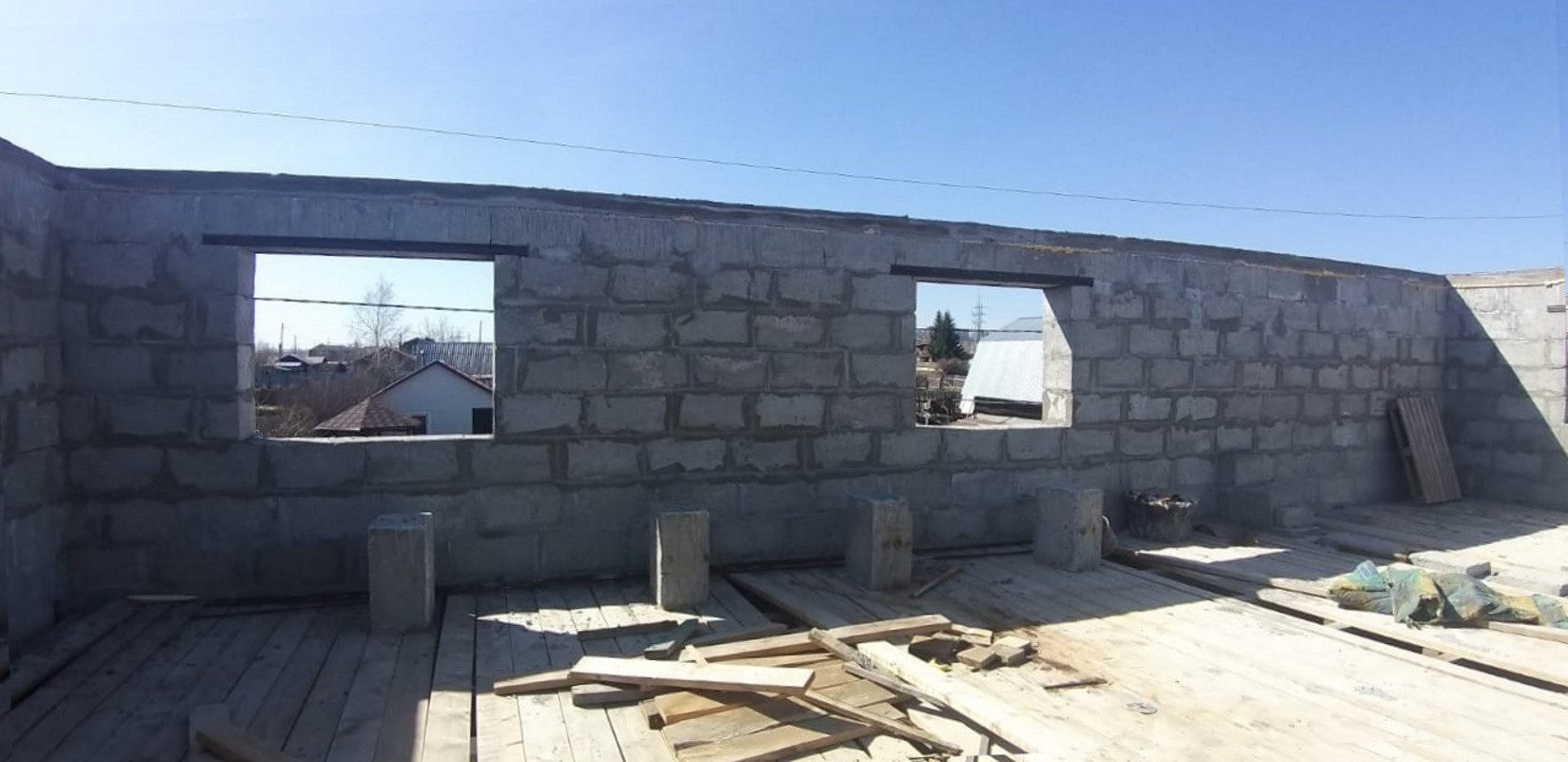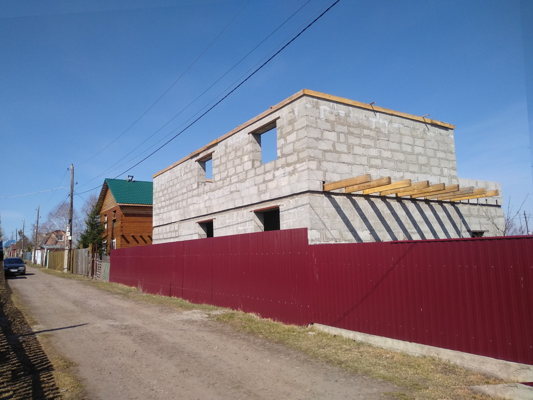 Дом 2 этажа. Стены из блоков полистирол-бетона. Влагостойкий, держит тепло. В процессе строительства. Для крыши доски в наличии. Преимущественно сосна. Летняя крытая веранда, брус. Септик. Электричество согласно ТУ. Летний водопровод. Дорожная доступность круглый год.