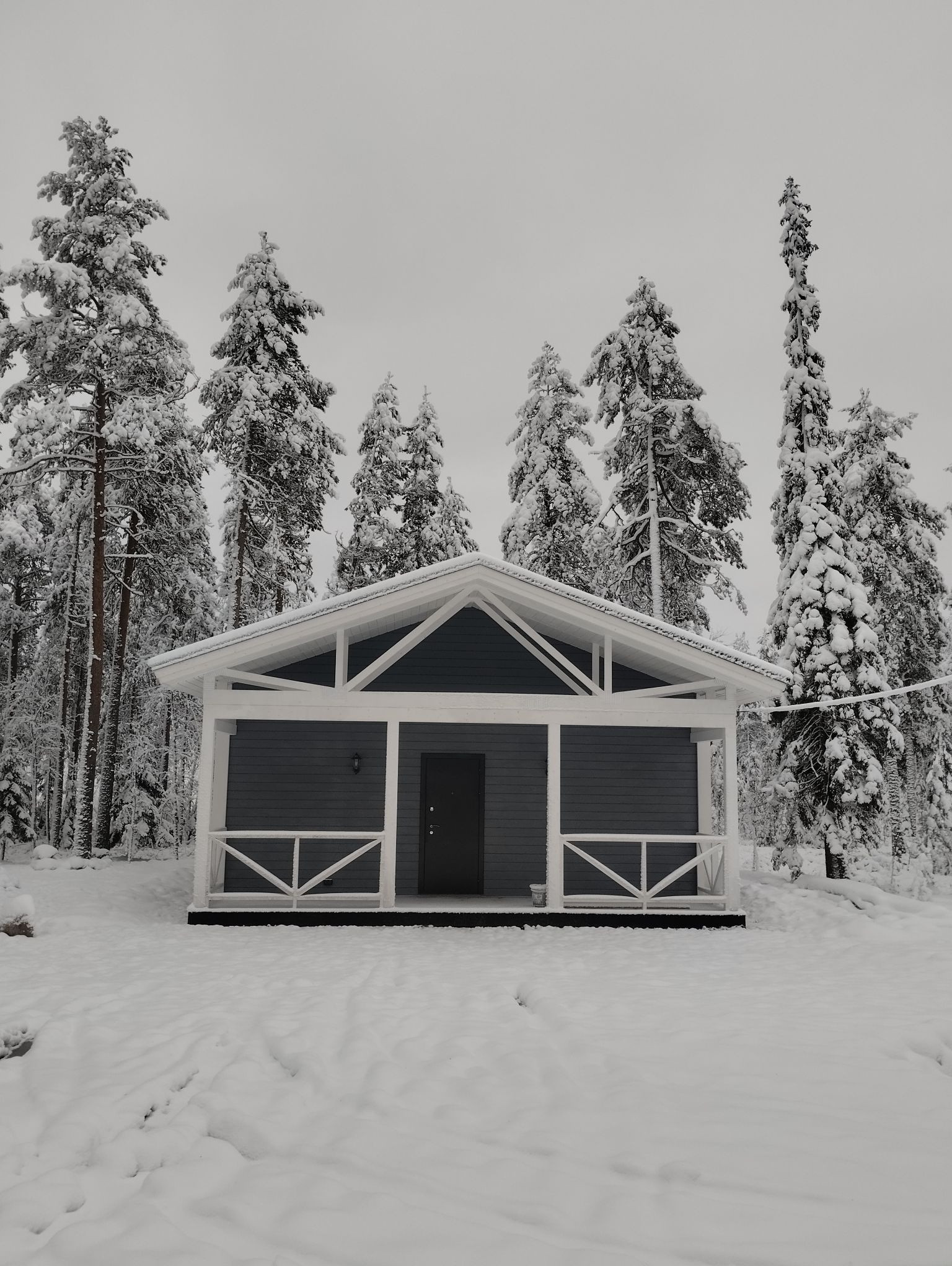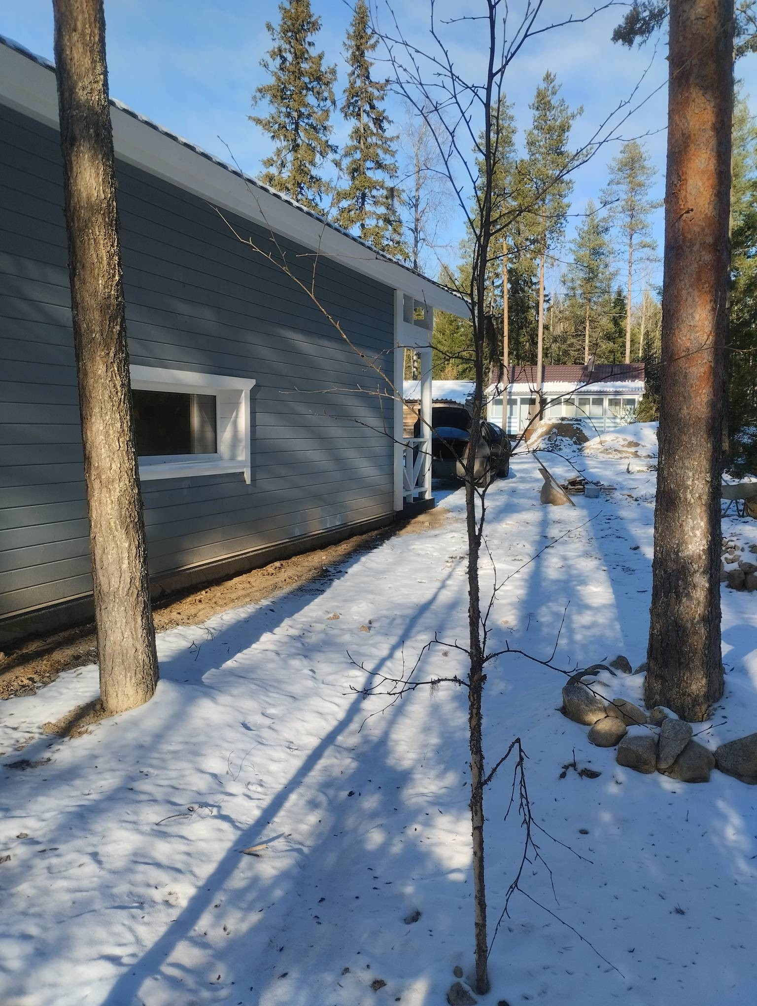 На участке остался частично нетронутым лес , с красивыми соснами и елями ,где растет брусника и черника . Здесь нет смысла полностью вычищать участок и создавать ландшафтный дизайн с нуля. При строительстве дома попытались максимально сохранить природу и сделать ее частью оформления придомовой территории.