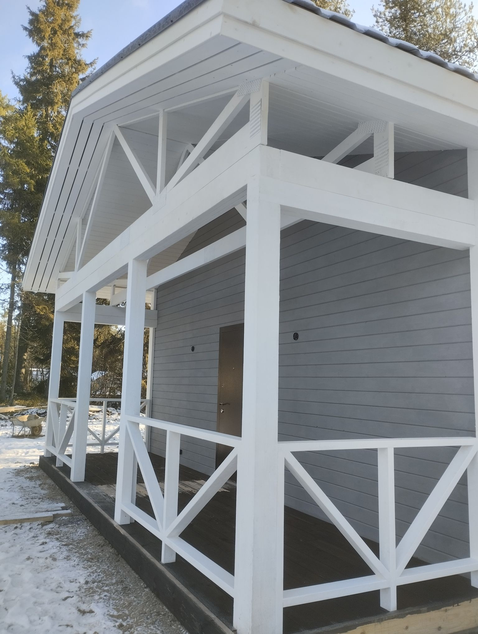 Перегородки выполнены из строганной экспортной доски.Фермы сделаны под заказ на заводе Карельский профиль.