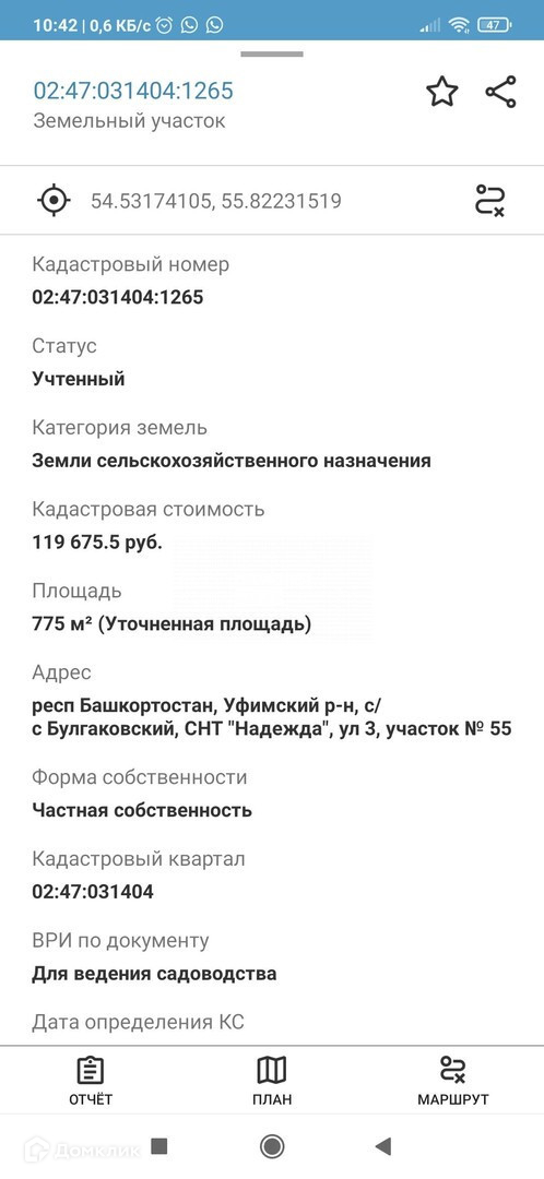 Арт. 72163424 Возможна покупка  по сниженной ставке! Земельный участок расположен в СНТ Надежда, С/С Булгаковский, Уфимского района.Прекрасное место расположение.Подойдет как для постоянного проживания, так и для сада.Соседи живут круглогодично.Охраняемая территория, на въезде шлагбаум.кадастровый номер 02:47:031404:1265Один взрослый собственник. «ООО «Самолет Плюс» (ОГРН 1067746757704) оказывает консультационные услуги по подбору программы кредитования, подходящей по условиям и требованиям к Клиенту, как к заемщику и к приобретаемому им объекту недвижимости. Конкретные условия зависят от банка, программы кредитования и иных требований.»Звоните! Записывайтесь на показ объекта прямо сейчас. Рады будем ответить на все ваши вопросы.