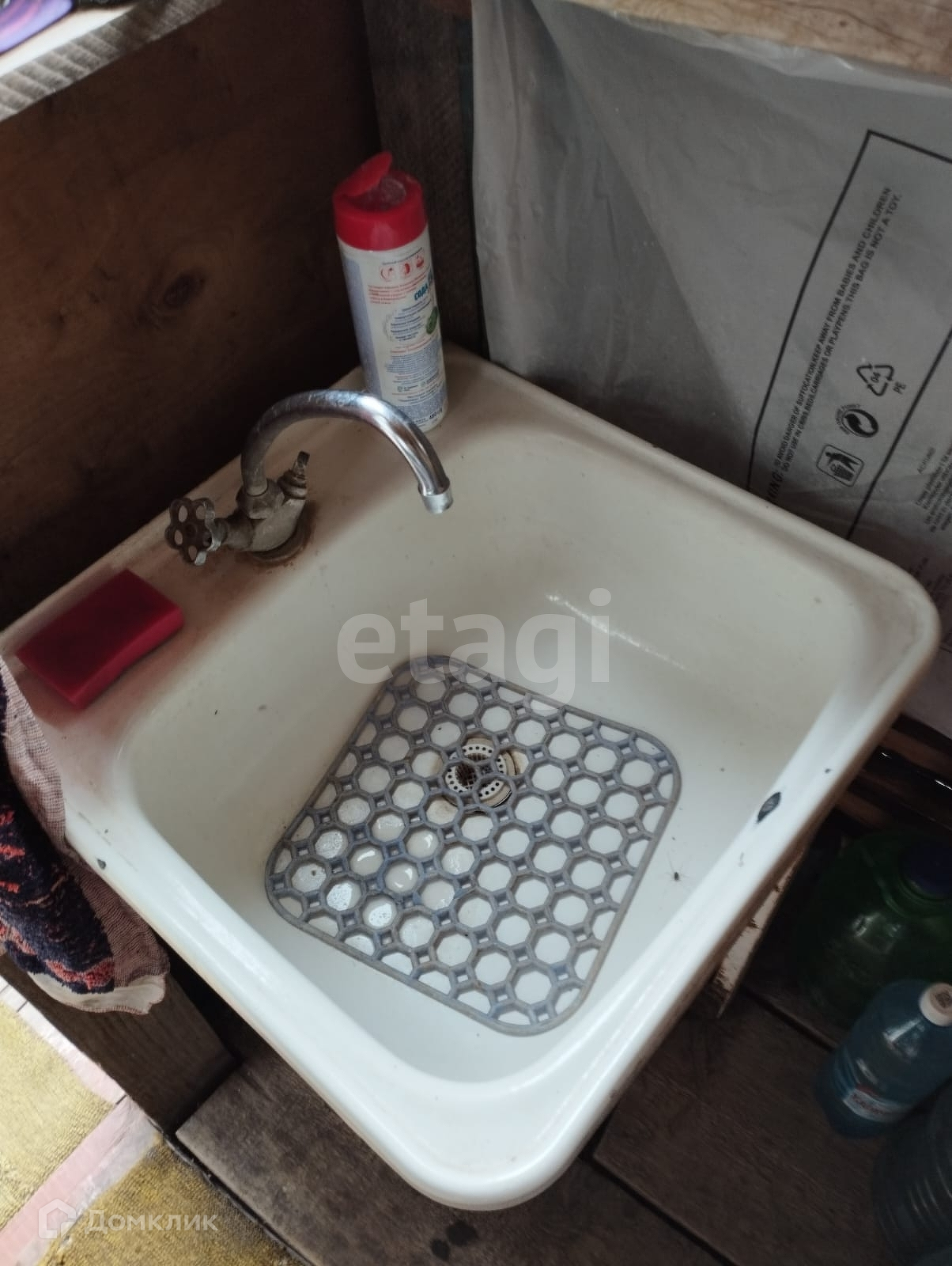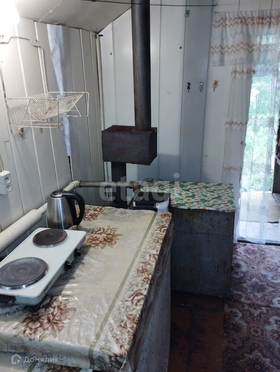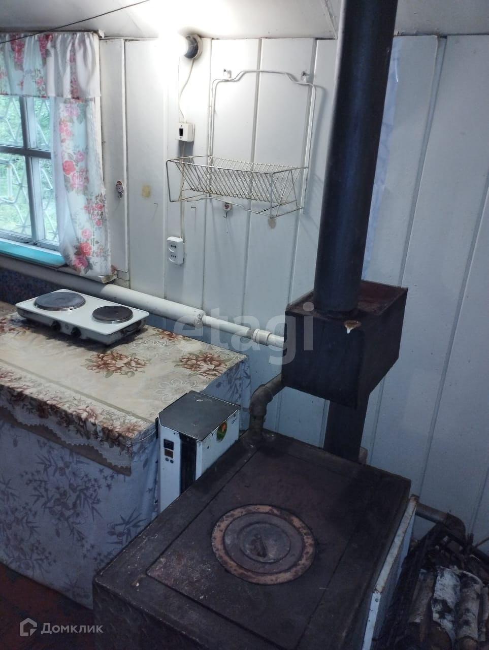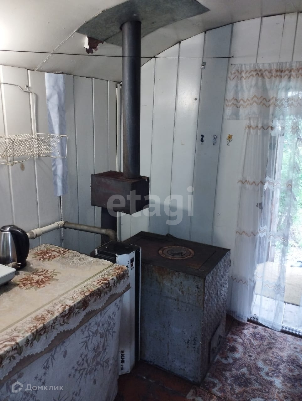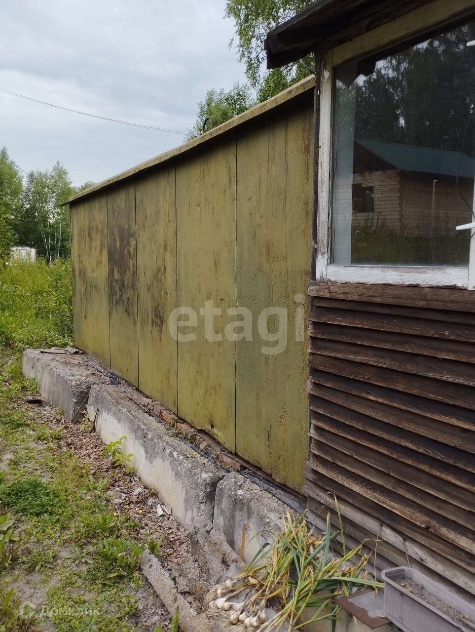Дом: строительная бытовка с верандой, фундамент из бетонных блоков. В доме есть печь и проведено водяное отопление.На веранде установлена раковина, заведена вода, есть слив.