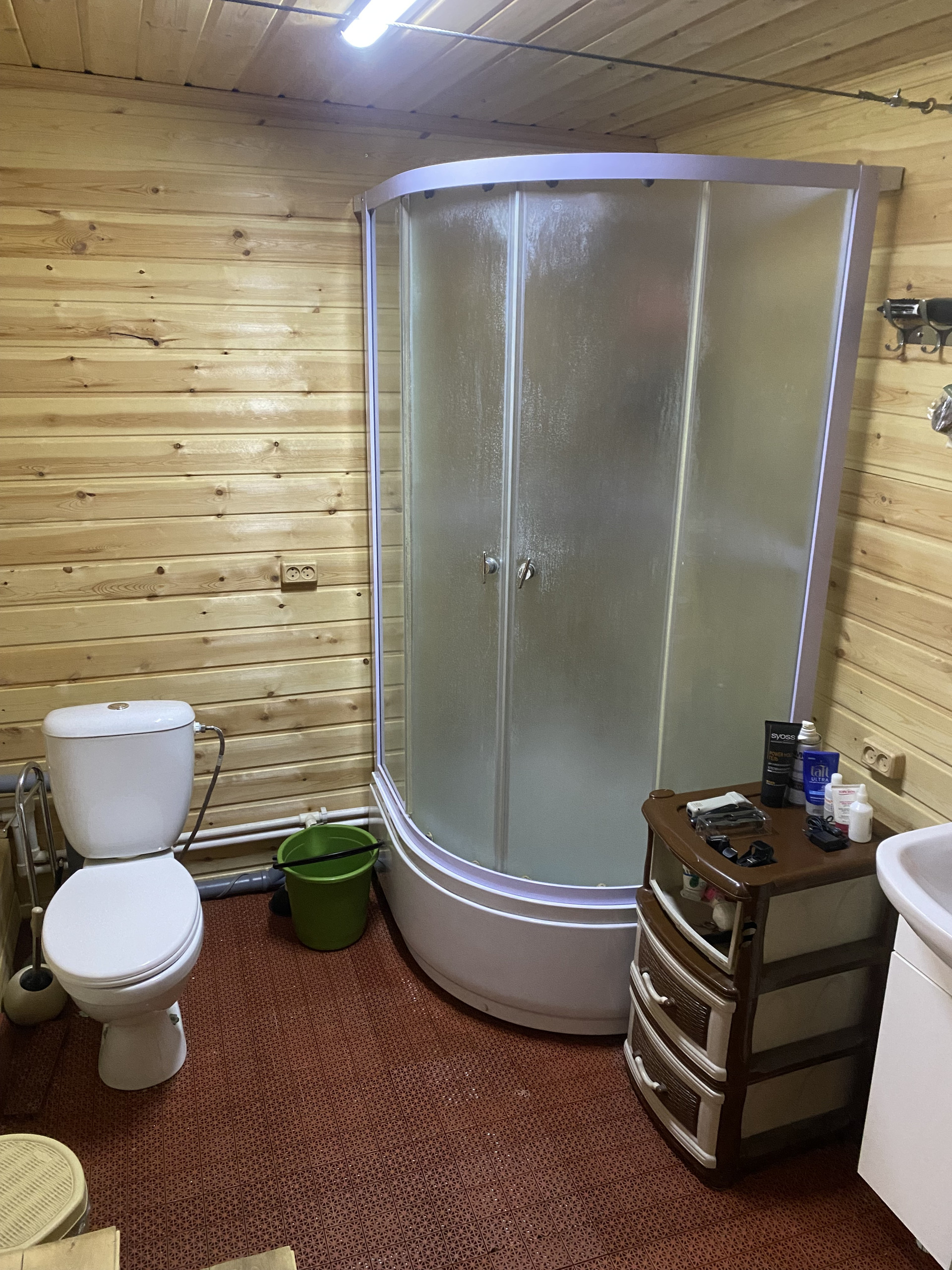 Санузел находится в доме - скважина, канализация, душевая кабина, унитаз, раковина, насос, бойлер.