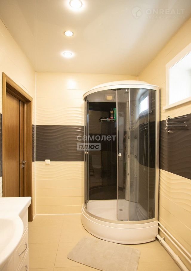 Современный санузел с душевой кабиной, унитазом и раковиной.
