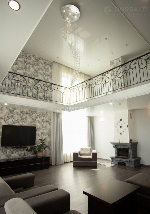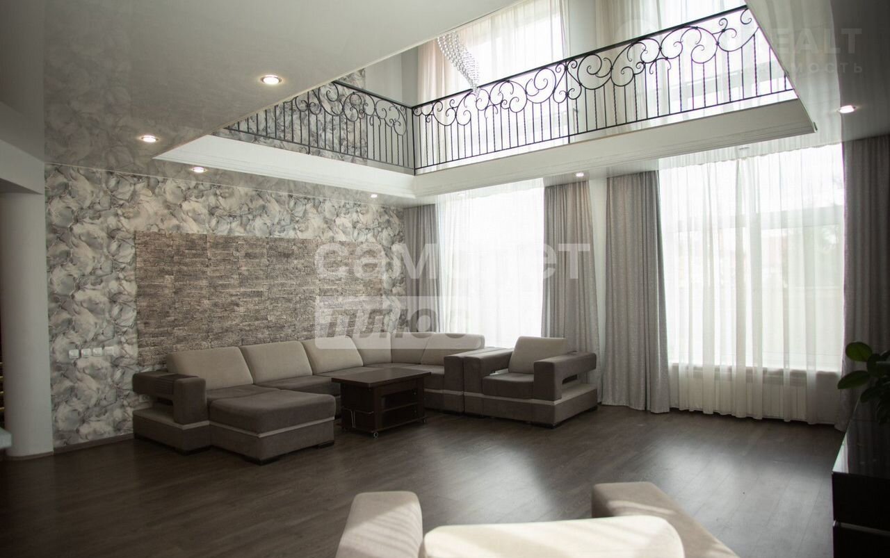 Просторная гостиная с высокими потолками (в два этажа), создающая ощущение свободы и роскоши.