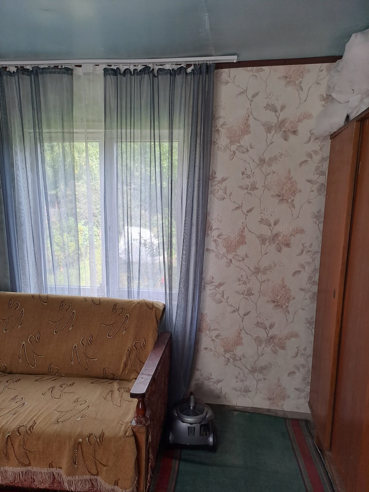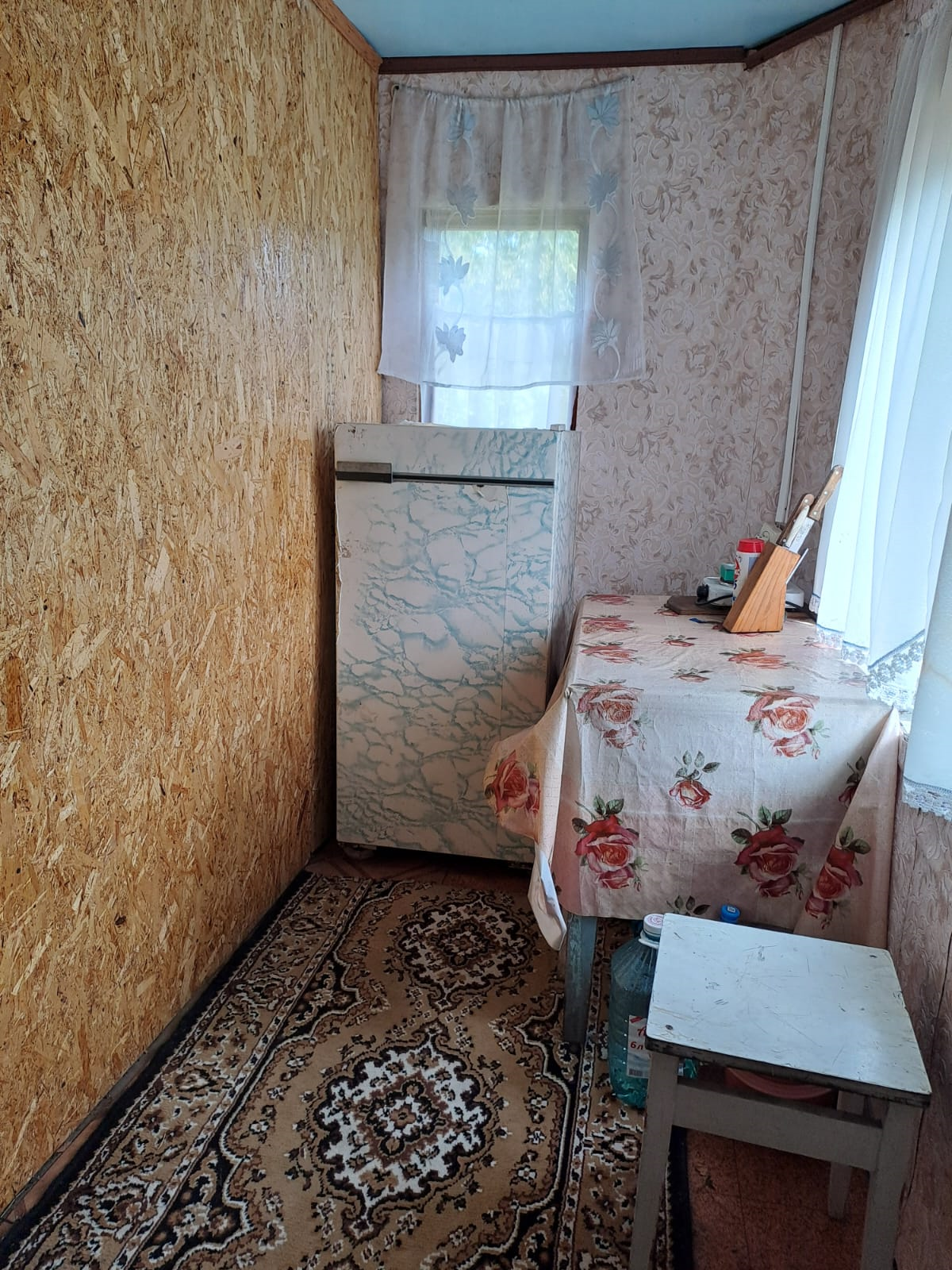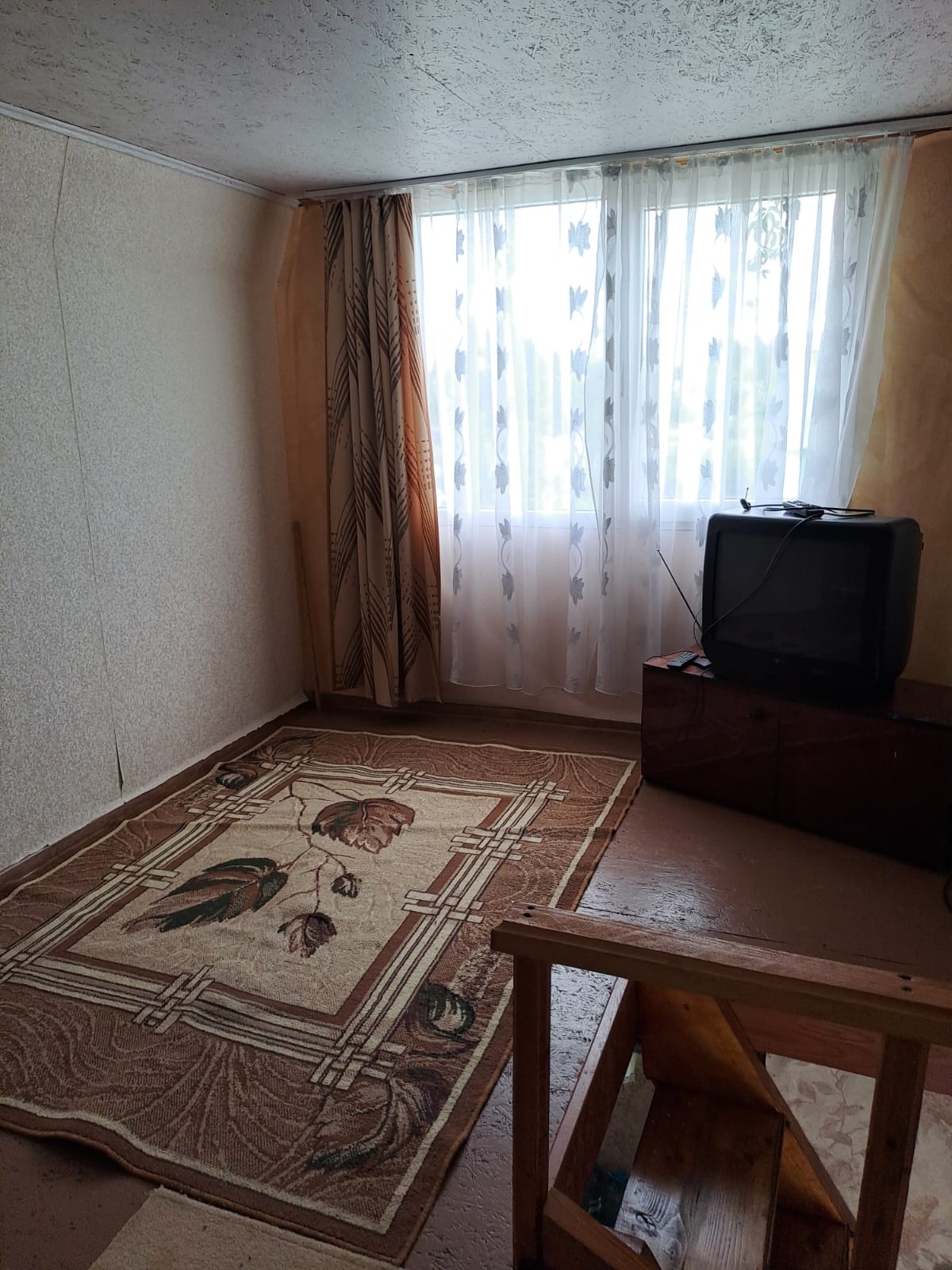 На первом этаже кухонька и комната для отдыха,окна дерево.