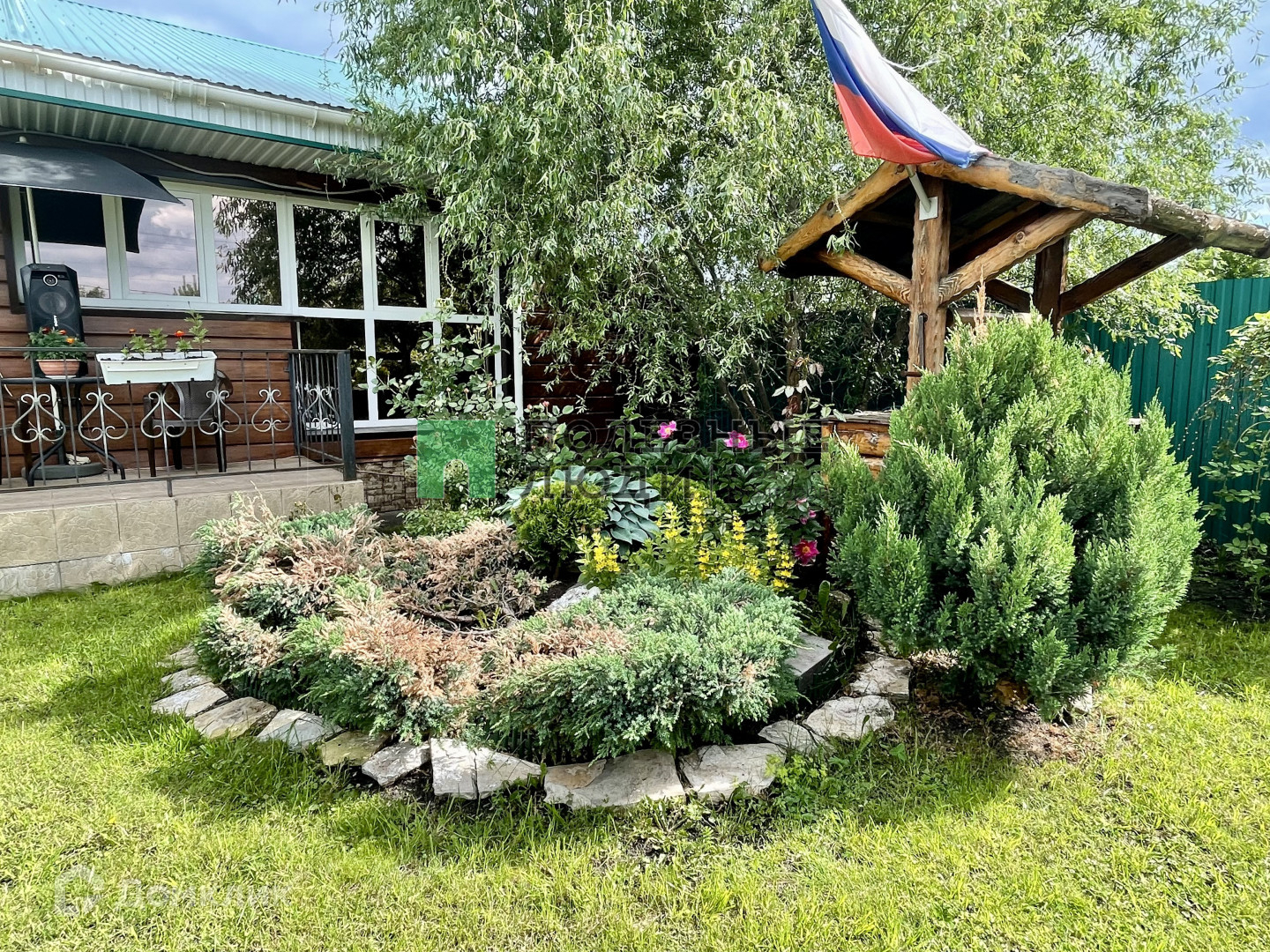 Снаружи дом оснащен фасадными светильниками и дюралайтовыми гирляндами, яркой светодиодной подсветкой по периметру и удобным входным крыльцом, гармонично размещен Альпийский уголок на участке. Участок огорожен, выровнен и очищен, даже приподнят; забетонированы и выложены камнем аккуратные дорожки;