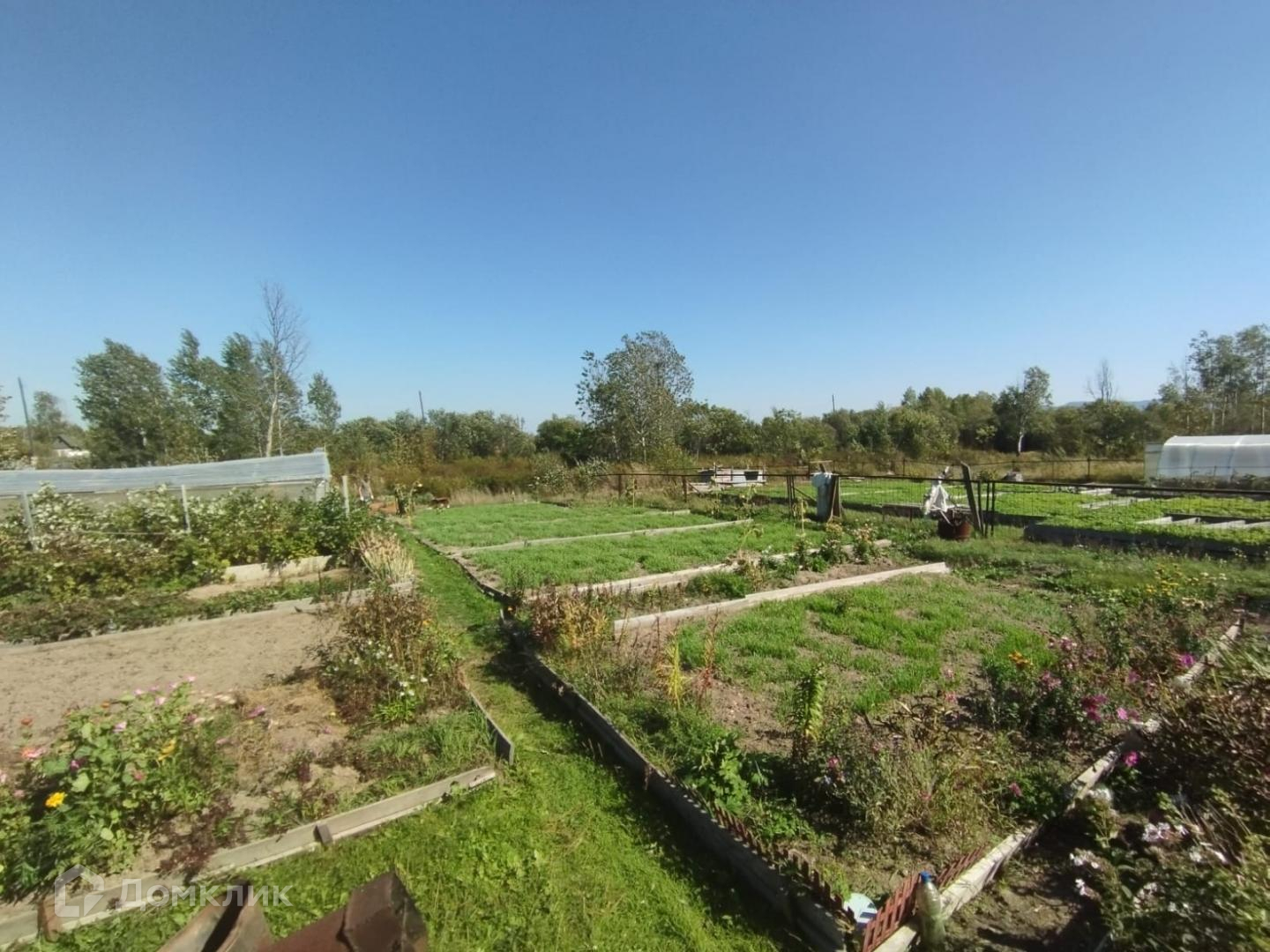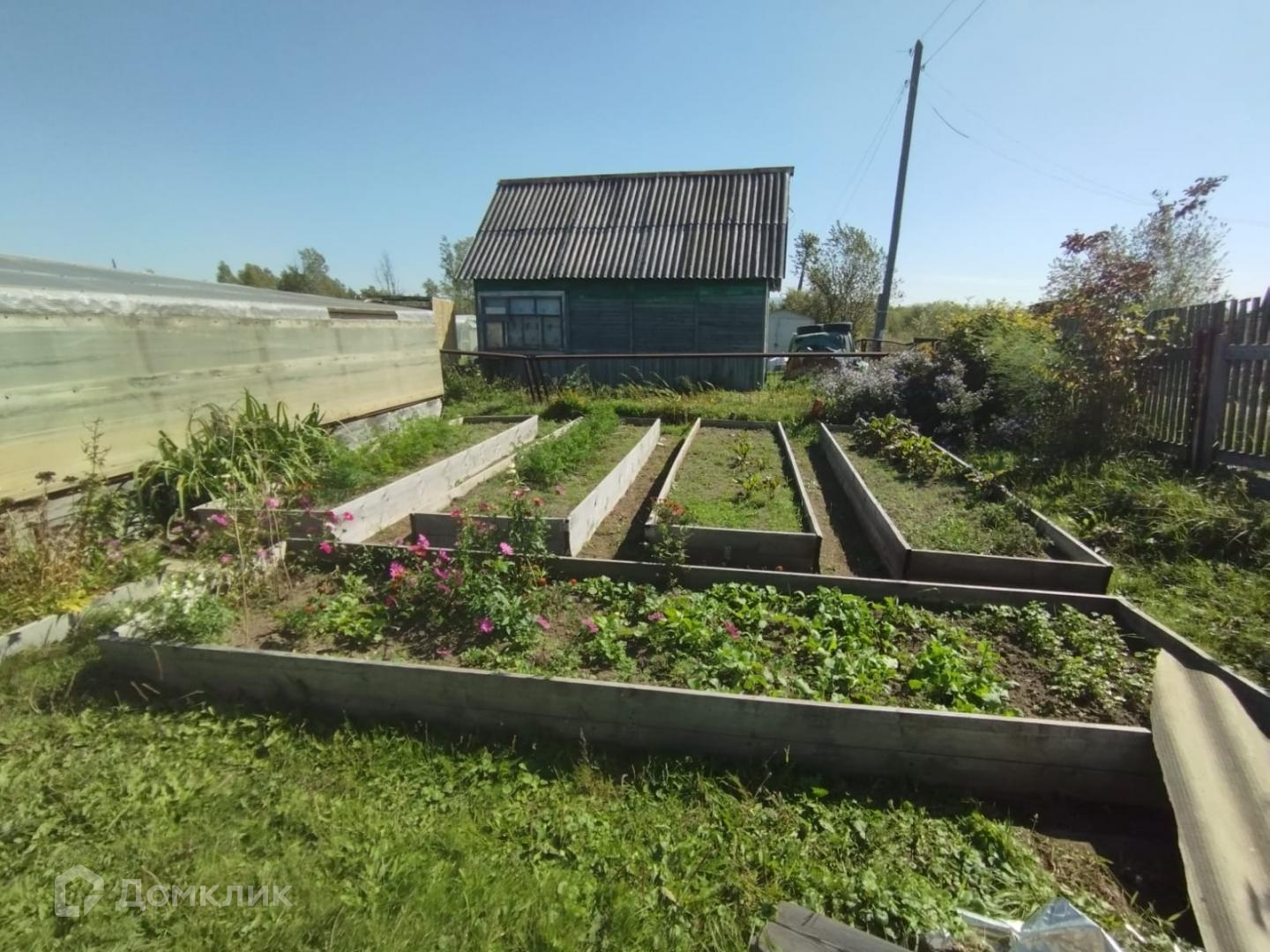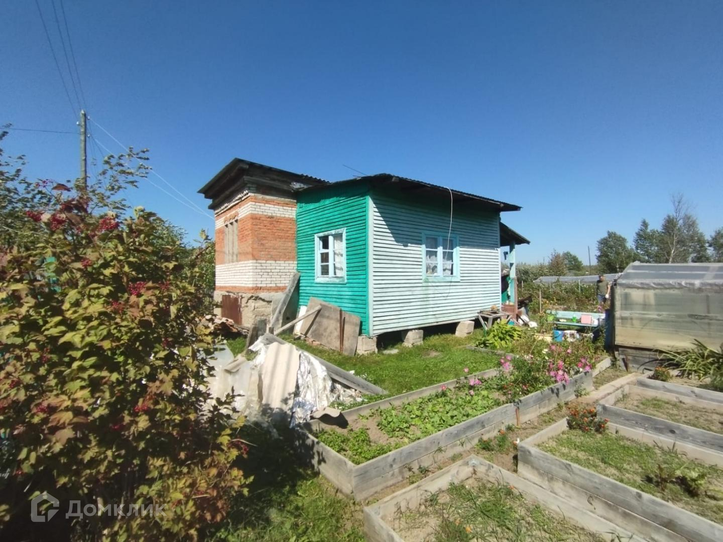 На участке находится: кирпичный дом с деревянной пристройкой. Перед домом зеленая зона для отдыха. Также имеются 2 теплицы, аккуратные грядки, окантованные доской, сарайка под инвентарь, металлическая емкость для полива.