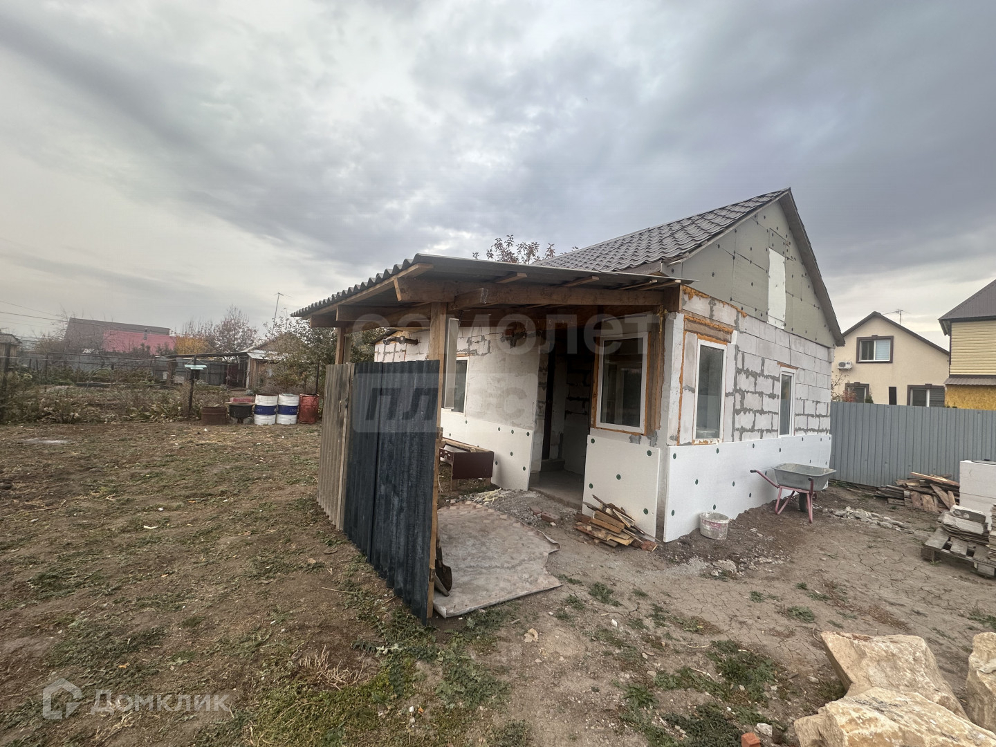 На участке расположен дом, туалет, фундамент для еще одного дома.
