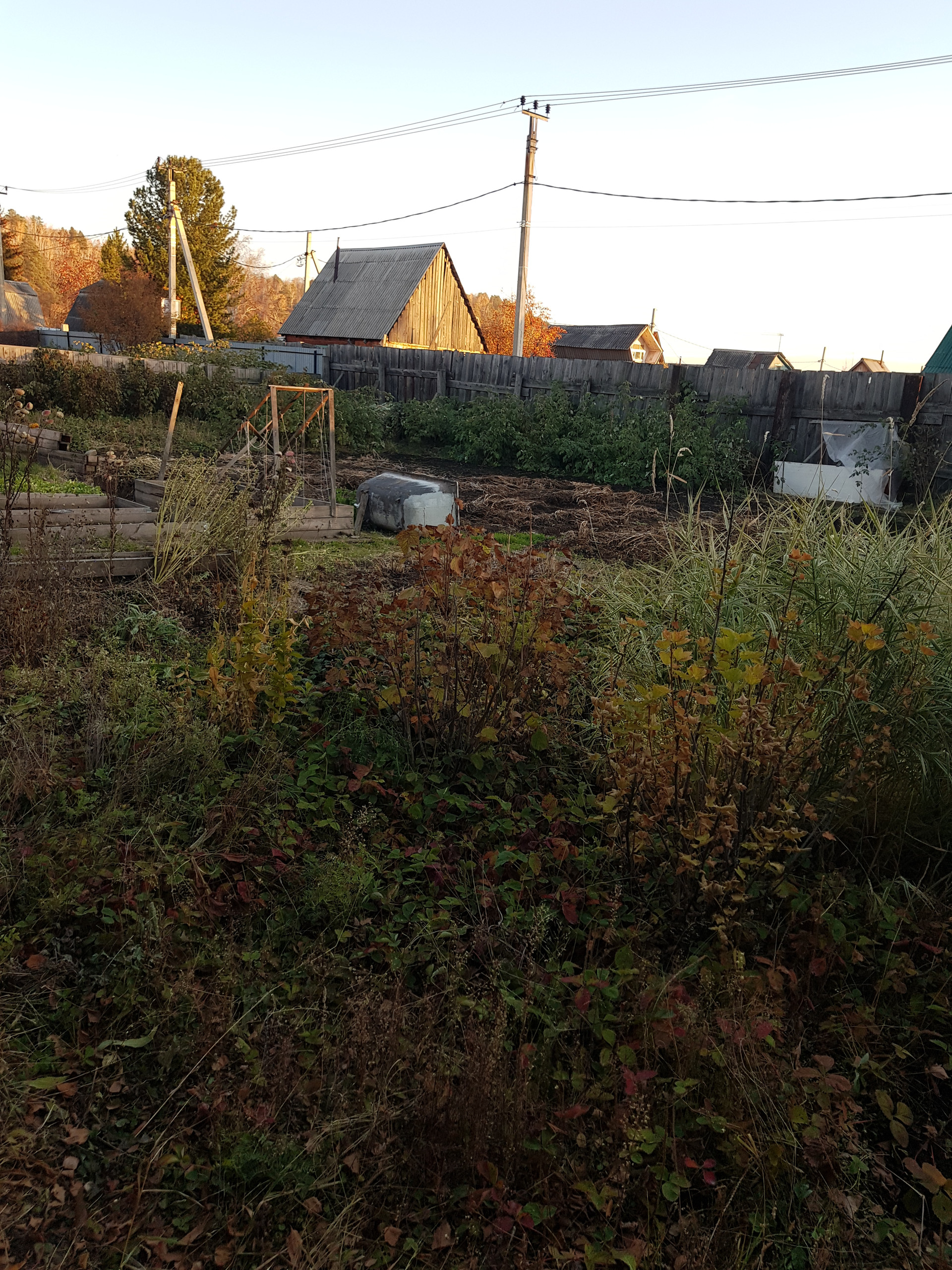 Участок ровный, огорожен, разработан, много насаждений (жимолость, клубника, вишня, смородина, облепиха, слива), скважина, летний душ, гараж.