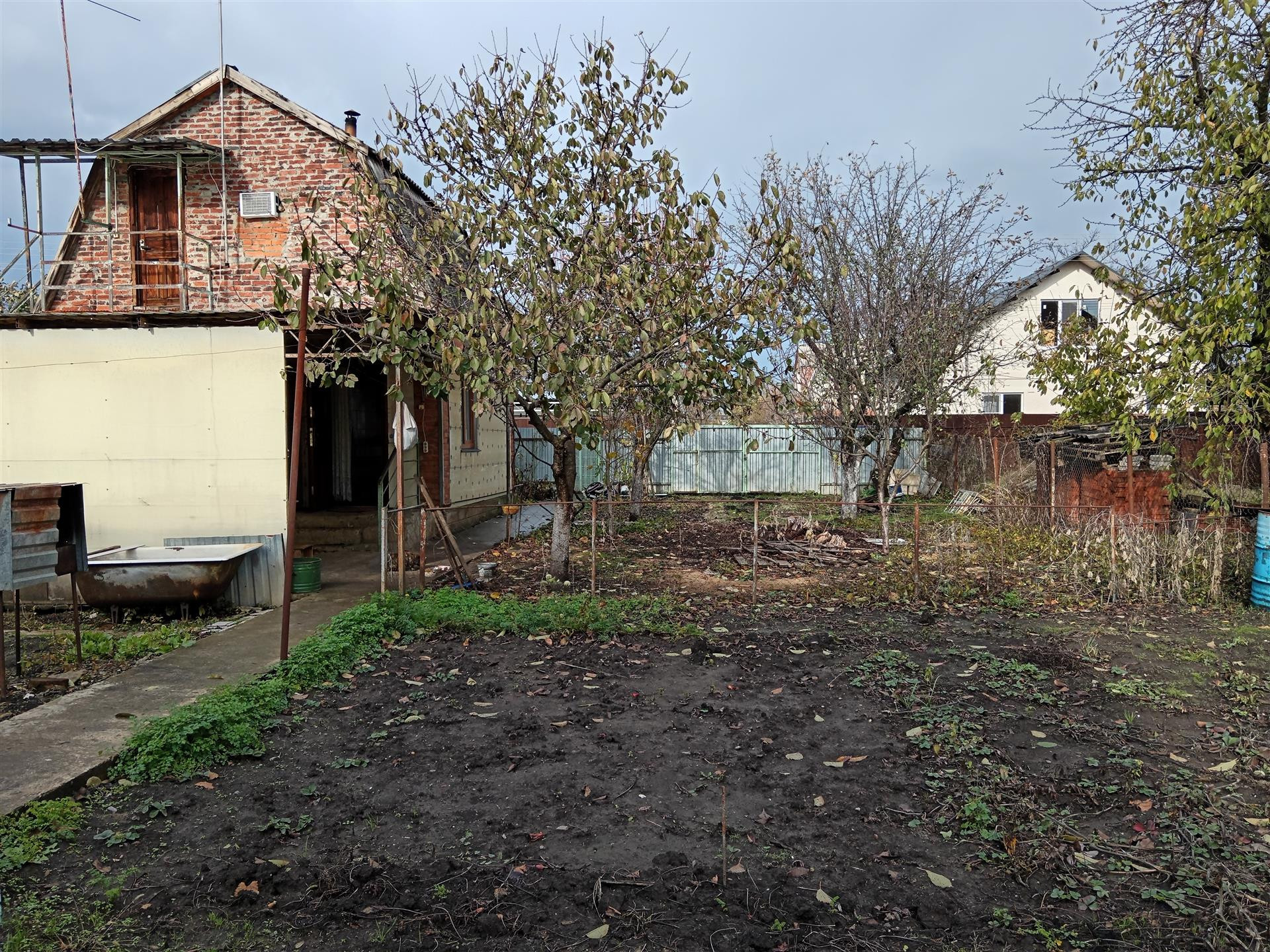 Земля на участке плодородная,сам участок ухожен,посажены фруктовые деревья и кустарники.Выход из дома защищен большим навесом,где можно семьей проводить уютные вечера,туда же выведена вода из скважины, установлена раковина и водонагреватель.